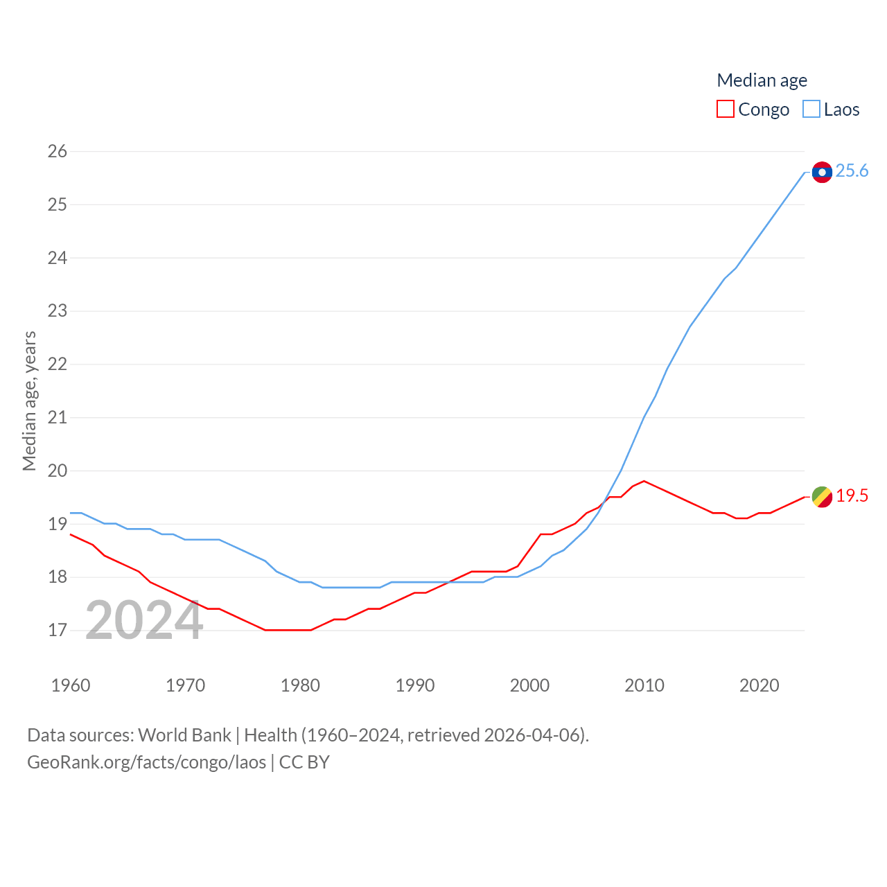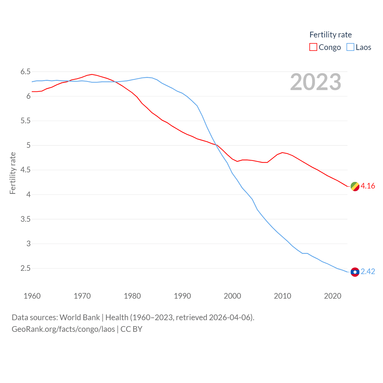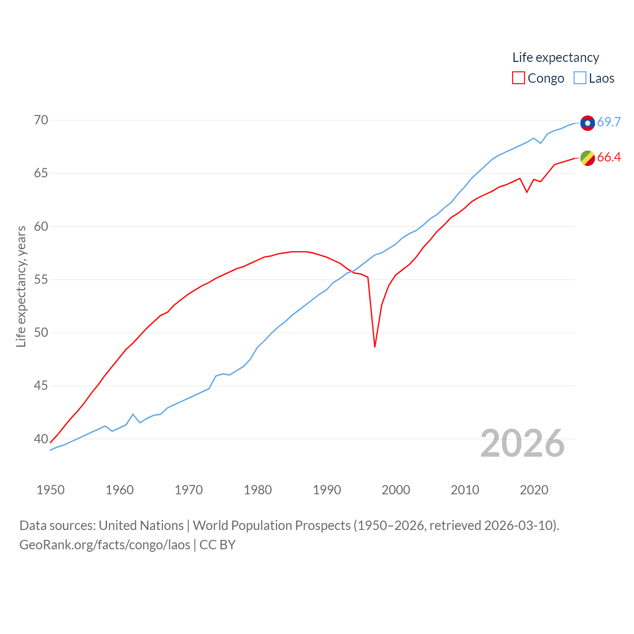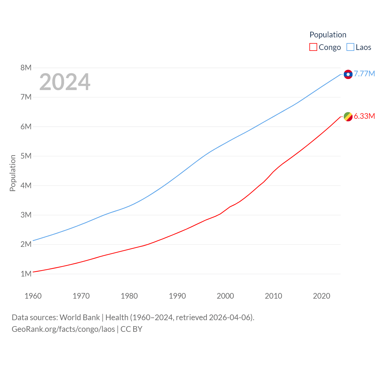 The Congo has a population of 6.33M (ranked 112/197), compared with 7.77M in Laos (ranked 103/197). The Congo's land area is 131,854 sq mi versus 89,112 sq mi for Laos (ranked 64th vs. 79th).