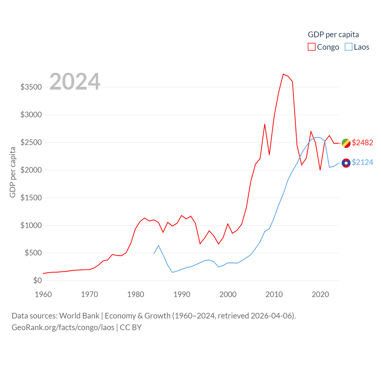 By GDP, The Congo ranks 141/197 ($15.7B) and Laos ranks 139/197 ($16.5B). By GDP per capita, The Congo ranks 149/197 ($2,482), while Laos ranks 155/197 ($2,124).