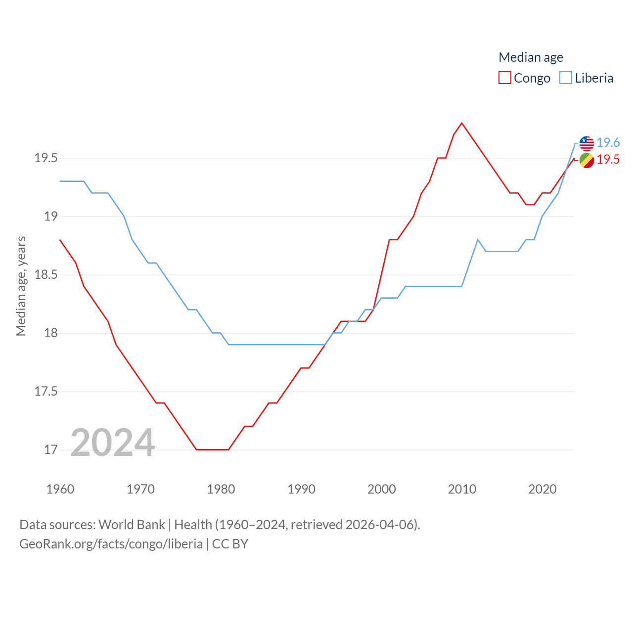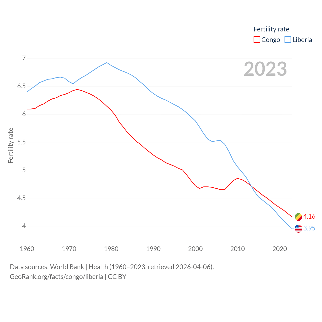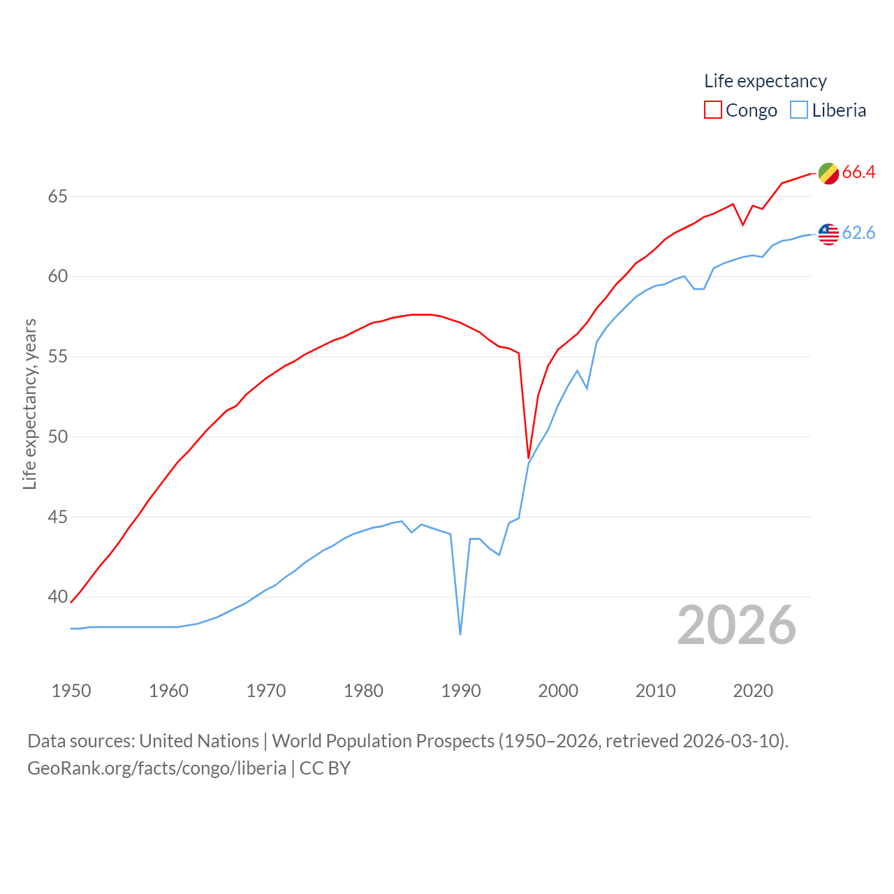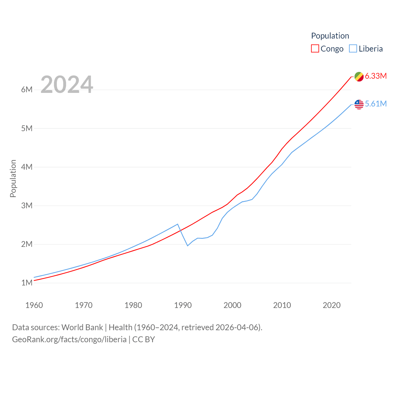 The Congo has a population of 6.33M (ranked 112/197), compared with 5.61M in Liberia (ranked 117/197). The Congo's land area is 131,854 sq mi versus 37,189 sq mi for Liberia (ranked 64th vs. 106th).