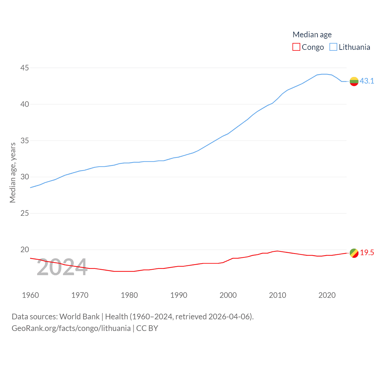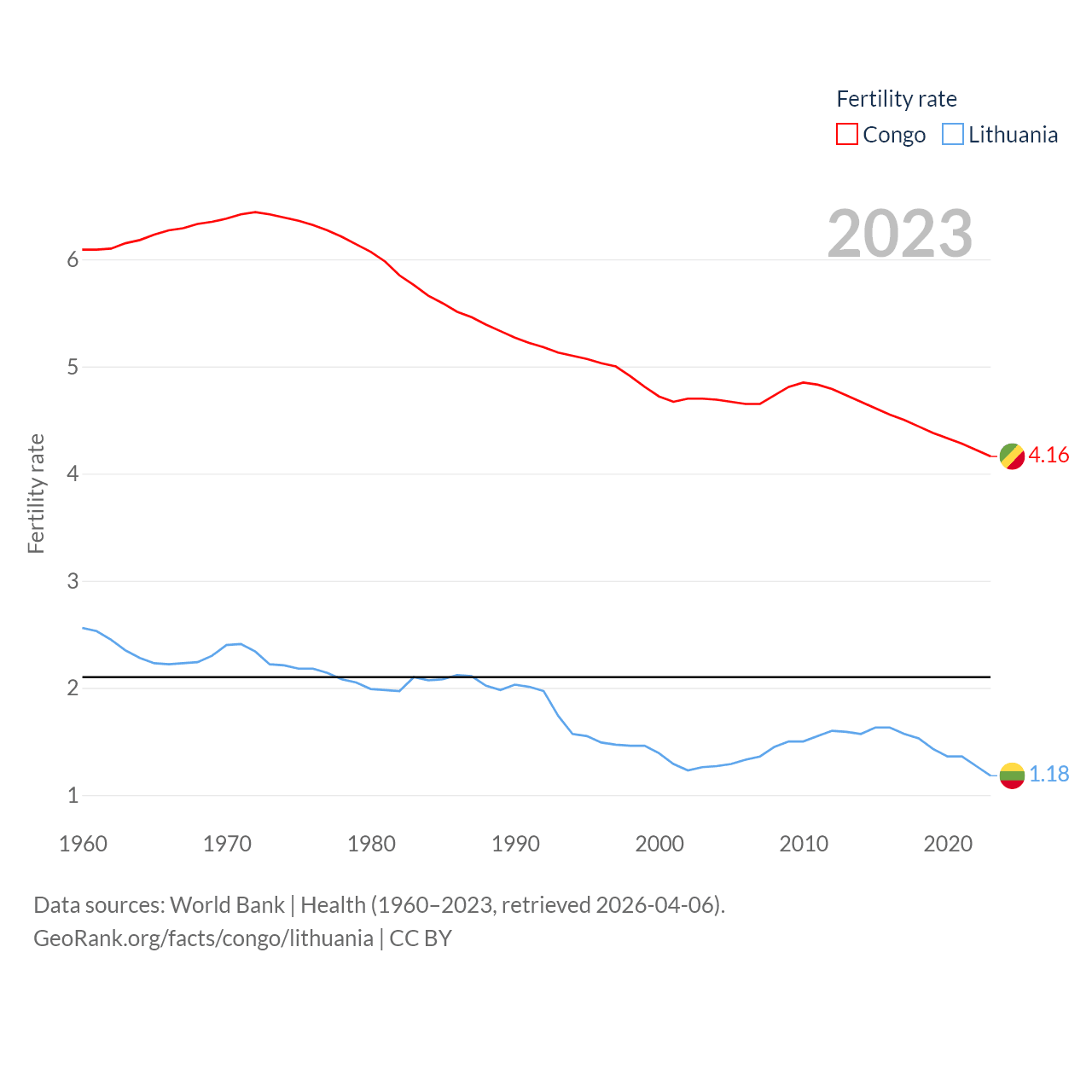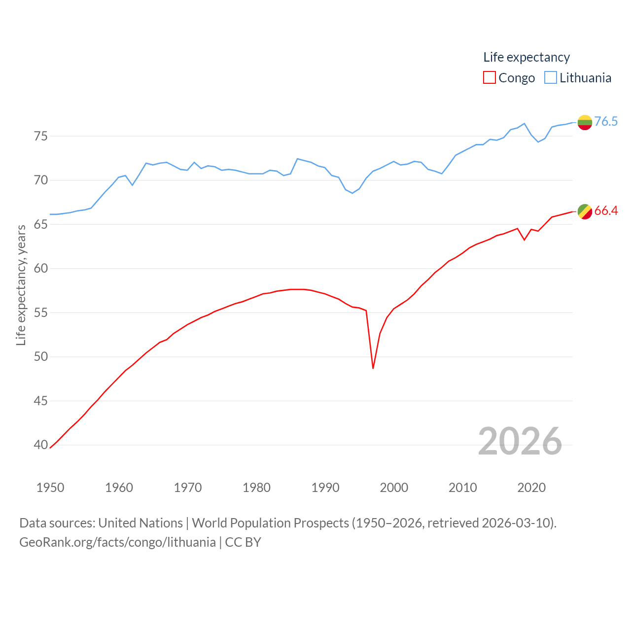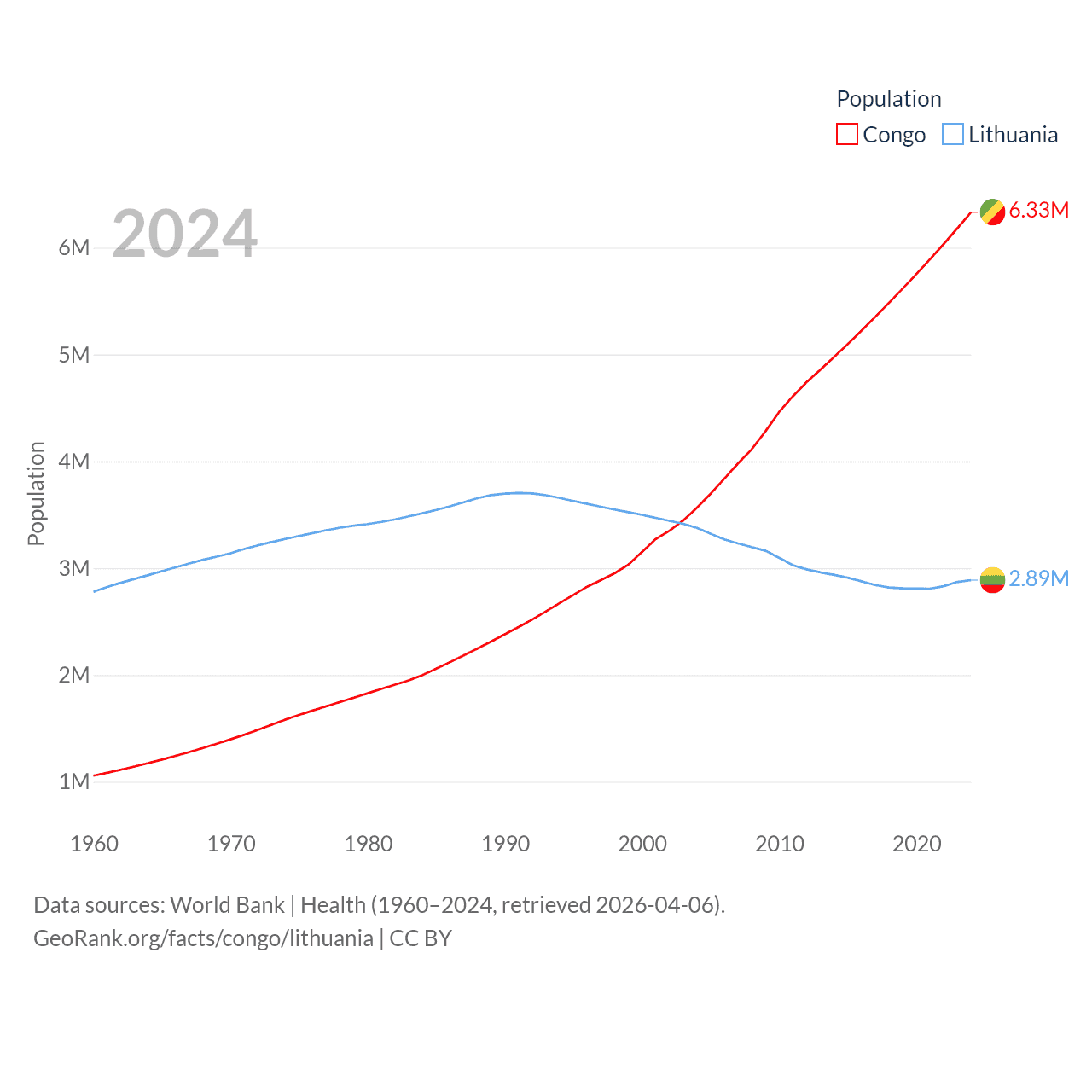 The Congo has a population of 6.33M (ranked 112/197), compared with 2.89M in Lithuania (ranked 137/197). The Congo's land area is 131,854 sq mi versus 24,170 sq mi for Lithuania (ranked 64th vs. 120th).