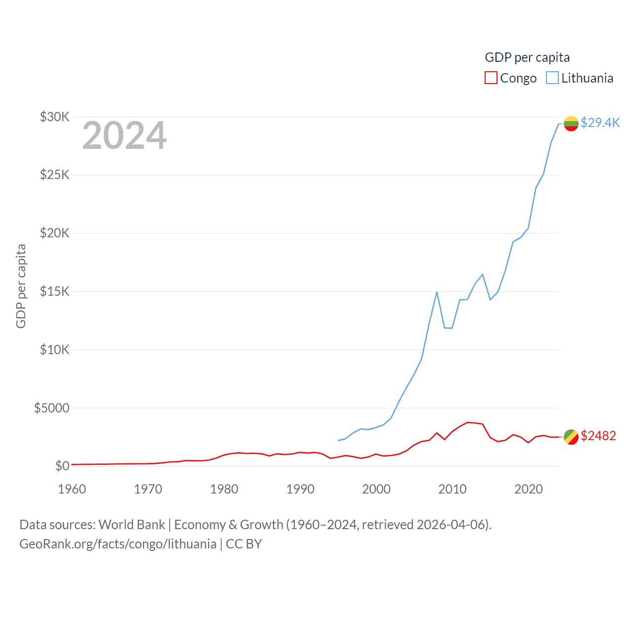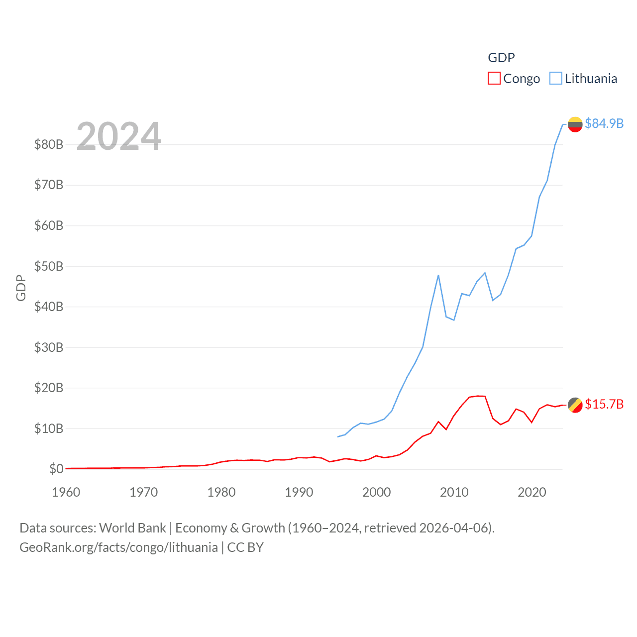 By GDP, The Congo ranks 141/197 ($15.7B) and Lithuania ranks 79/197 ($84.9B). By GDP per capita, The Congo ranks 149/197 ($2,482), while Lithuania ranks 43/197 ($29,384).