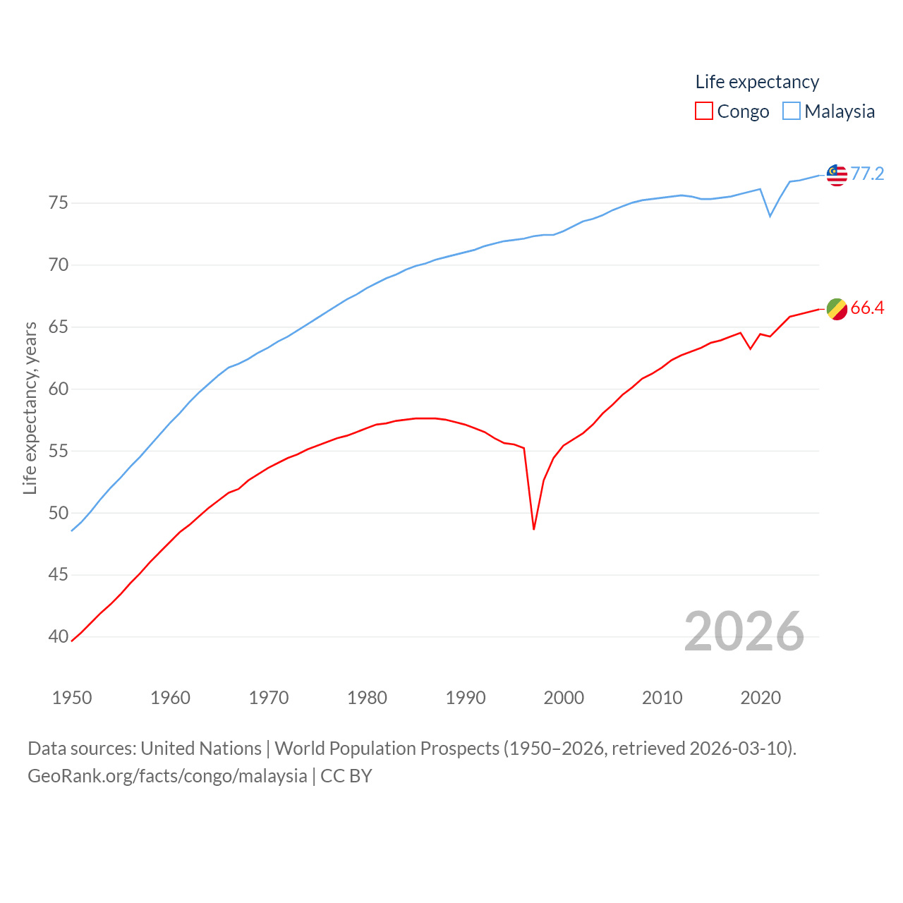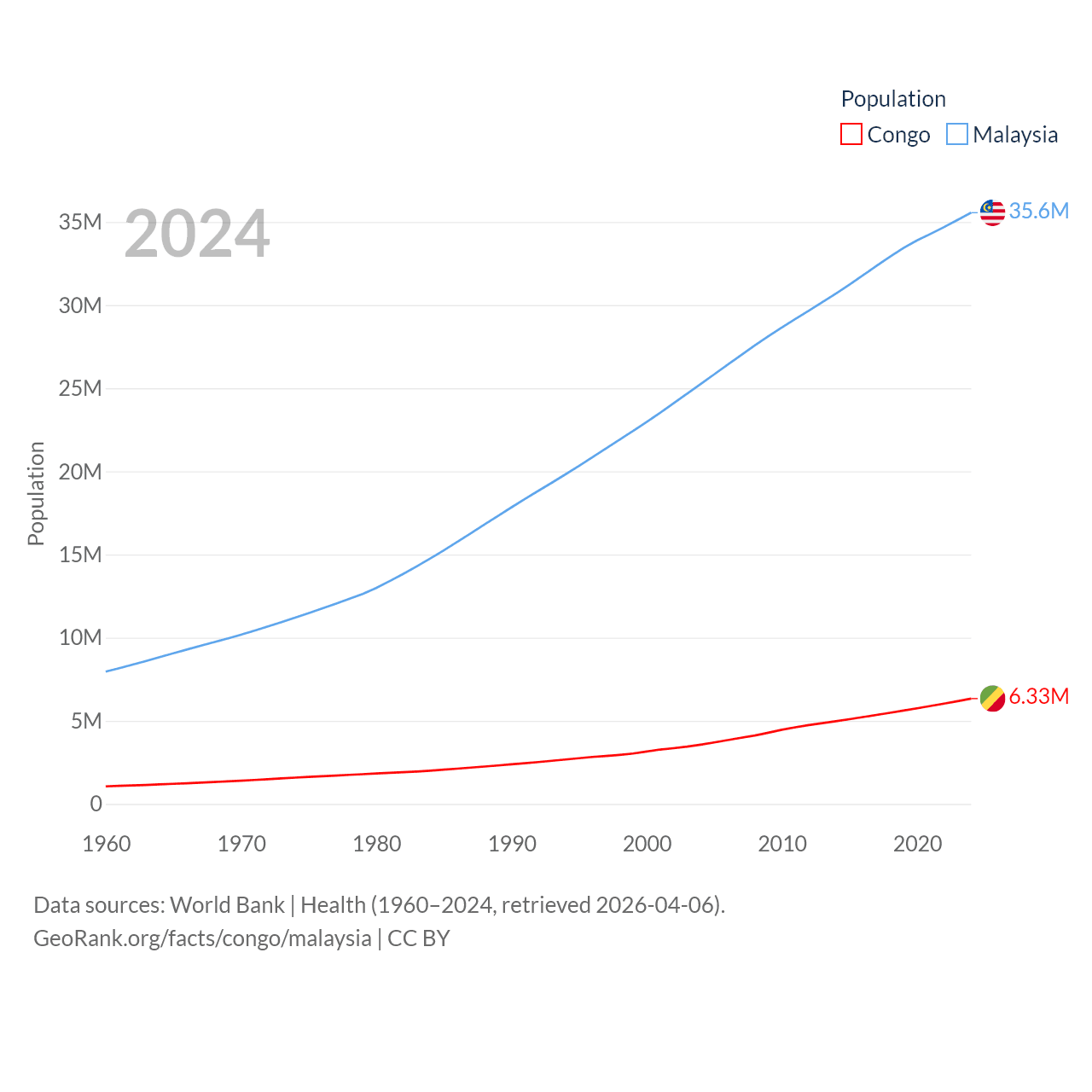 The Congo has a population of 6.33M (ranked 112/197), compared with 35.6M in Malaysia (ranked 44/197). The Congo's land area is 131,854 sq mi versus 126,854 sq mi for Malaysia (ranked 64th vs. 65th).
