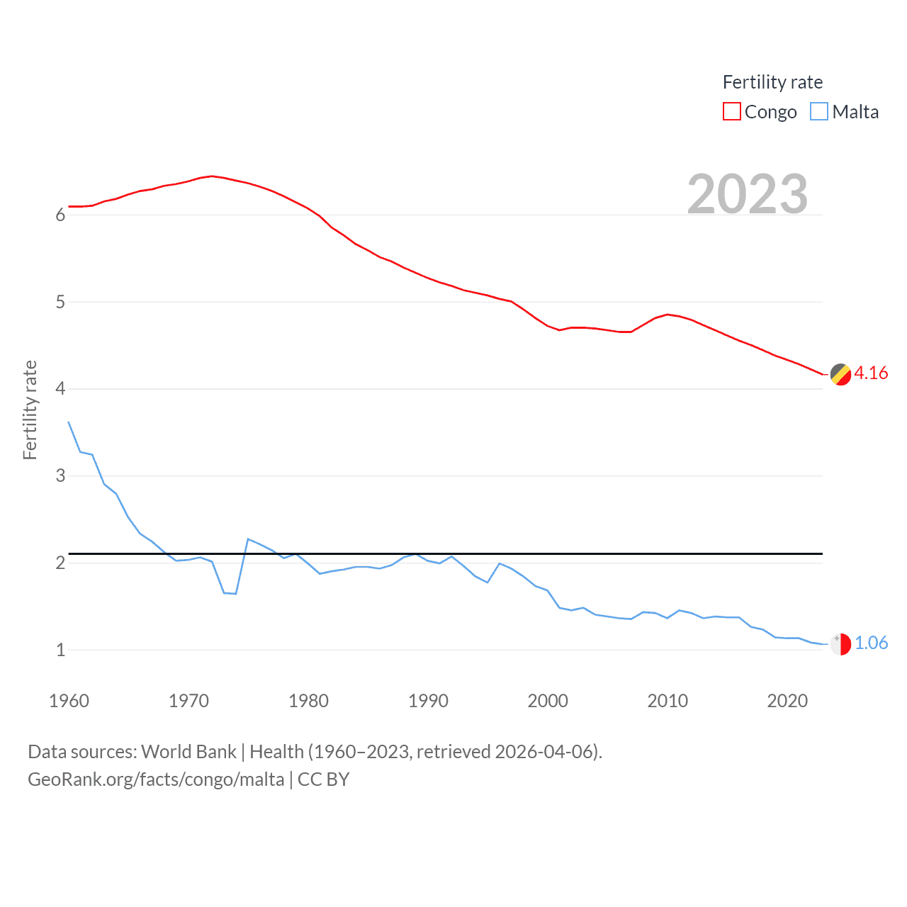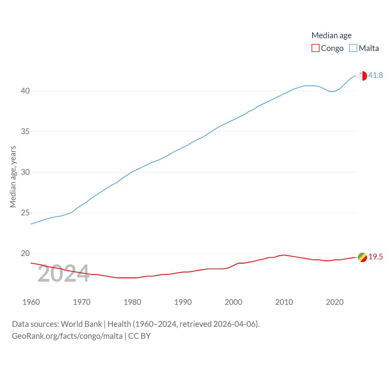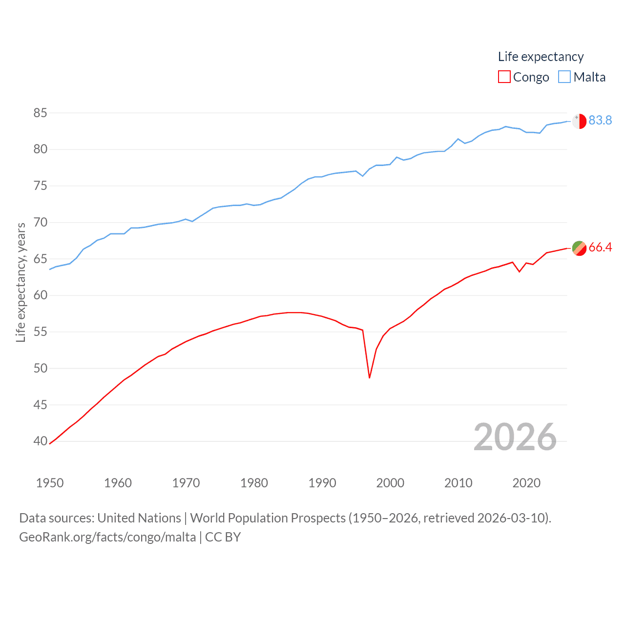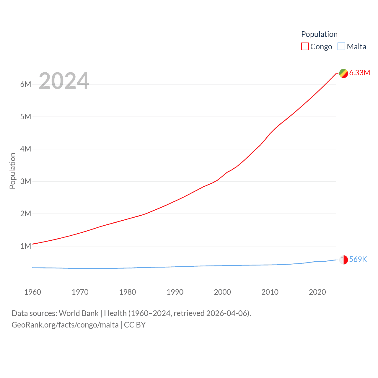 The Congo has a population of 6.33M (ranked 112/197), compared with 569K in Malta (ranked 167/197). The Congo's land area is 131,854 sq mi versus 123.6 sq mi for Malta (ranked 64th vs. 187th).