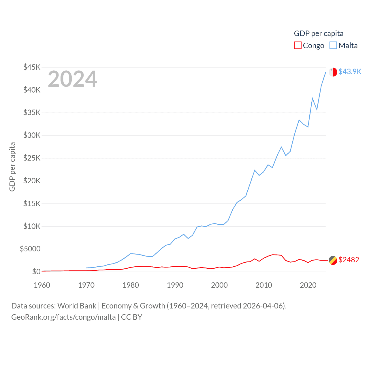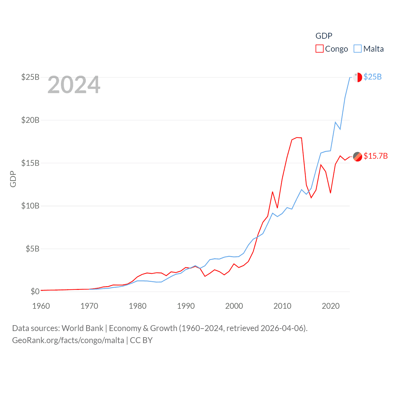 By GDP, The Congo ranks 141/197 ($15.7B) and Malta ranks 119/197 ($25B). By GDP per capita, The Congo ranks 149/197 ($2,482), while Malta ranks 28/197 ($43,899).