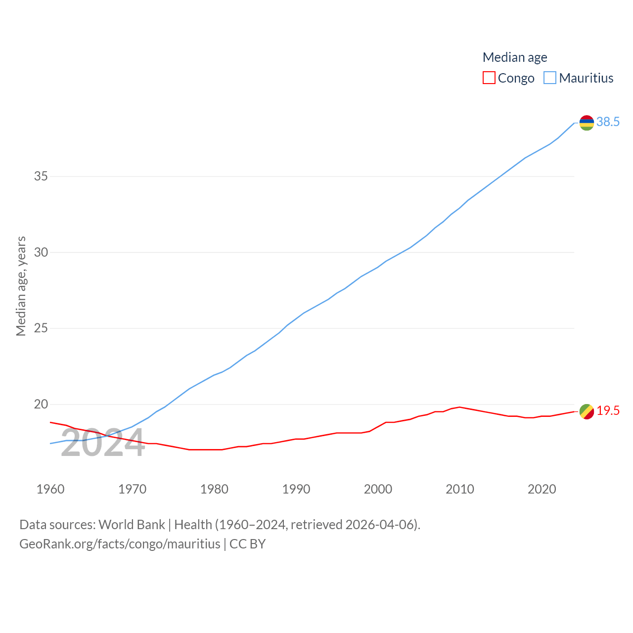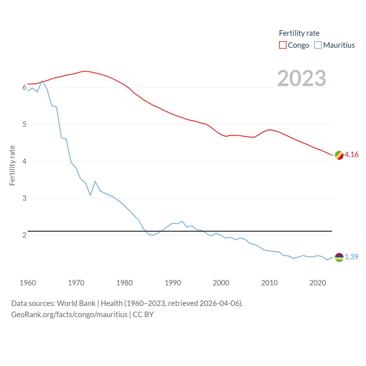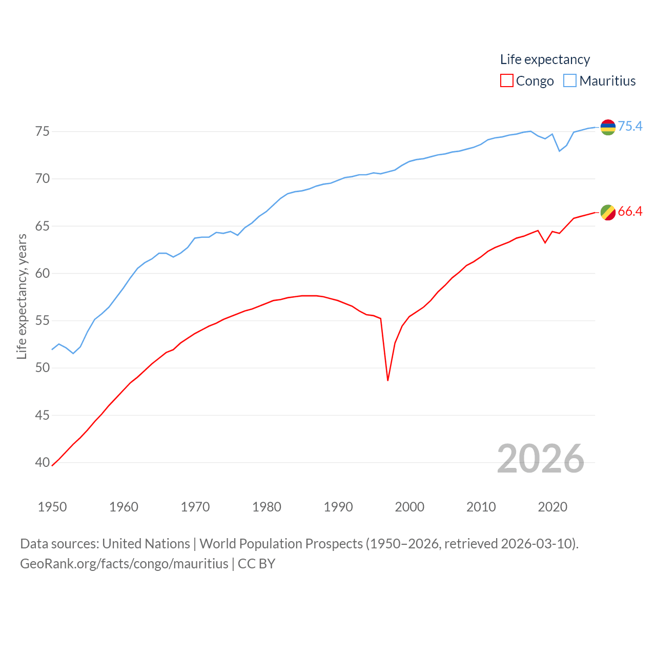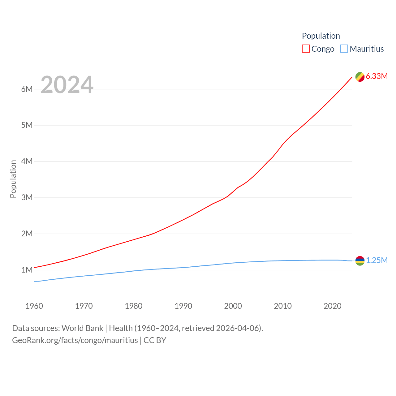 The Congo has a population of 6.33M (ranked 112/197), compared with 1.25M in Mauritius (ranked 156/197). The Congo's land area is 131,854 sq mi versus 771 sq mi for Mauritius (ranked 64th vs. 170th).