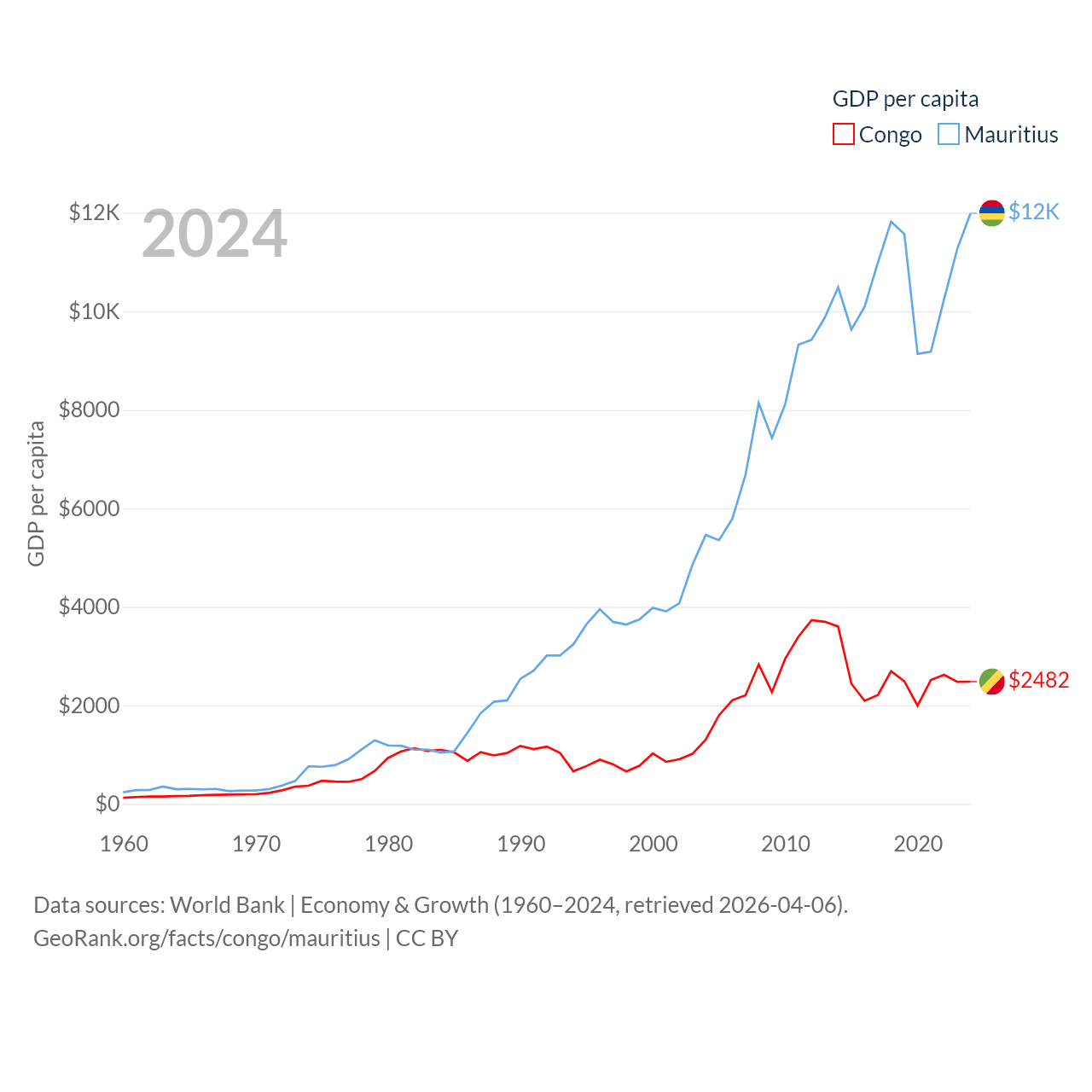By GDP, The Congo ranks 141/197 ($15.7B) and Mauritius ranks 143/197 ($14.9B). By GDP per capita, The Congo ranks 149/197 ($2,482), while Mauritius ranks 78/197 ($11,991).