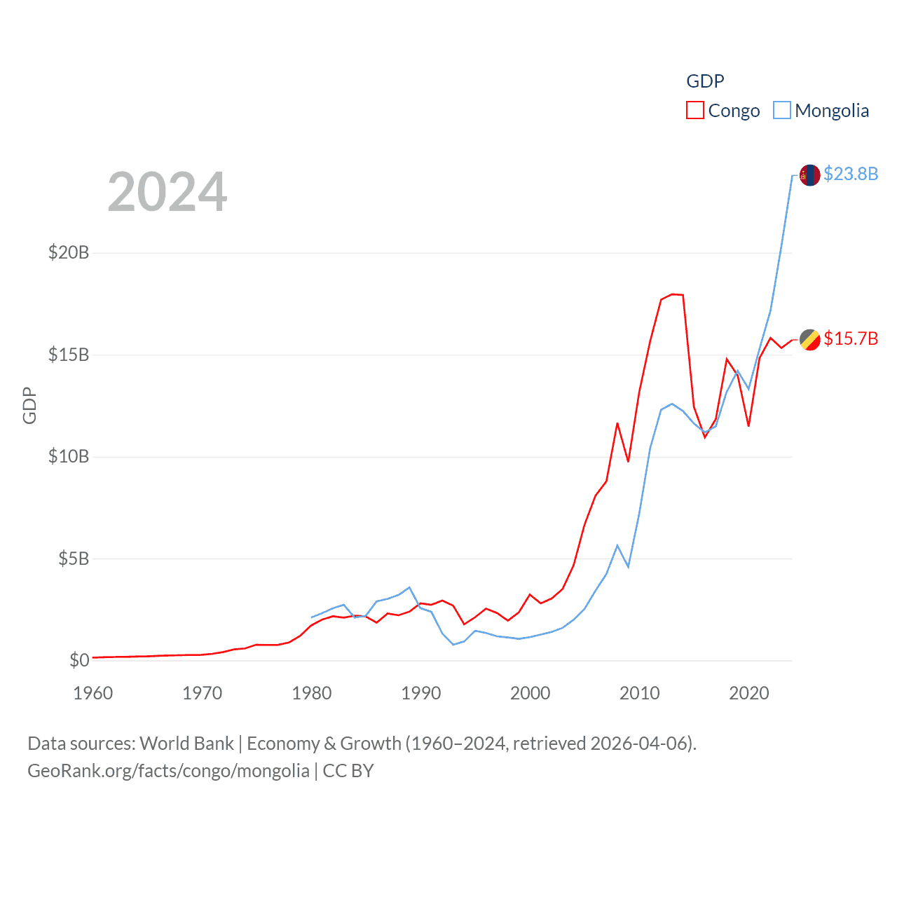 By GDP, The Congo ranks 141/197 ($15.7B) and Mongolia ranks 121/197 ($23.8B). By GDP per capita, The Congo ranks 149/197 ($2,482), while Mongolia ranks 105/197 ($6,751).