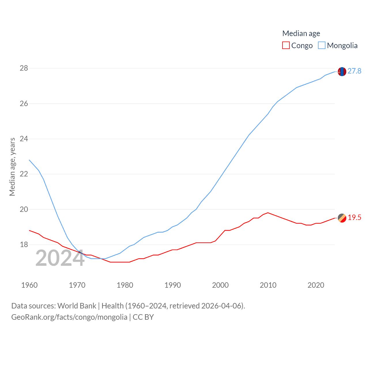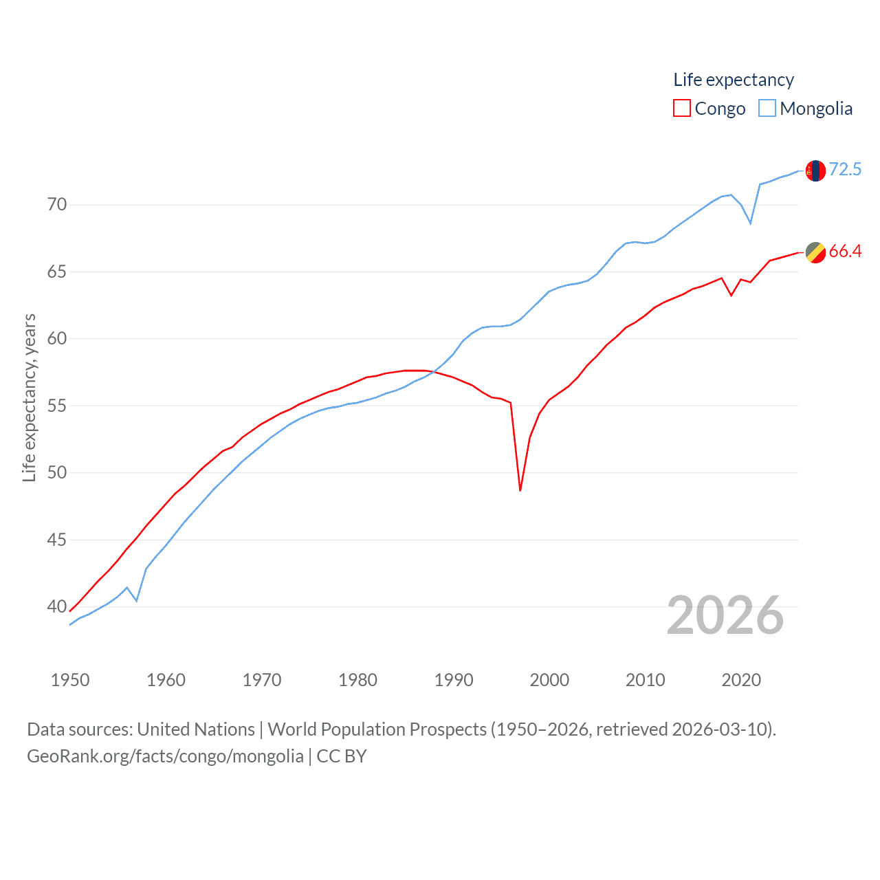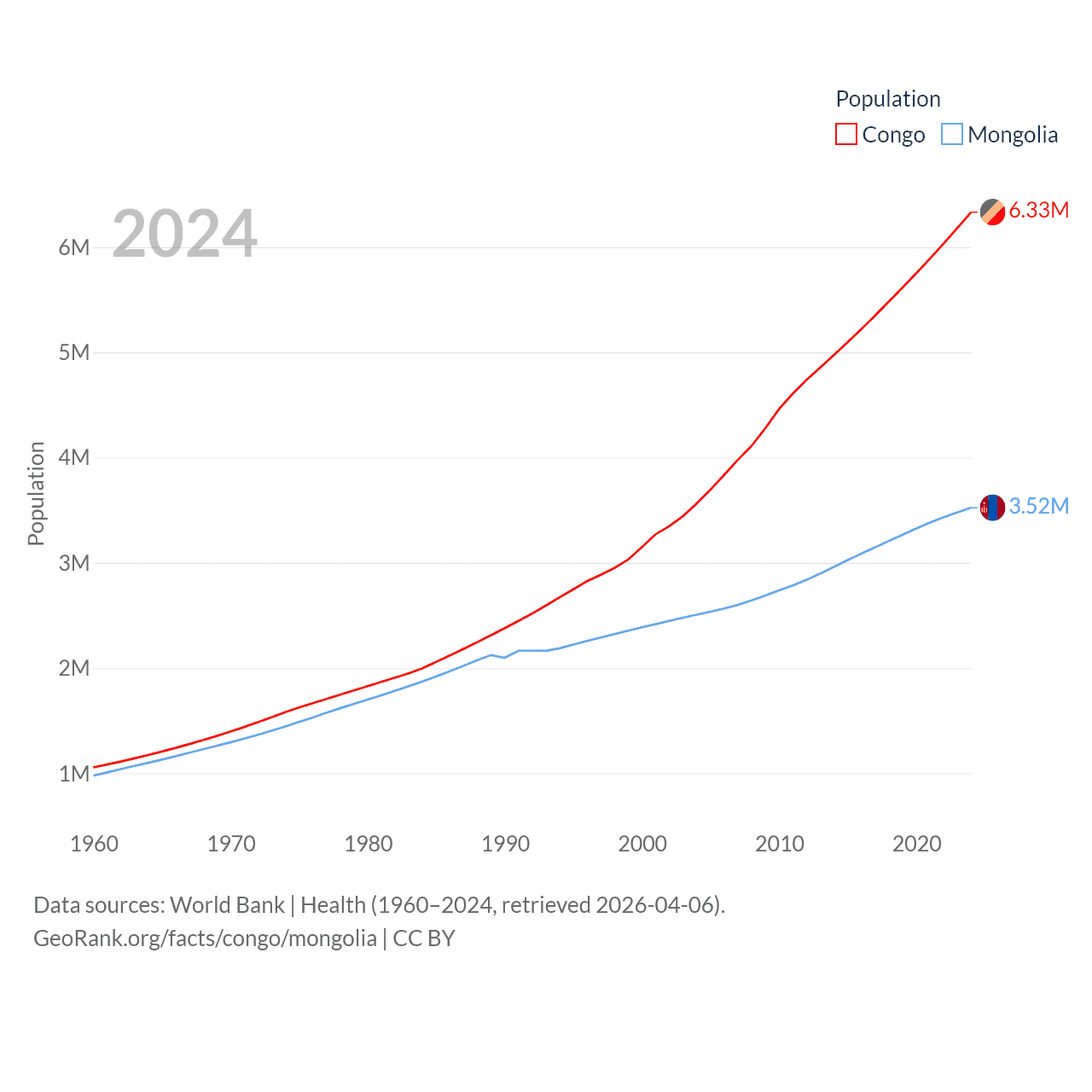 The Congo has a population of 6.33M (ranked 112/197), compared with 3.52M in Mongolia (ranked 132/197). The Congo's land area is 131,854 sq mi versus 601,740 sq mi for Mongolia (ranked 64th vs. 18th).