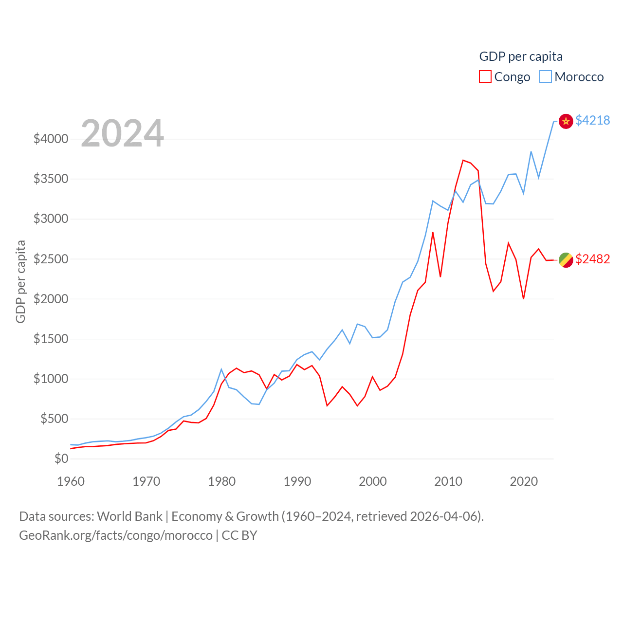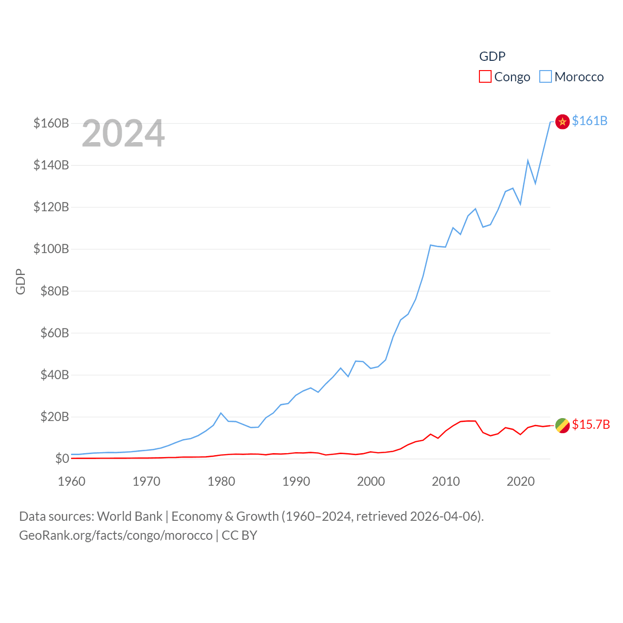 By GDP, The Congo ranks 141/197 ($15.7B) and Morocco ranks 58/197 ($161B). By GDP per capita, The Congo ranks 149/197 ($2,482), while Morocco ranks 127/197 ($4,218).