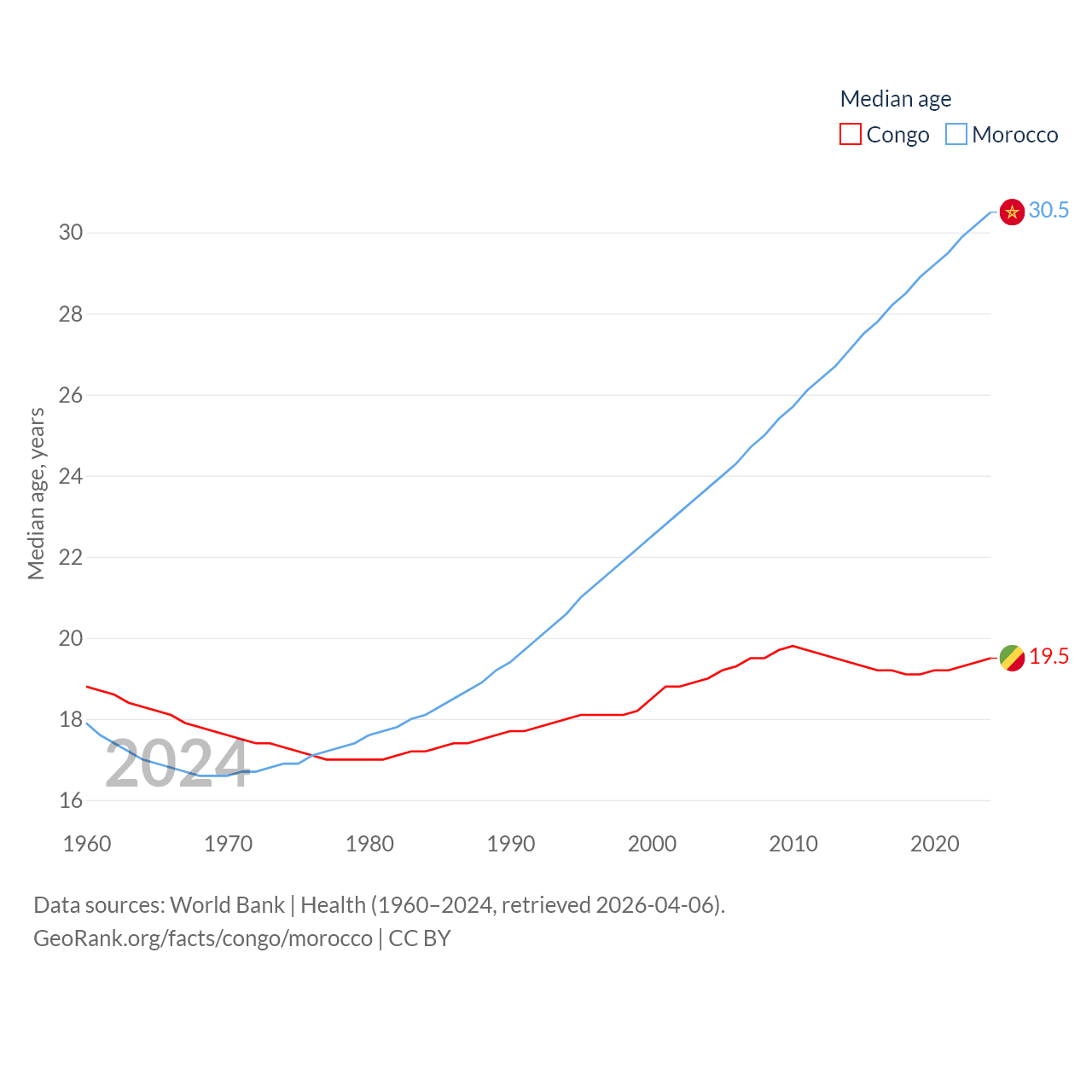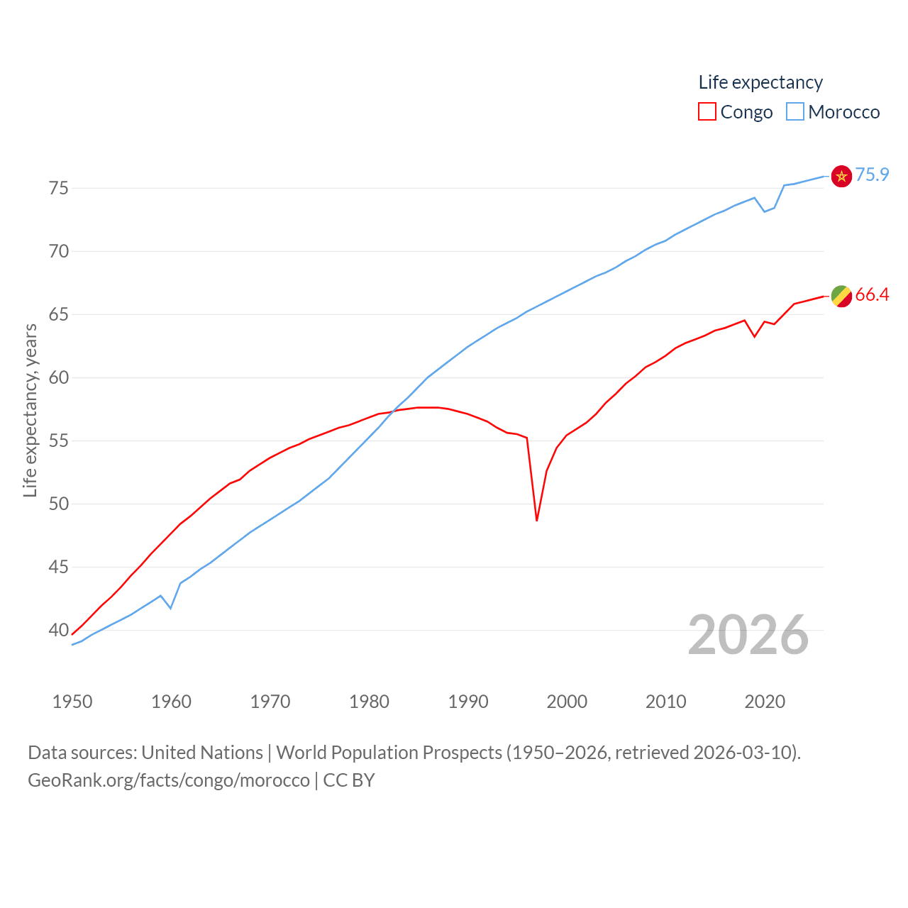 The Congo has a population of 6.33M (ranked 112/197), compared with 38.1M in Morocco (ranked 39/197). The Congo's land area is 131,854 sq mi versus 172,317 sq mi for Morocco (ranked 64th vs. 55th).