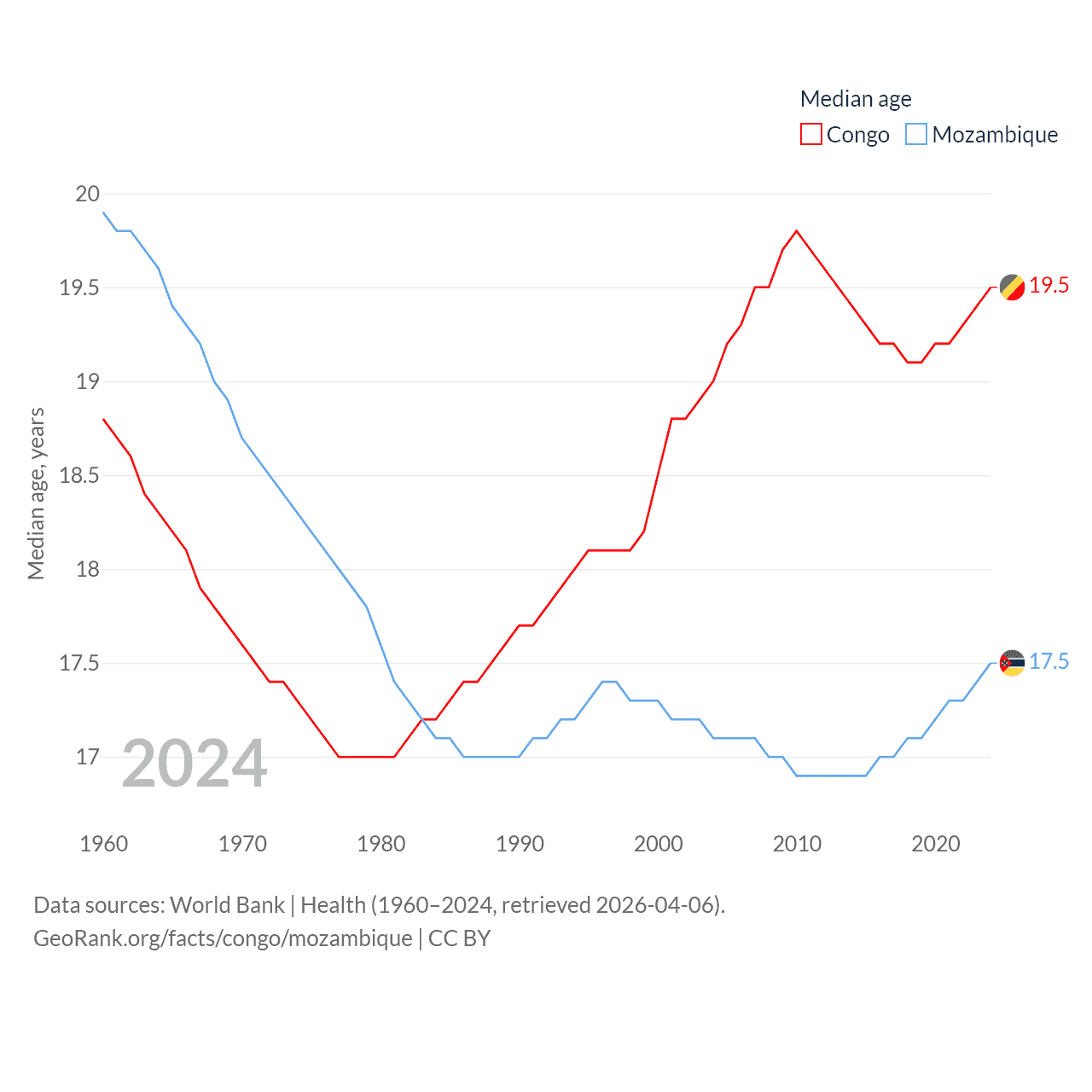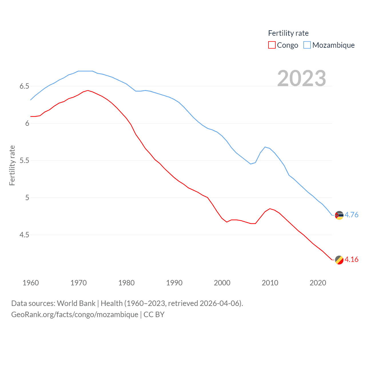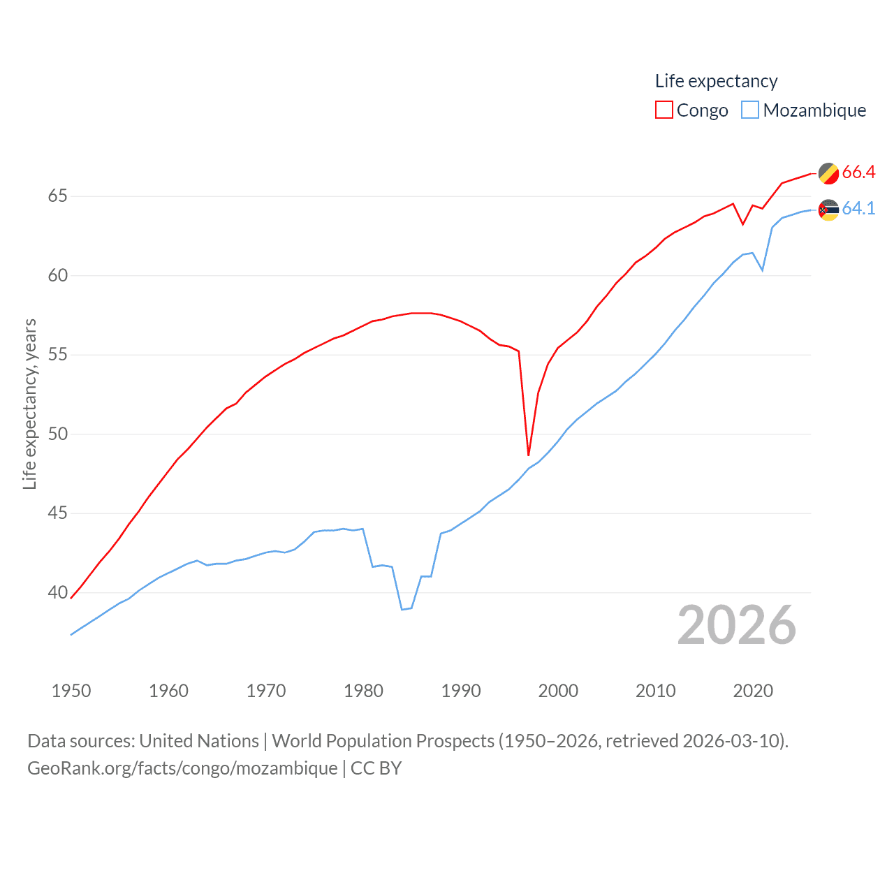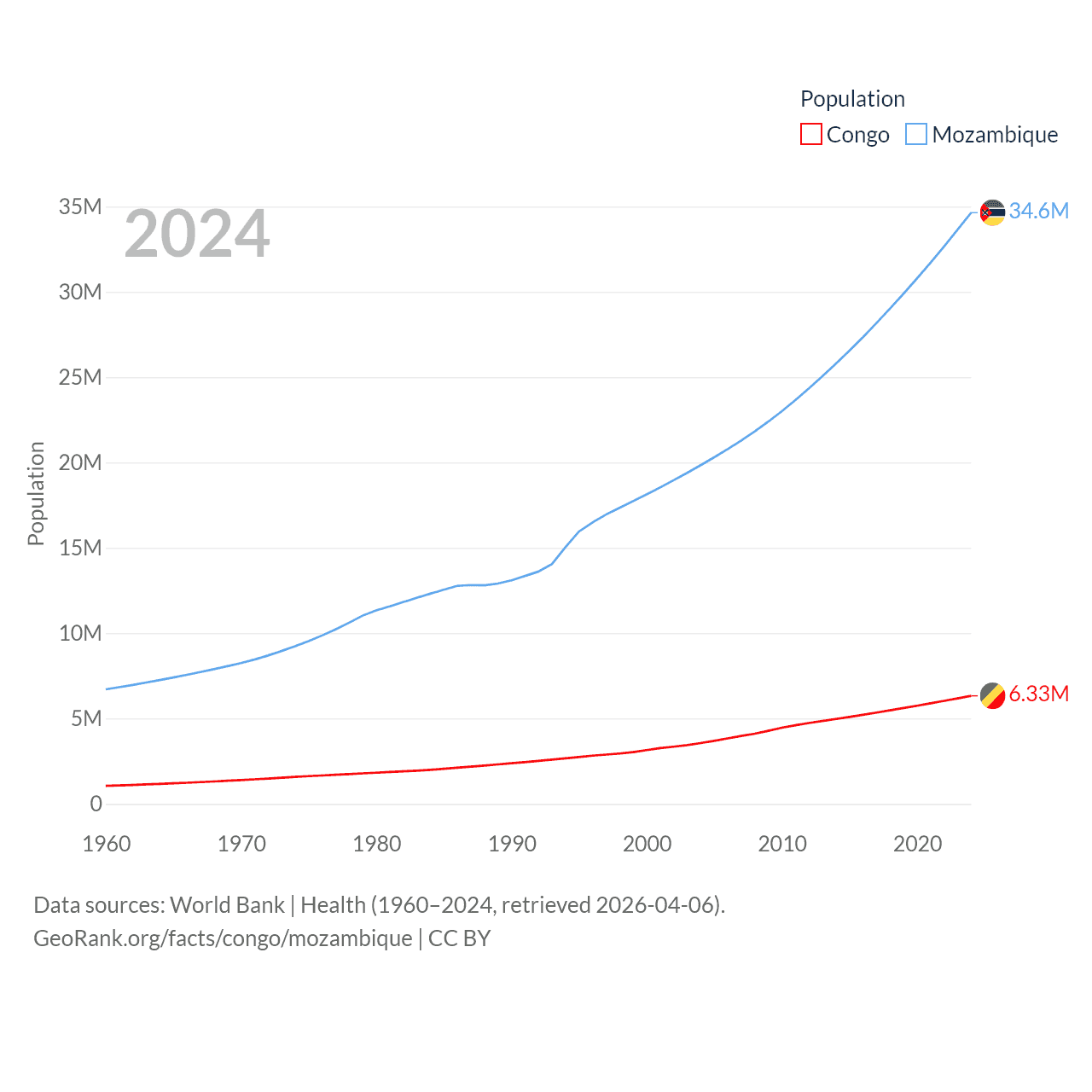 The Congo has a population of 6.33M (ranked 112/197), compared with 34.6M in Mozambique (ranked 46/197). The Congo's land area is 131,854 sq mi versus 303,623 sq mi for Mozambique (ranked 64th vs. 34th).