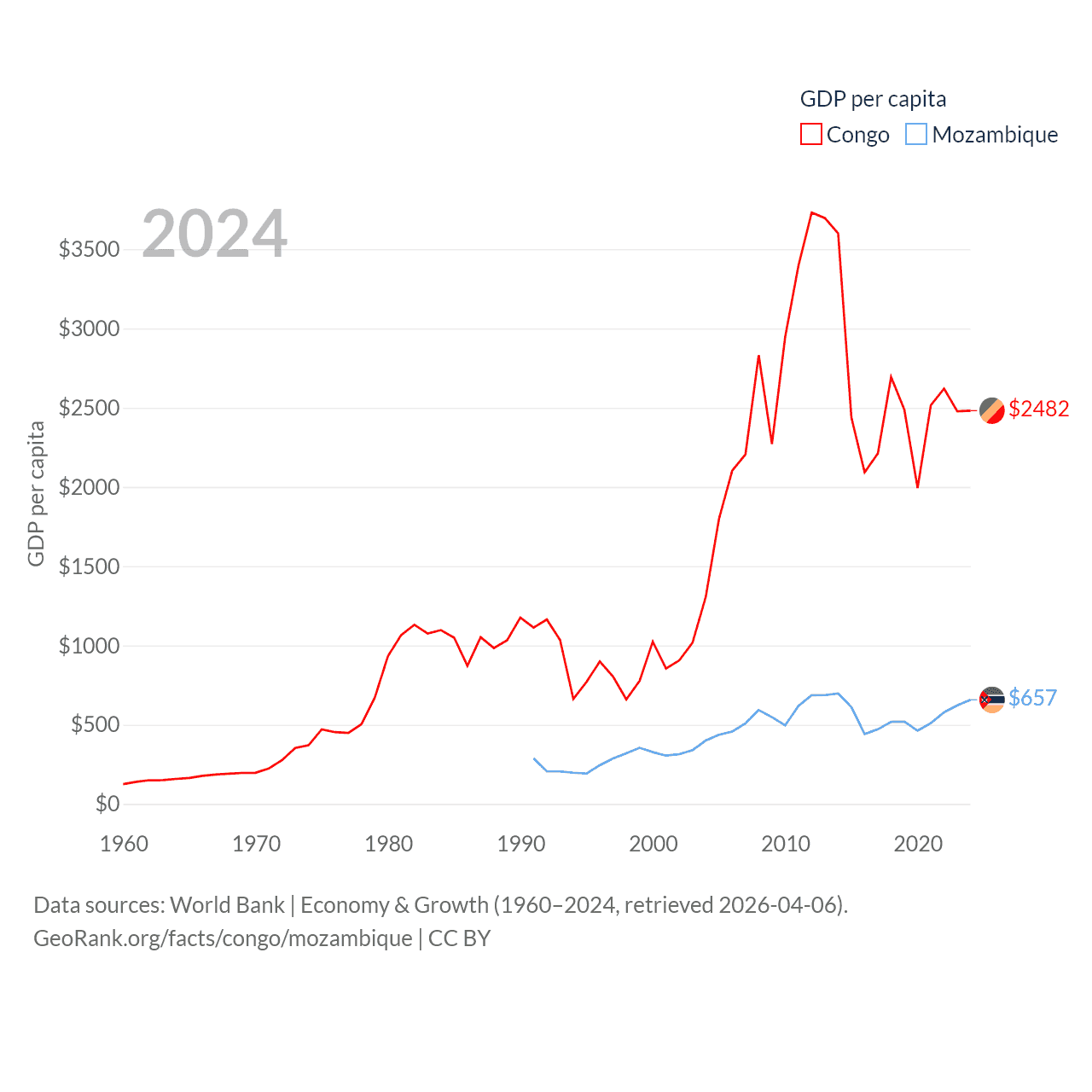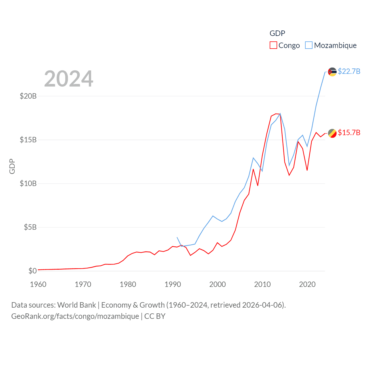 By GDP, The Congo ranks 141/197 ($15.7B) and Mozambique ranks 123/197 ($22.7B). By GDP per capita, The Congo ranks 149/197 ($2,482), while Mozambique ranks 189/197 ($657).