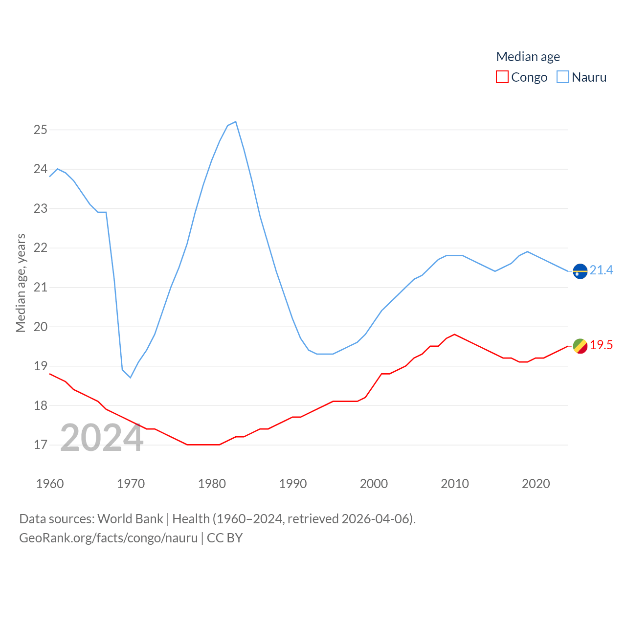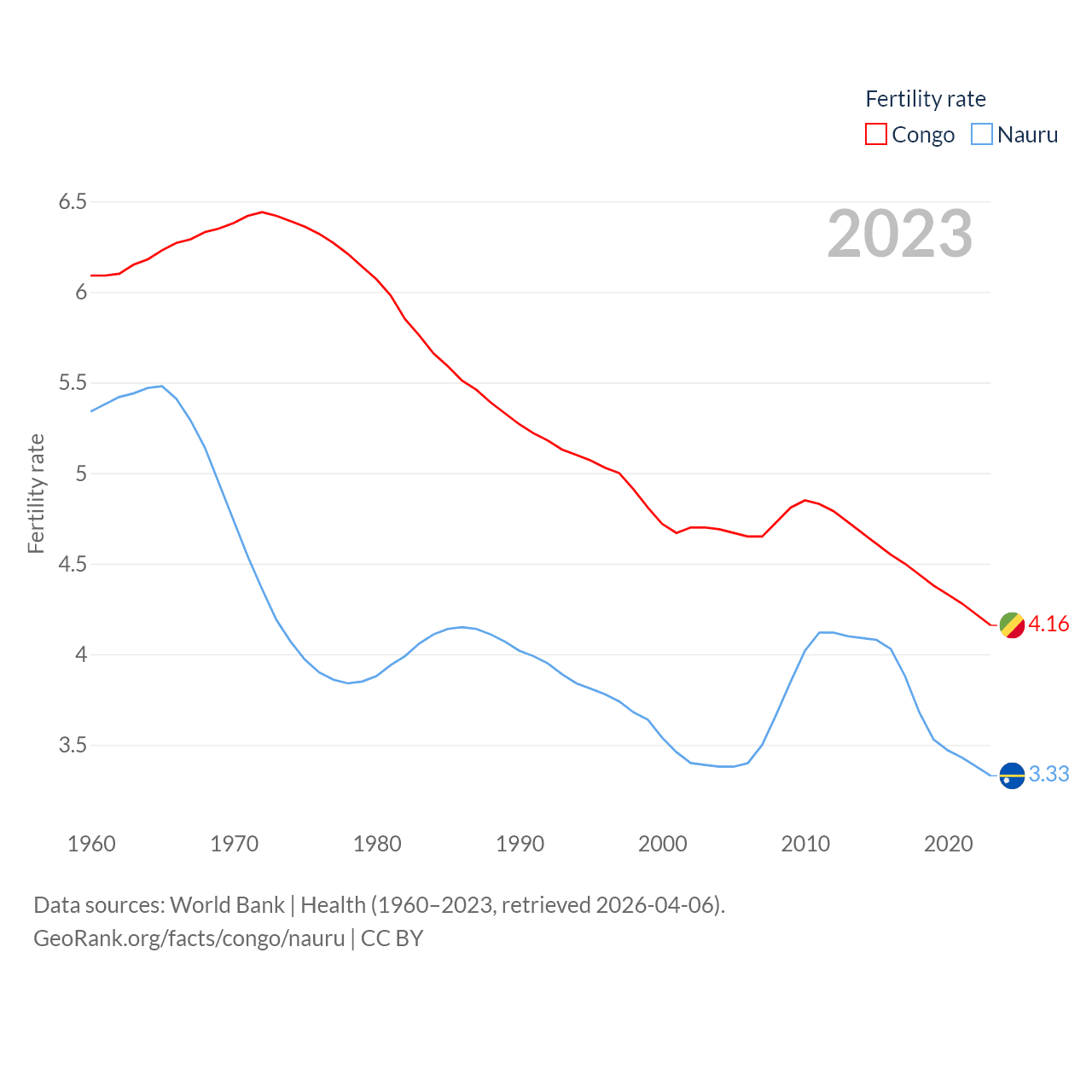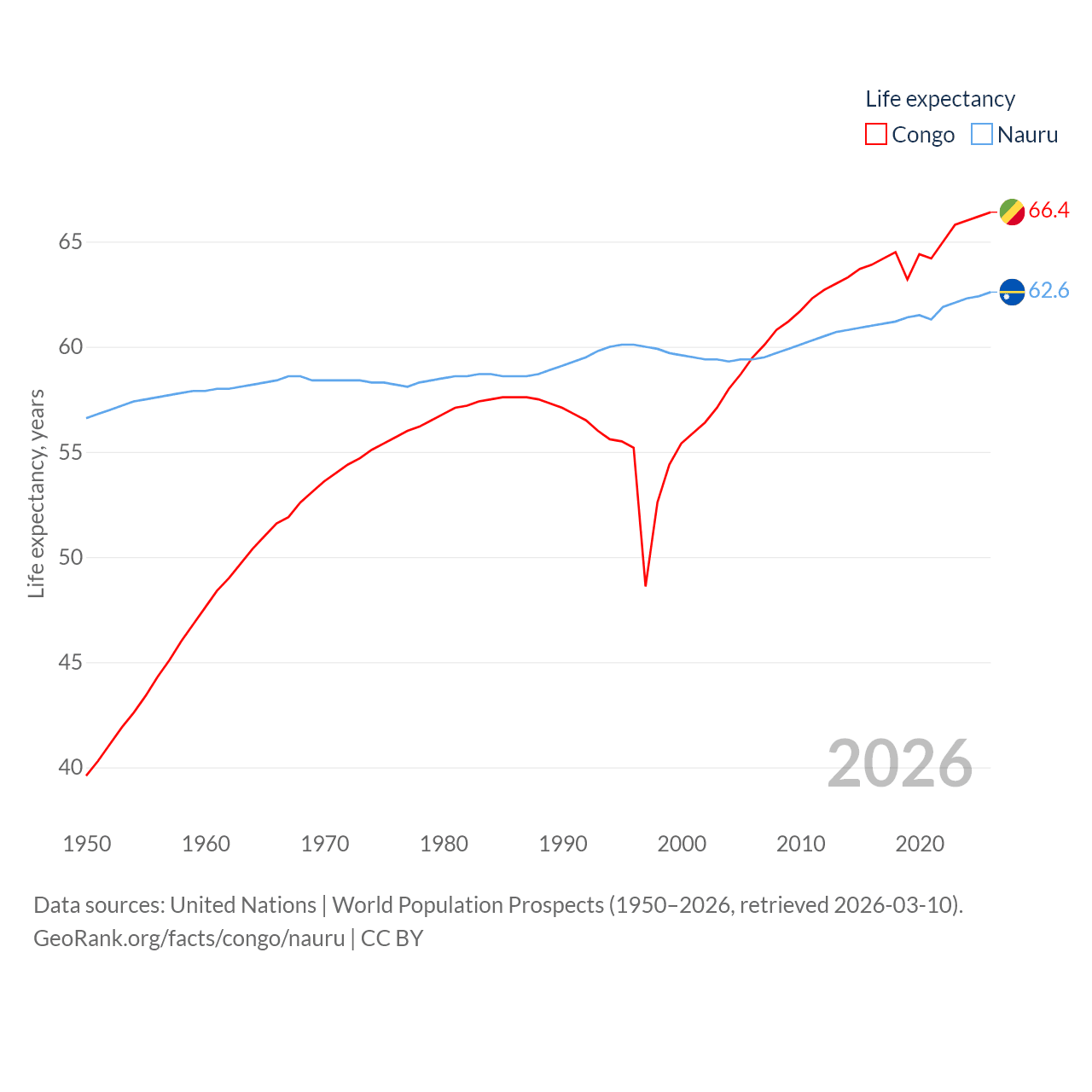 The Congo has a population of 6.33M (ranked 112/197), compared with 11.9K in Nauru (ranked 195/197). The Congo's land area is 131,854 sq mi versus 7.72 sq mi for Nauru (ranked 64th vs. 195th).