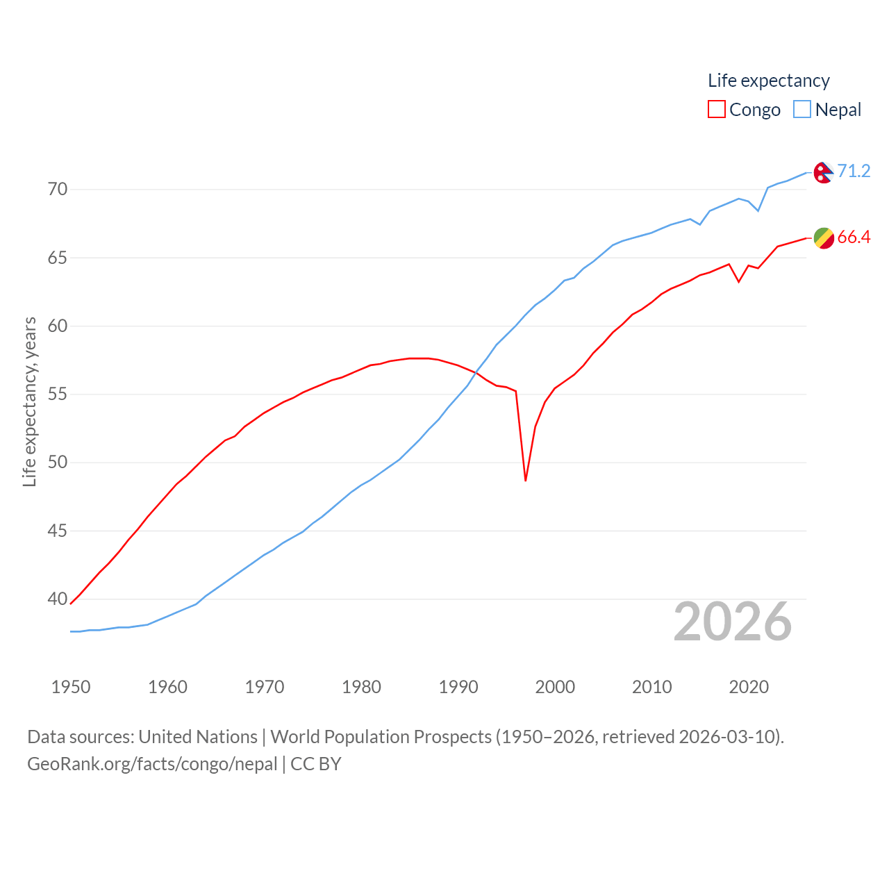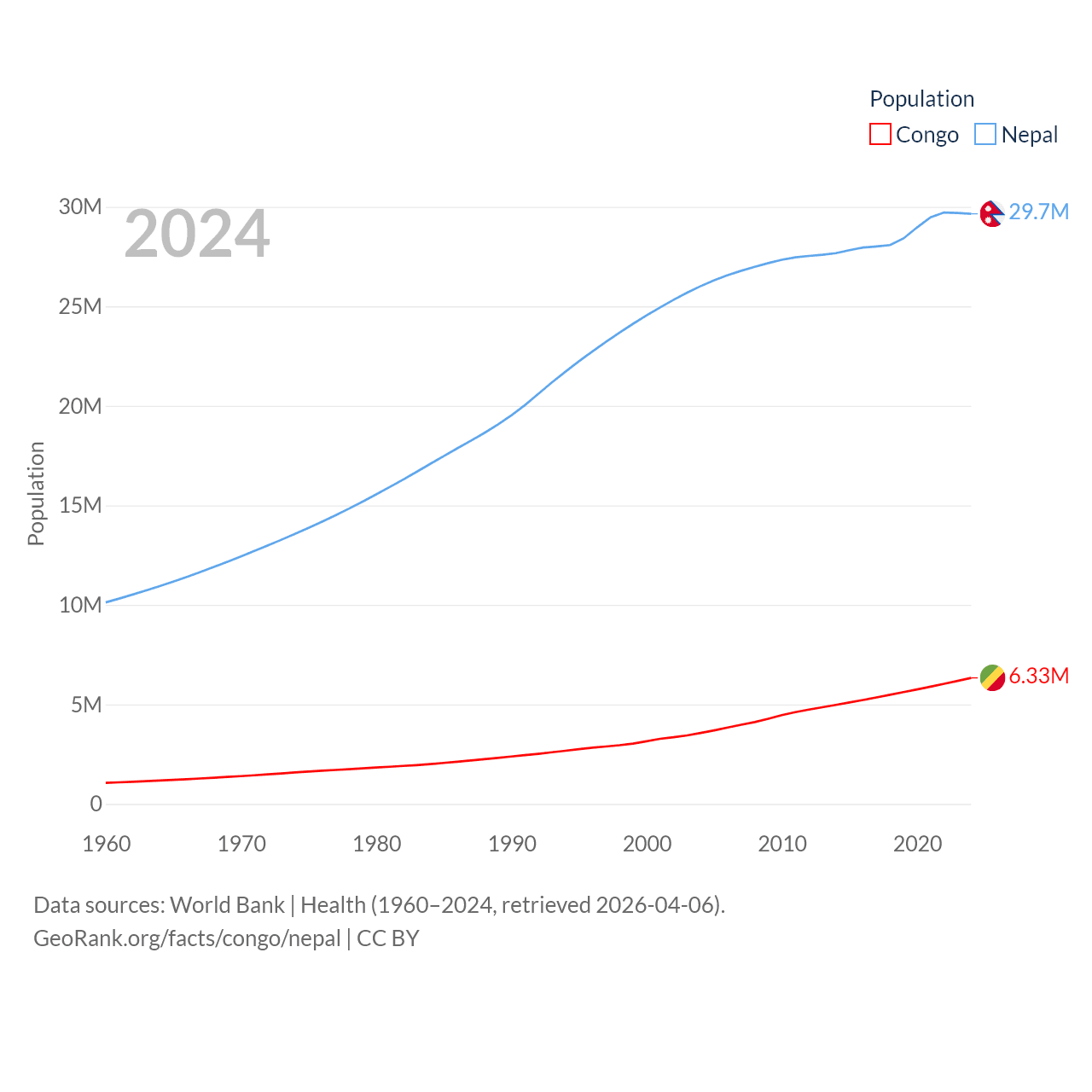 The Congo has a population of 6.33M (ranked 112/197), compared with 29.7M in Nepal (ranked 51/197). The Congo's land area is 131,854 sq mi versus 55,348 sq mi for Nepal (ranked 64th vs. 92nd).