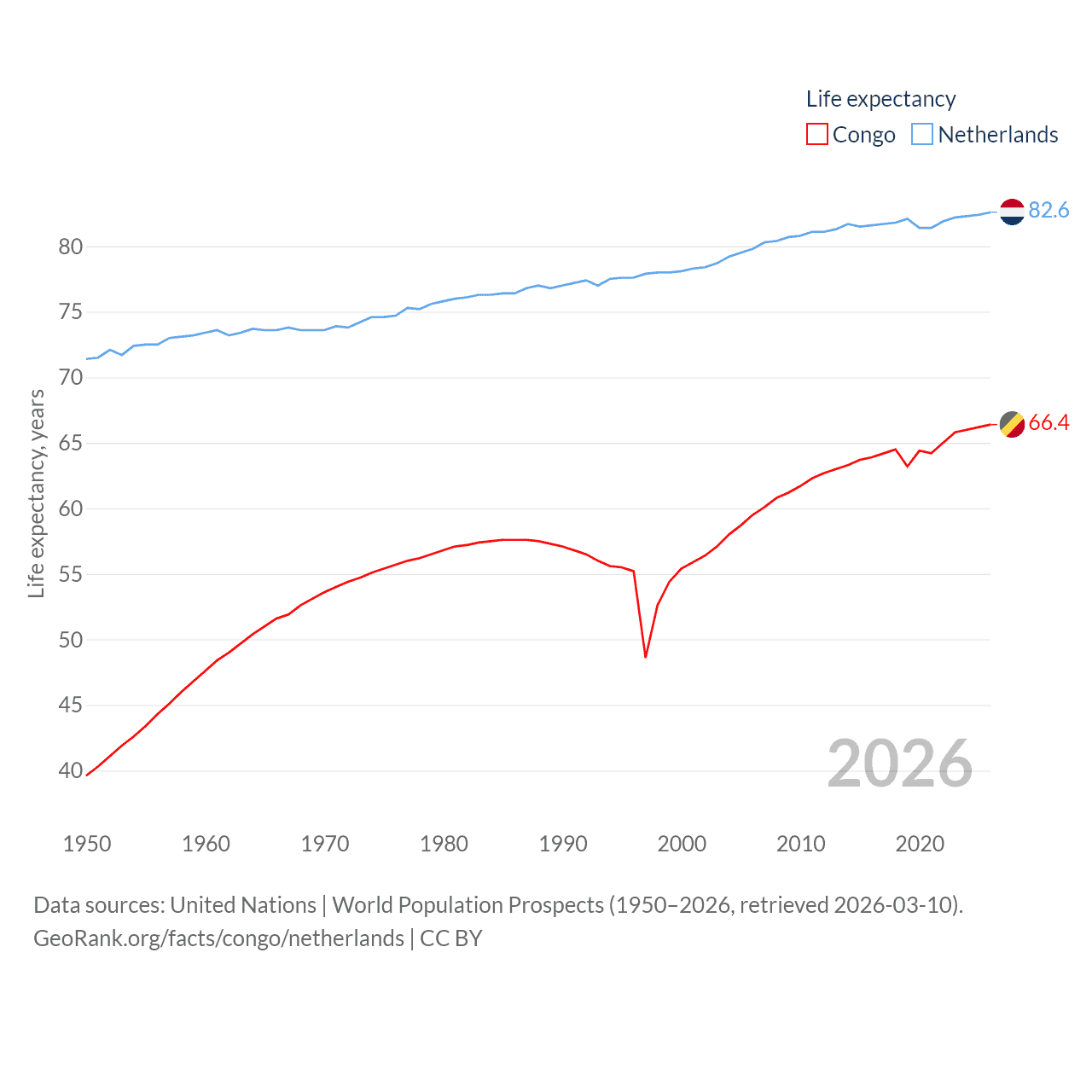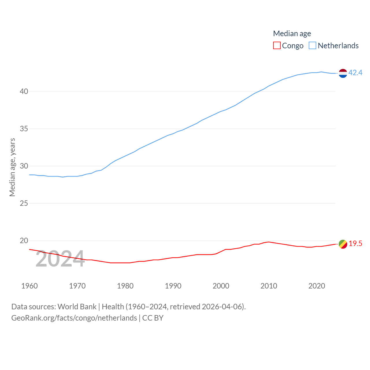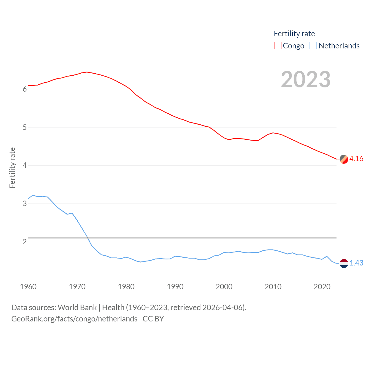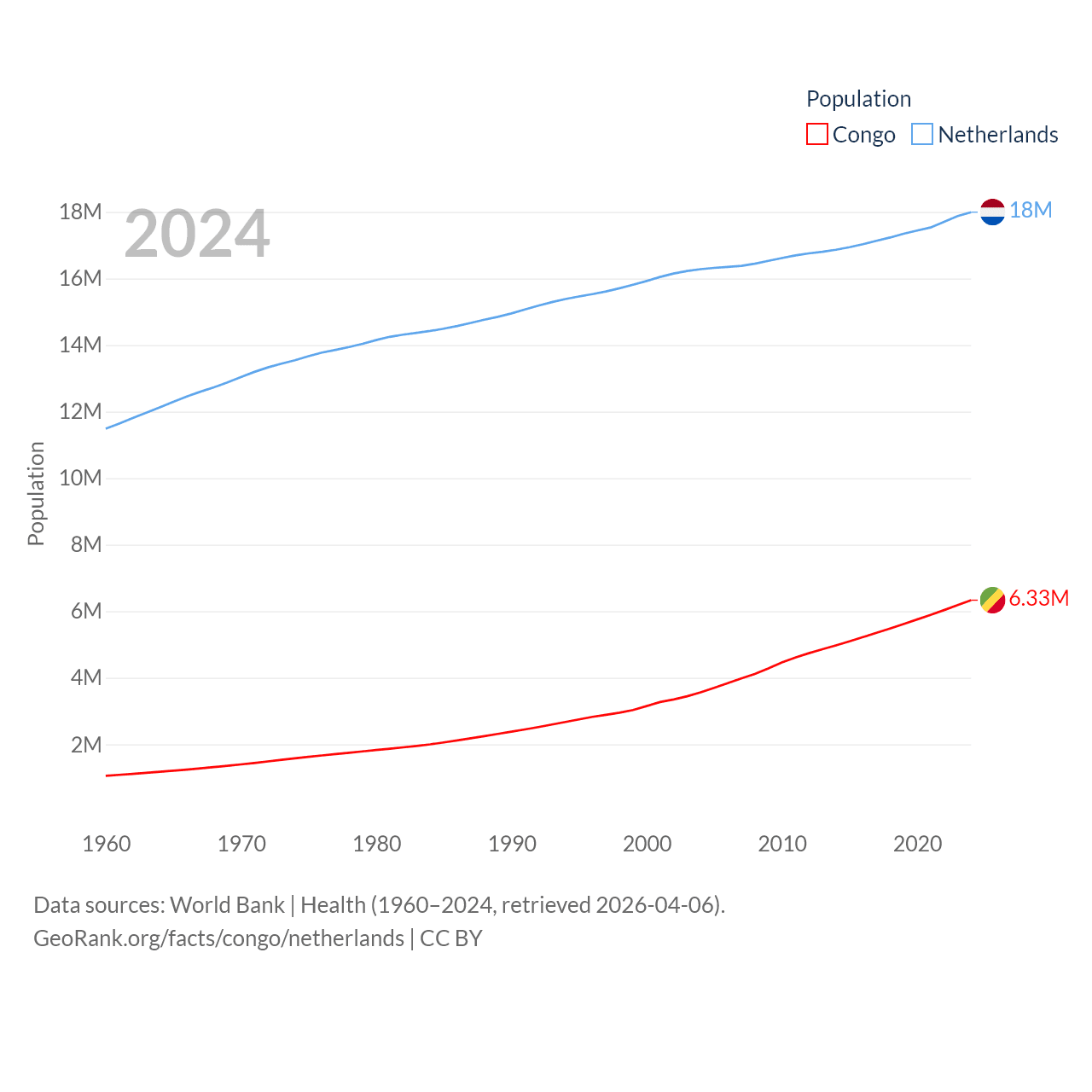 The Congo has a population of 6.33M (ranked 112/197), compared with 18M in The Netherlands (ranked 72/197). The Congo's land area is 131,854 sq mi versus 13,000 sq mi for The Netherlands (ranked 64th vs. 134th).