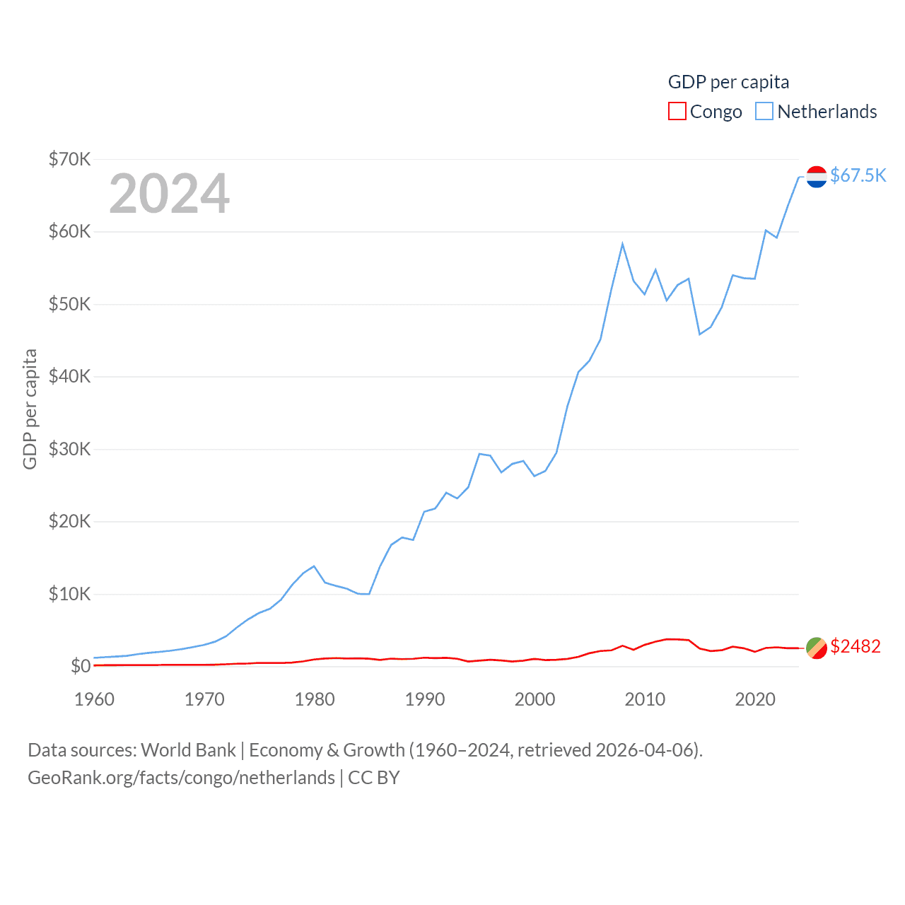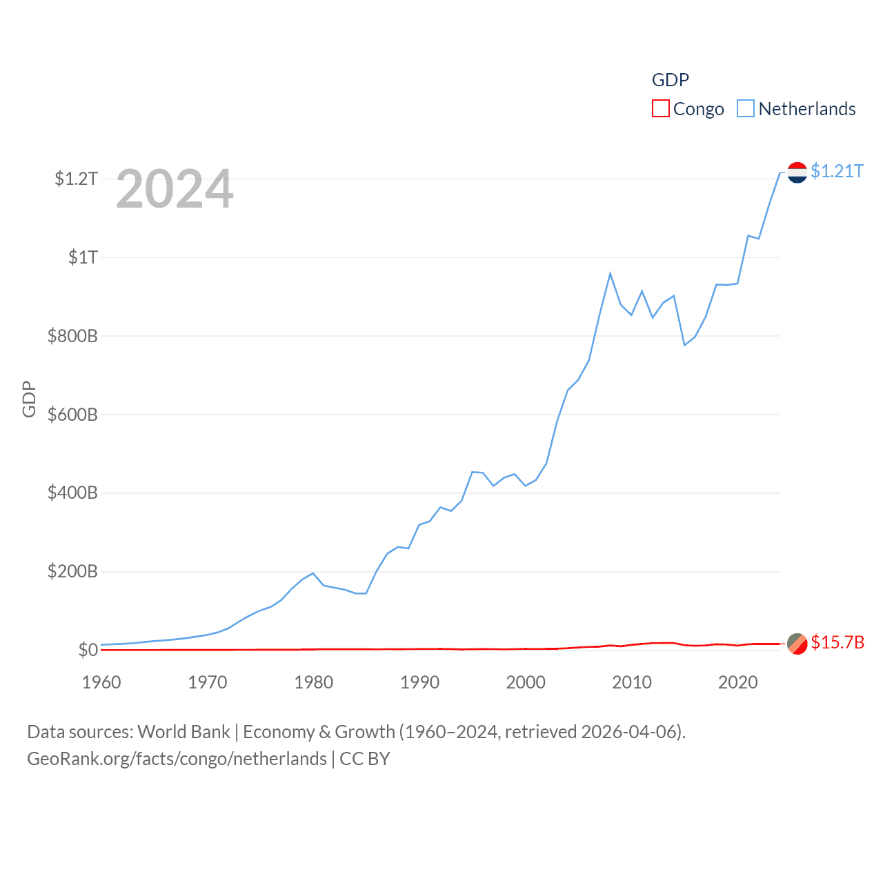 By GDP, The Congo ranks 141/197 ($15.7B) and The Netherlands ranks 19/197 ($1.21T). By GDP per capita, The Congo ranks 149/197 ($2,482), while The Netherlands ranks 13/197 ($67,520).