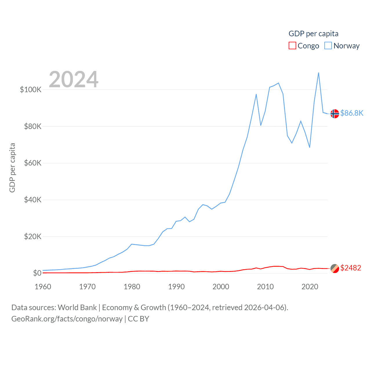 By GDP, The Congo ranks 141/197 ($15.7B) and Norway ranks 32/197 ($484B). By GDP per capita, The Congo ranks 149/197 ($2,482), while Norway ranks 8/197 ($86,785).