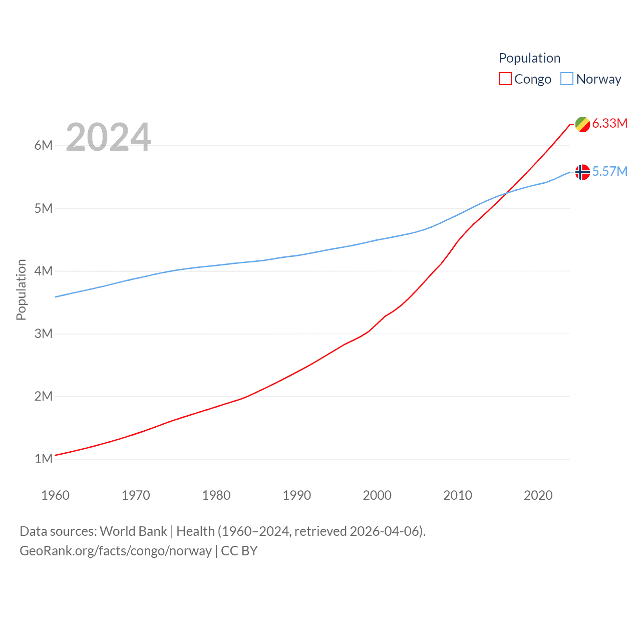 The Congo has a population of 6.33M (ranked 112/197), compared with 5.57M in Norway (ranked 118/197). The Congo's land area is 131,854 sq mi versus 140,645 sq mi for Norway (ranked 64th vs. 62nd).