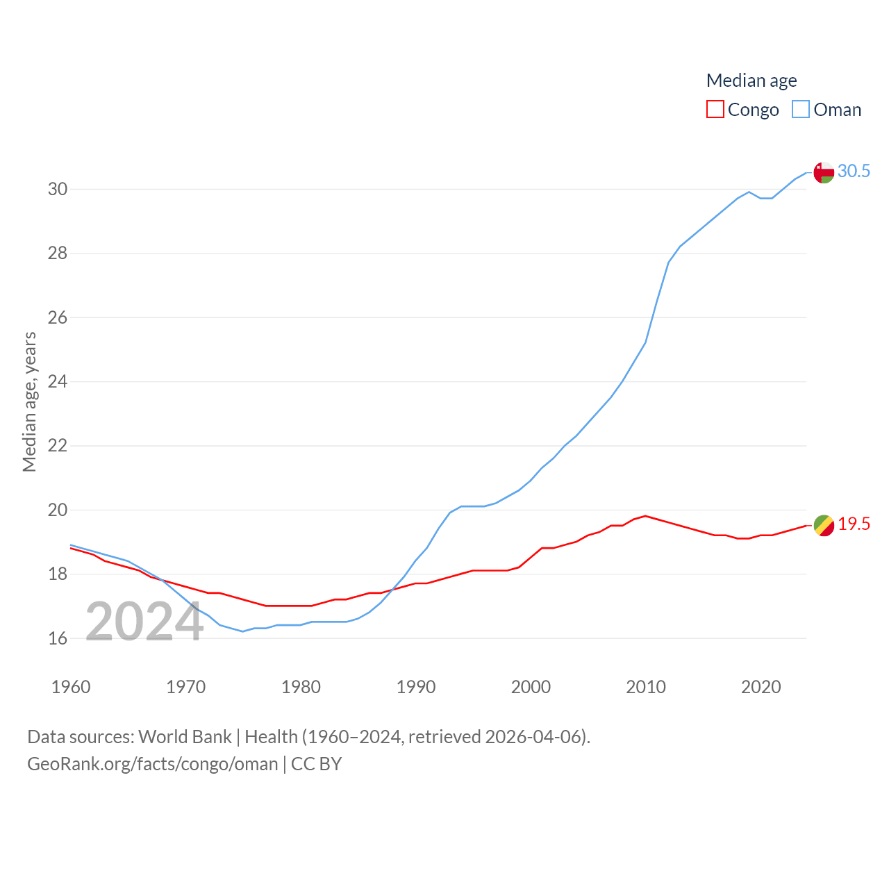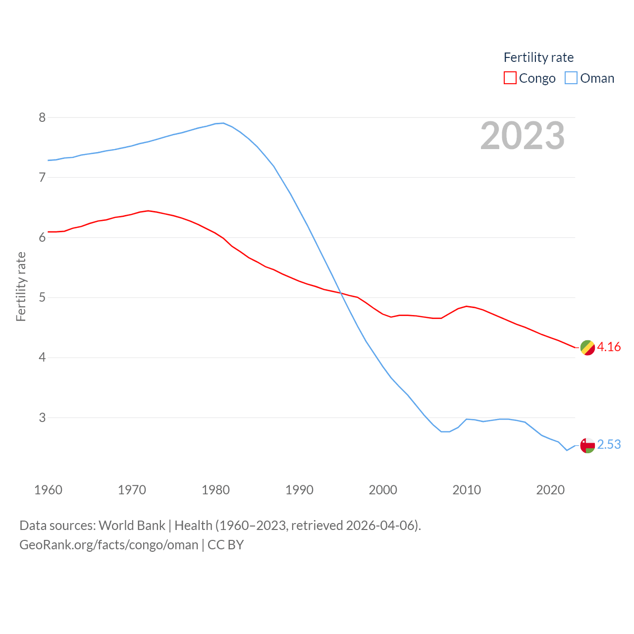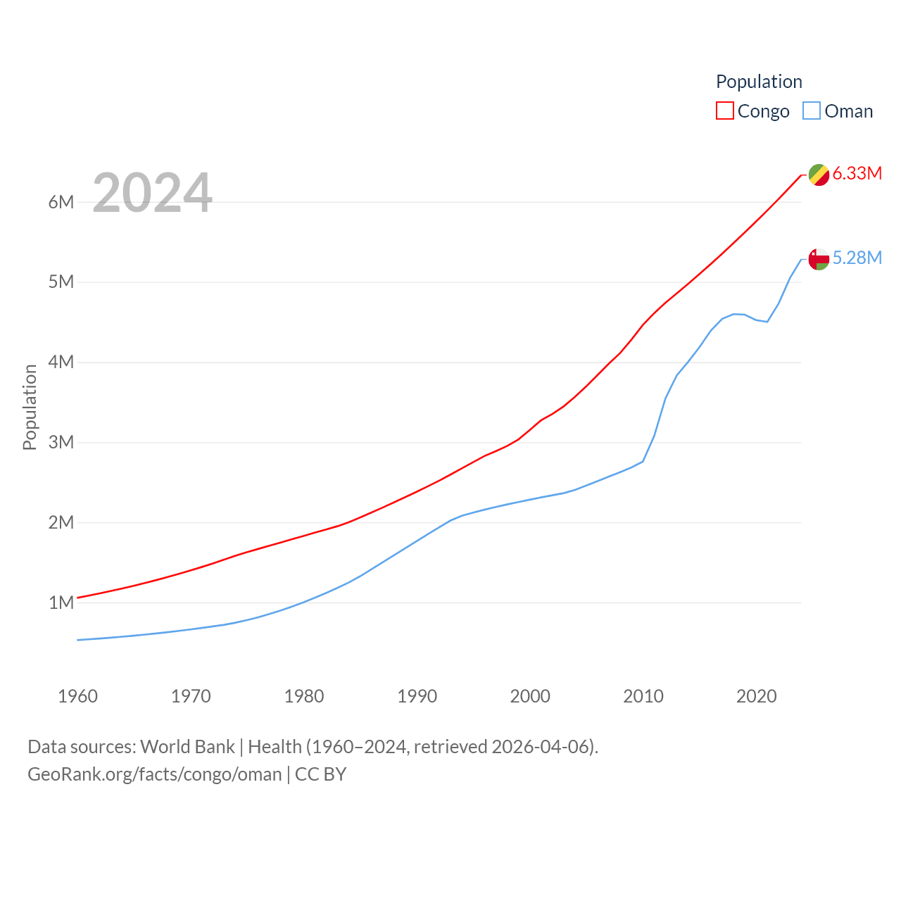 The Congo has a population of 6.33M (ranked 112/197), compared with 5.28M in Oman (ranked 124/197). The Congo's land area is 131,854 sq mi versus 119,499 sq mi for Oman (ranked 64th vs. 68th).