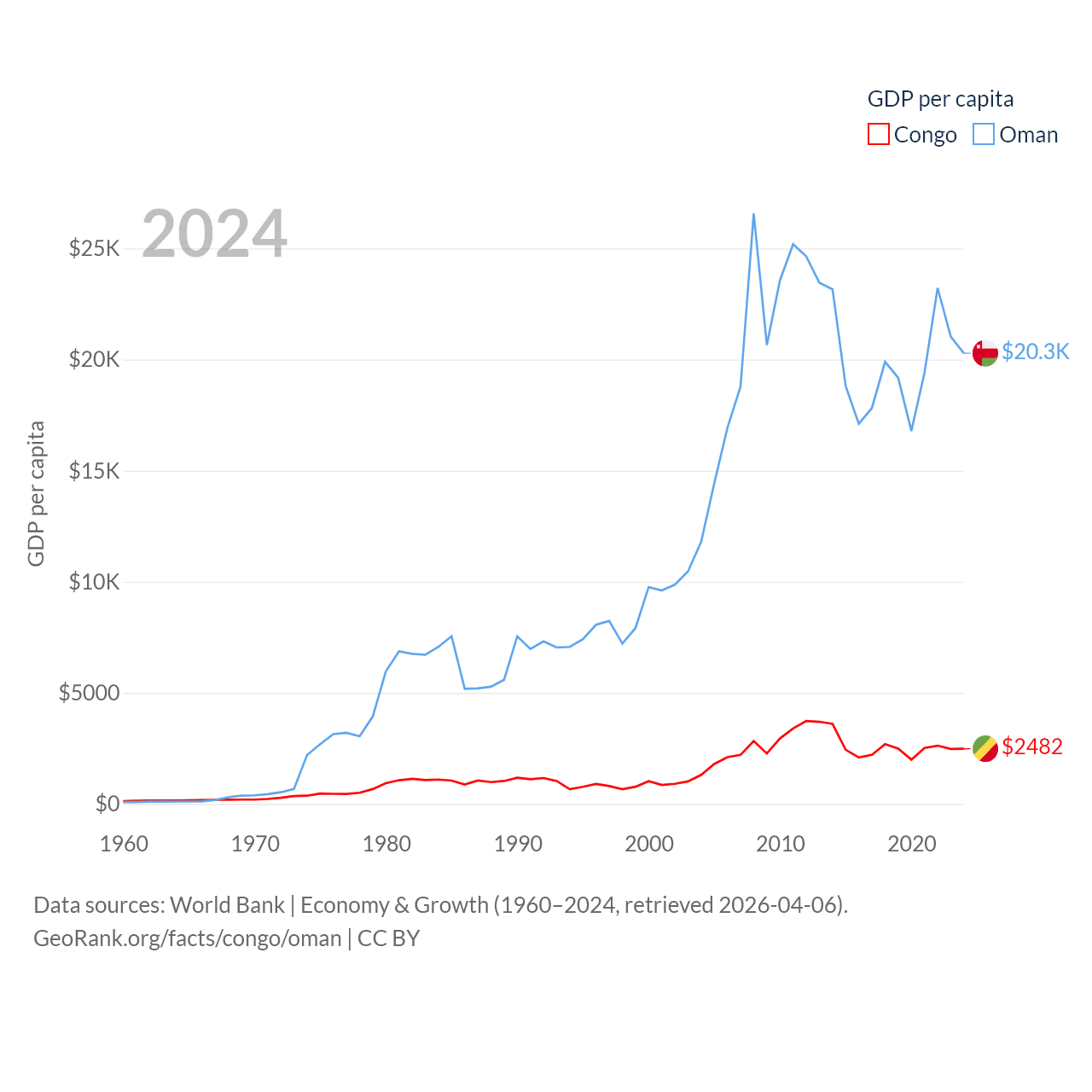 By GDP, The Congo ranks 141/197 ($15.7B) and Oman ranks 70/197 ($107B). By GDP per capita, The Congo ranks 149/197 ($2,482), while Oman ranks 57/197 ($20,285).