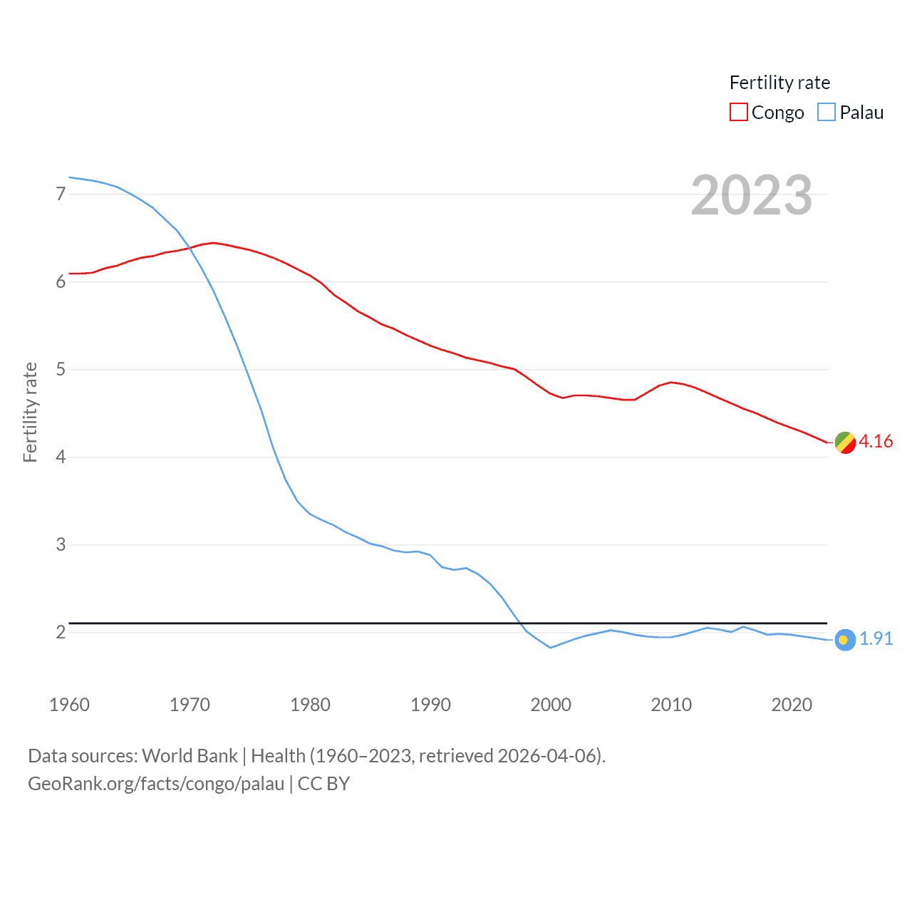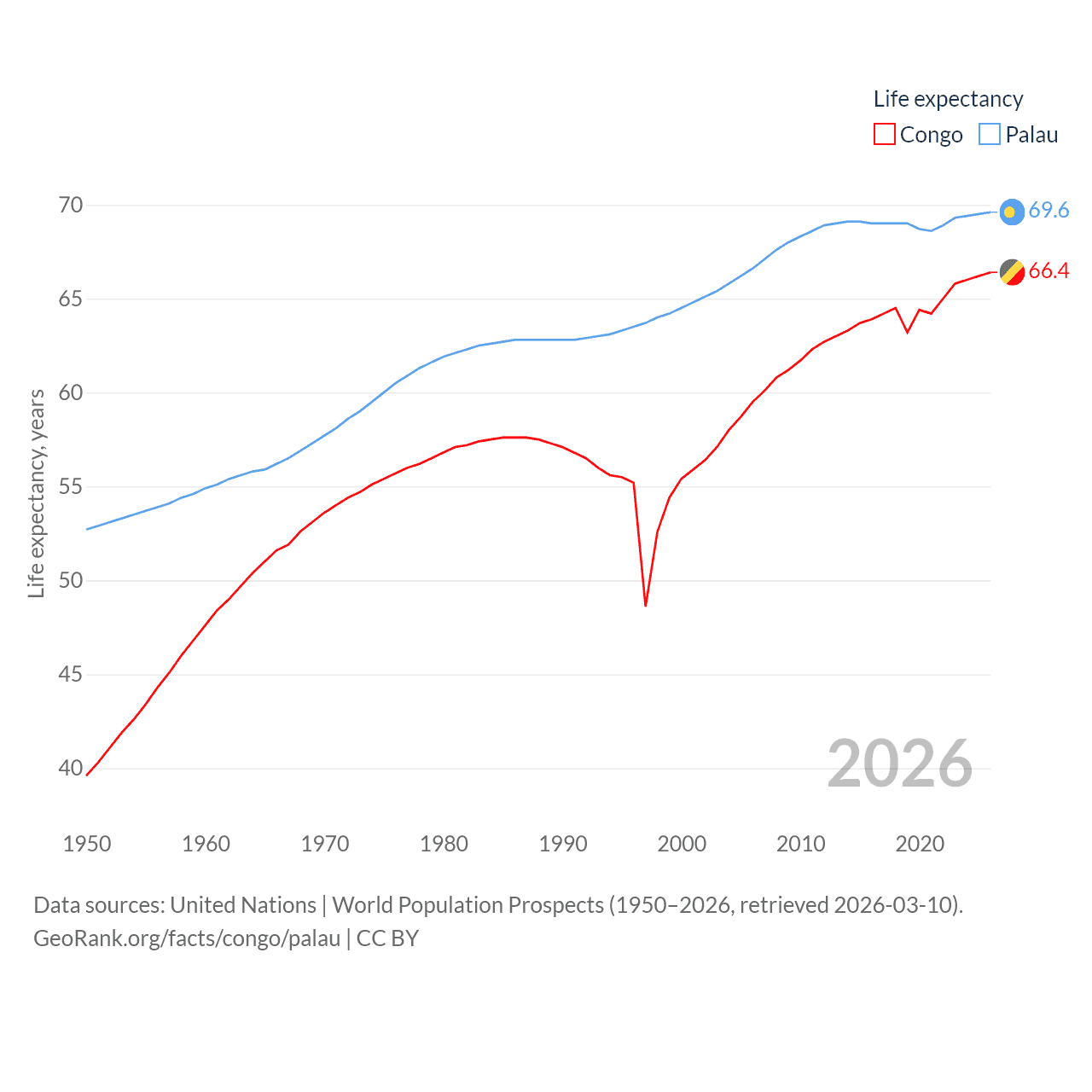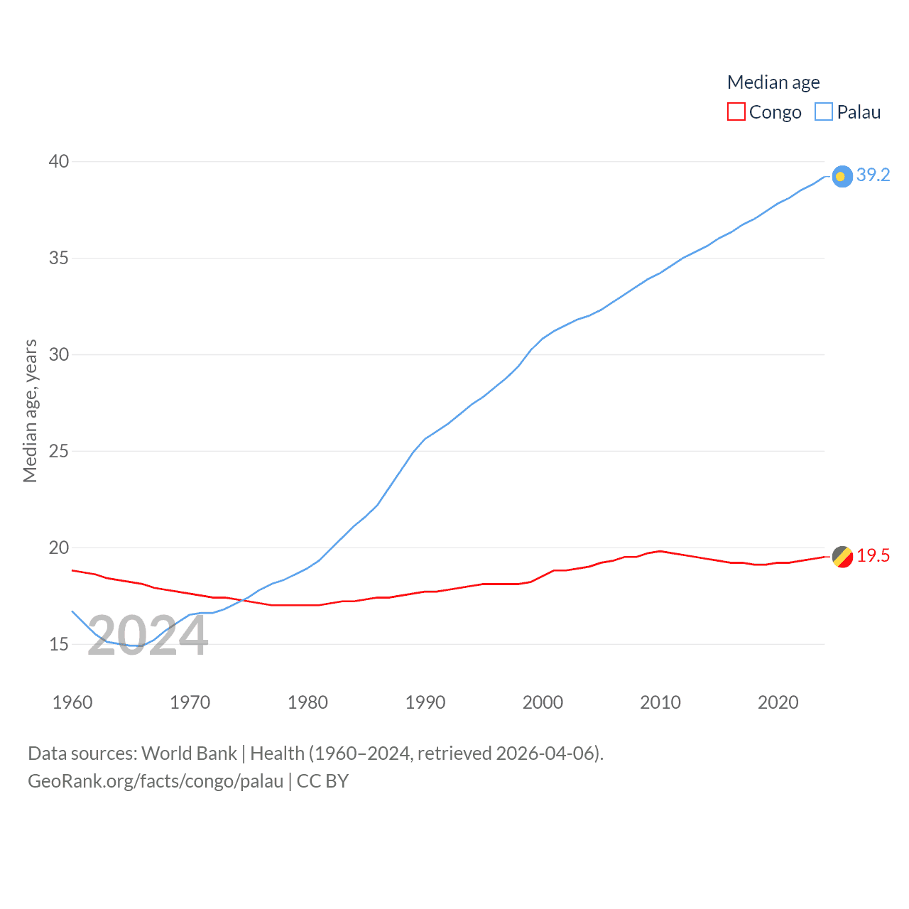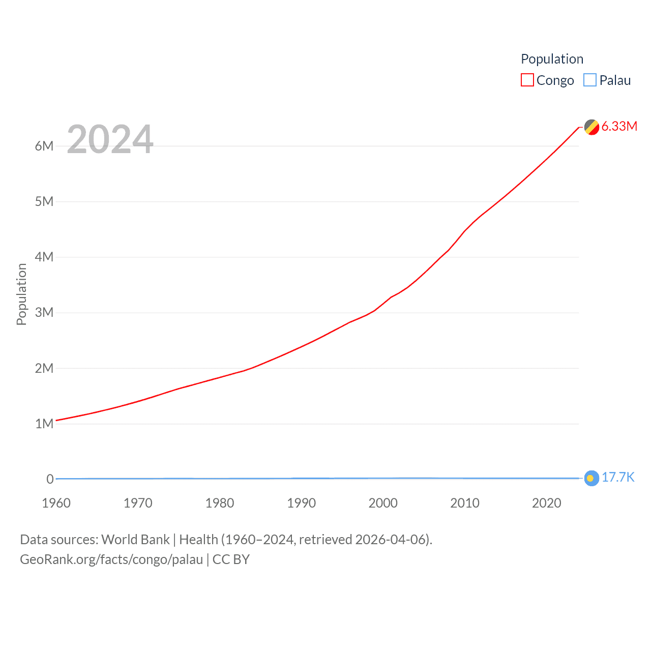 The Congo has a population of 6.33M (ranked 112/197), compared with 17.7K in Palau (ranked 194/197). The Congo's land area is 131,854 sq mi versus 177.6 sq mi for Palau (ranked 64th vs. 180th).