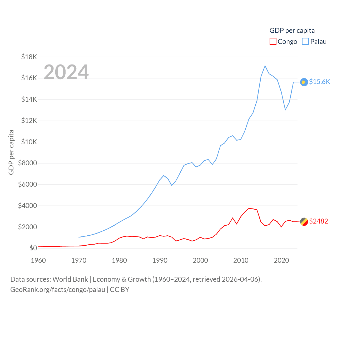 By GDP, The Congo ranks 141/197 ($15.7B) and Palau ranks 194/197 ($277M). By GDP per capita, The Congo ranks 149/197 ($2,482), while Palau ranks 67/197 ($15,611).
