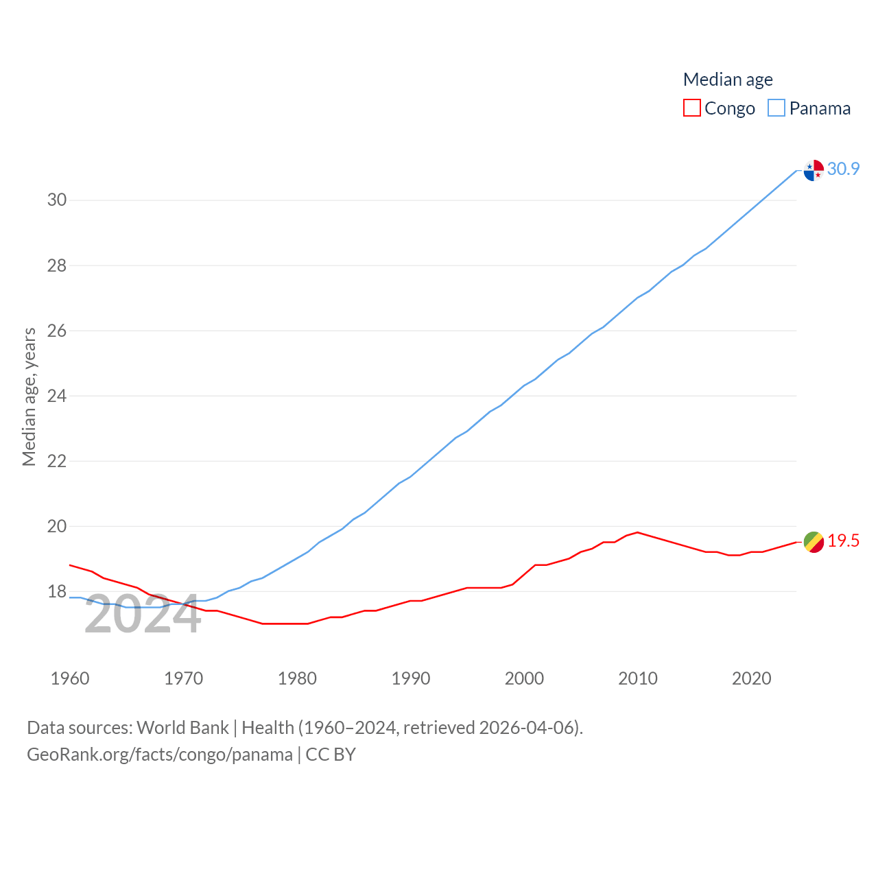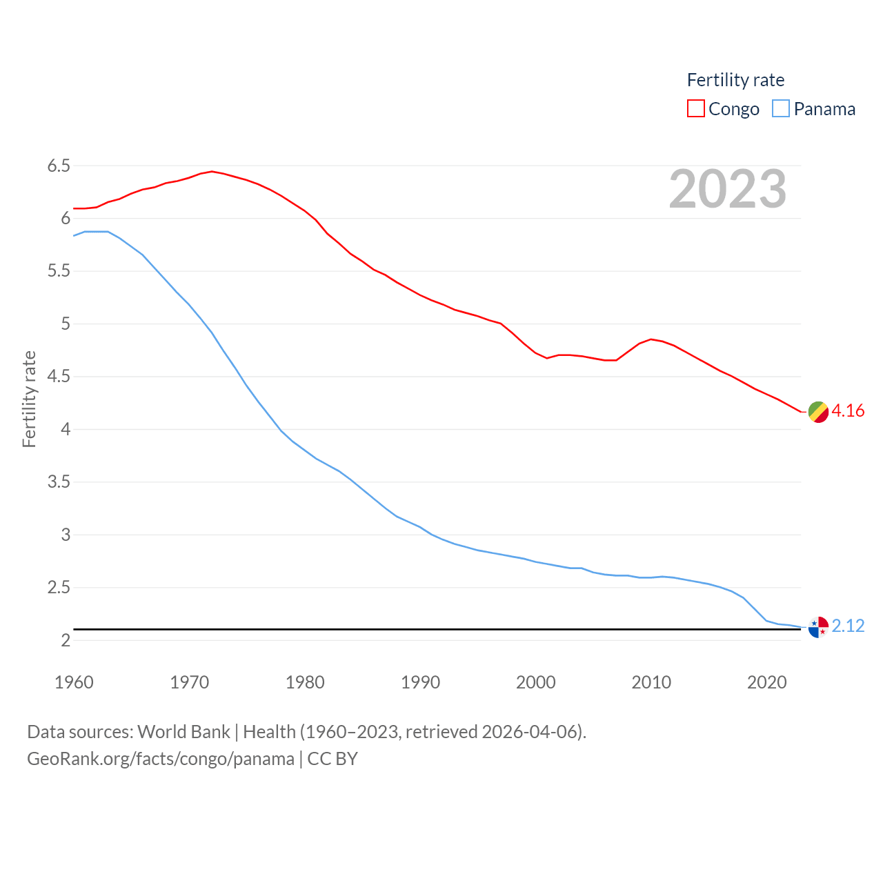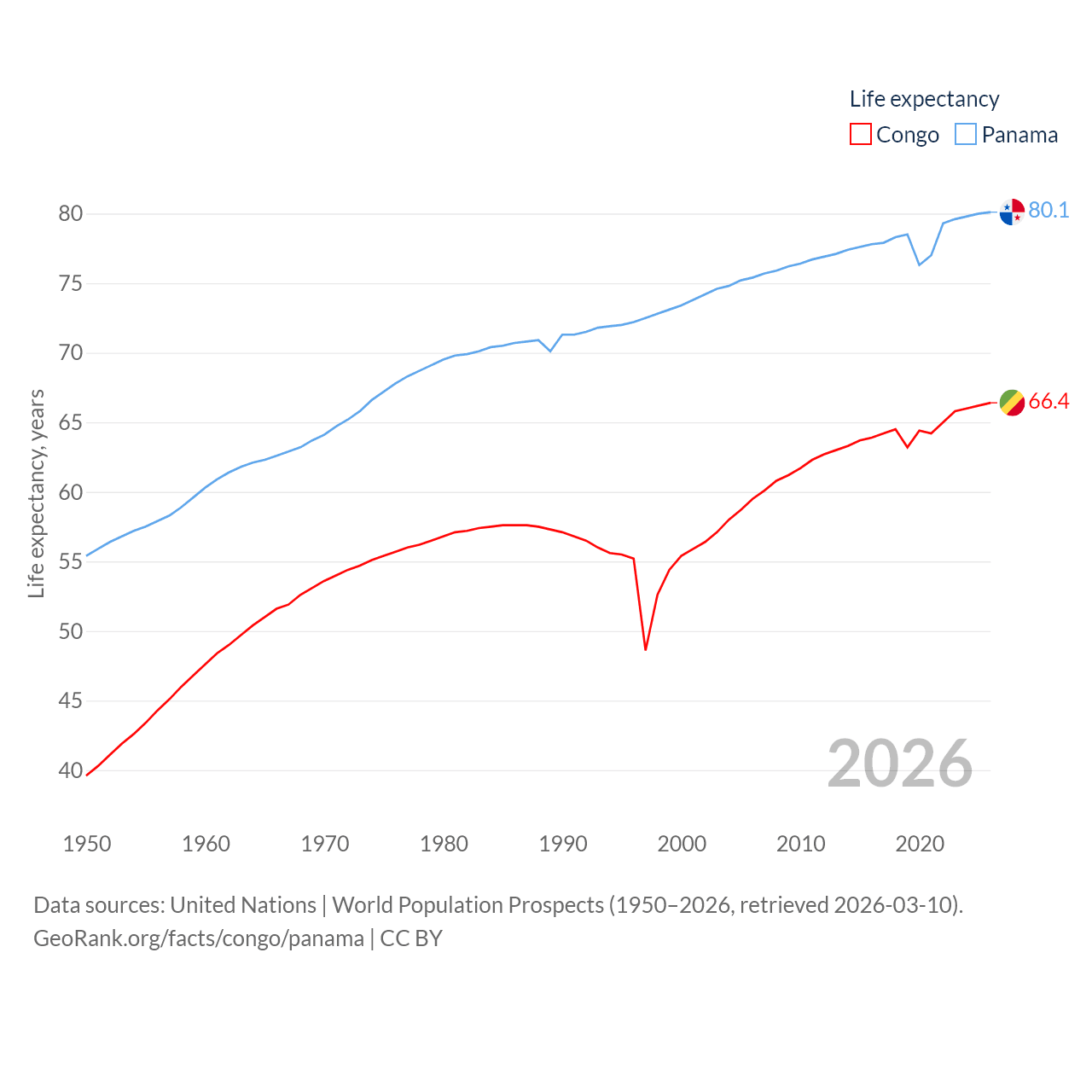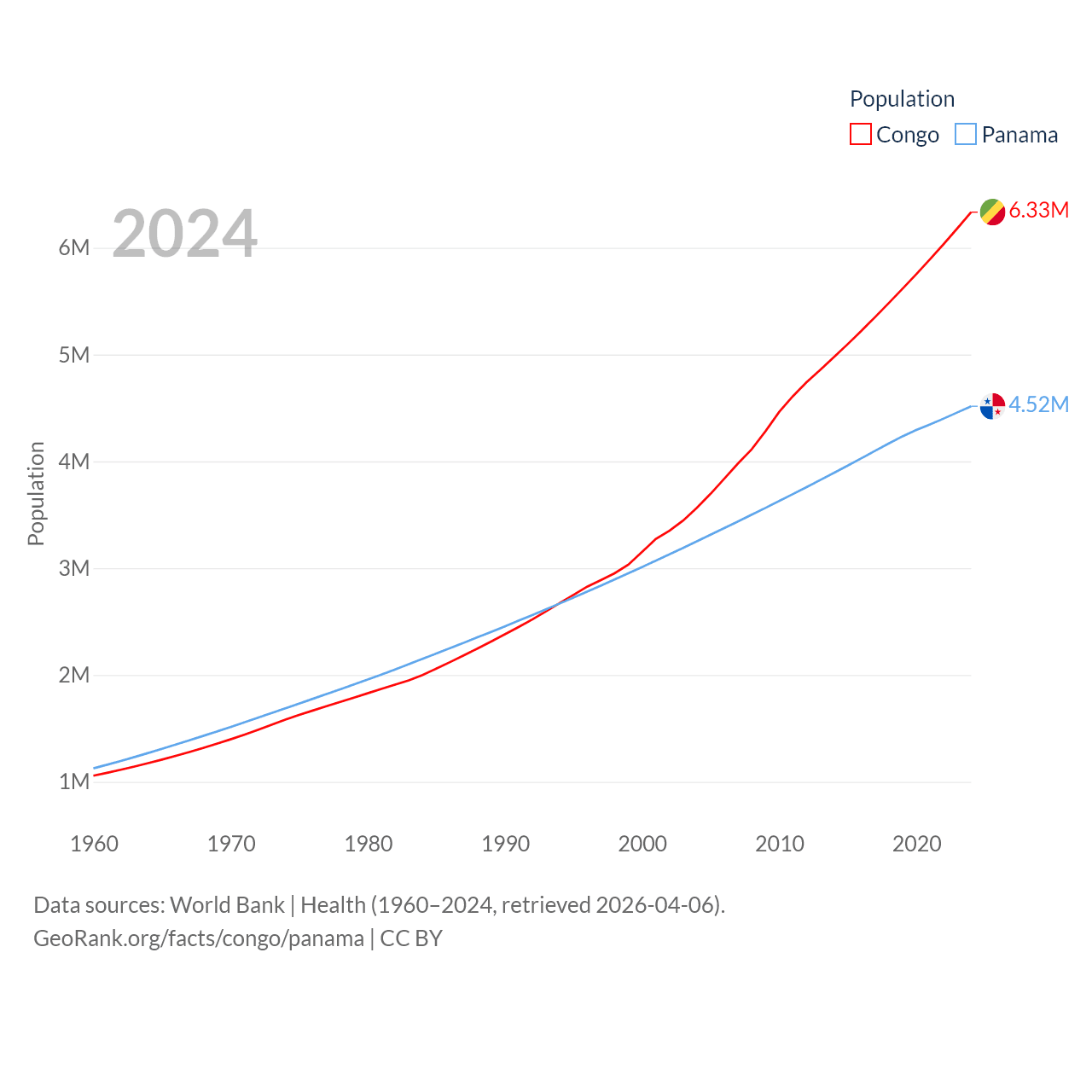 The Congo has a population of 6.33M (ranked 112/197), compared with 4.52M in Panama (ranked 128/197). The Congo's land area is 131,854 sq mi versus 28,641 sq mi for Panama (ranked 64th vs. 115th).