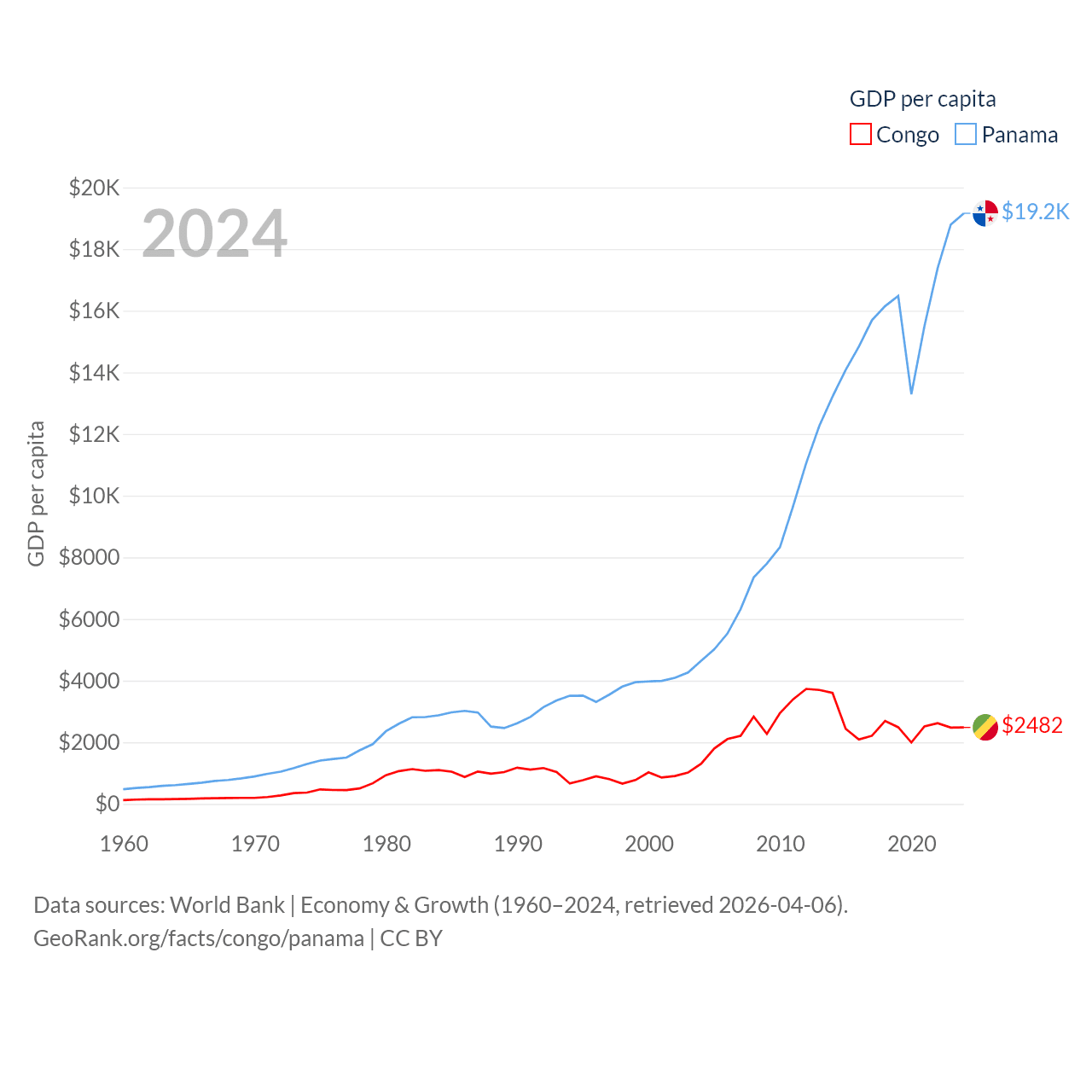 By GDP, The Congo ranks 141/197 ($15.7B) and Panama ranks 78/197 ($86.5B). By GDP per capita, The Congo ranks 149/197 ($2,482), while Panama ranks 60/197 ($19,161).