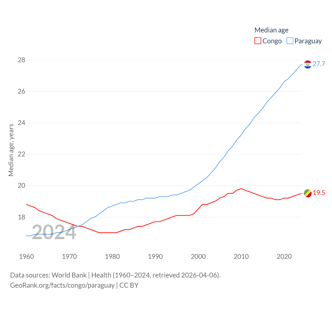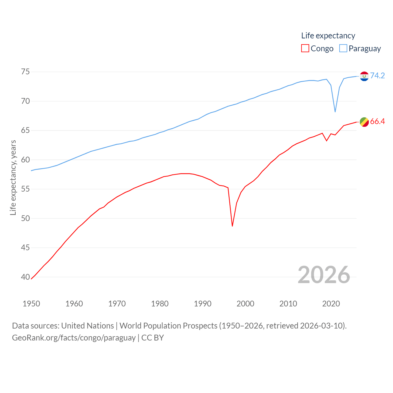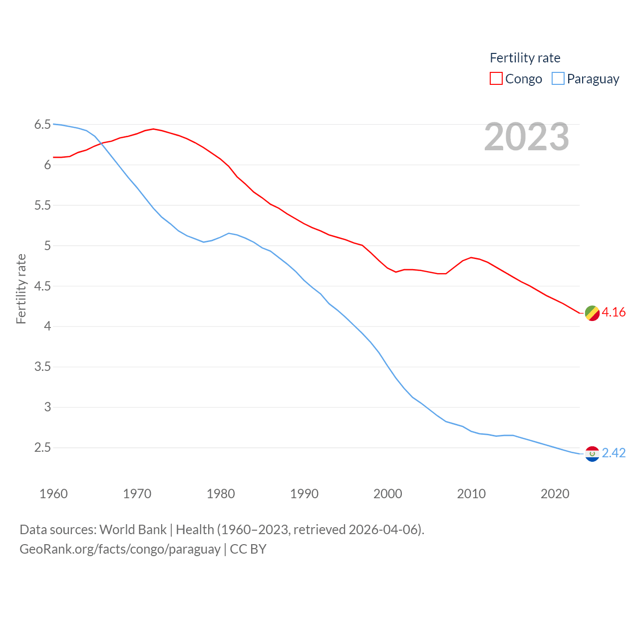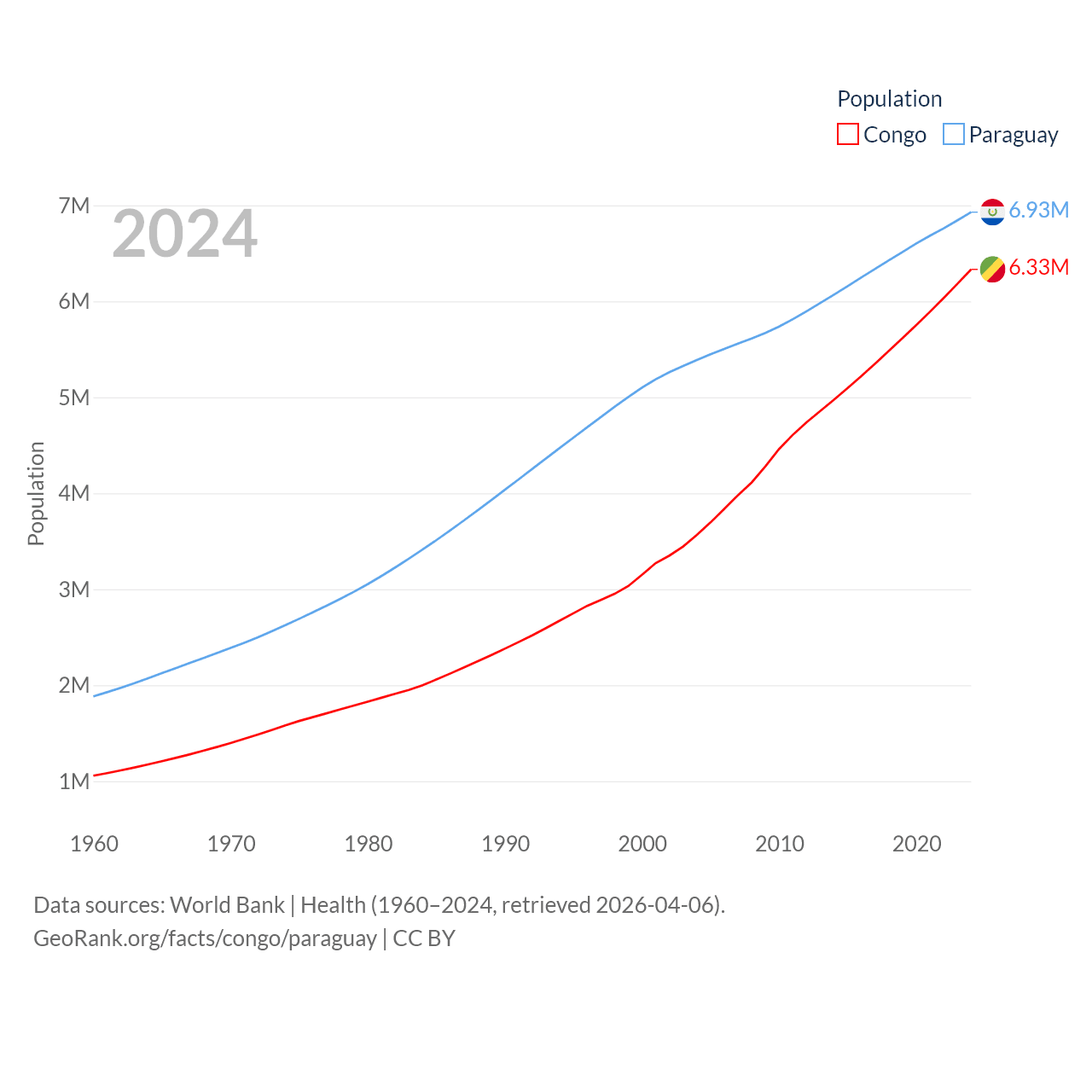 The Congo has a population of 6.33M (ranked 112/197), compared with 6.93M in Paraguay (ranked 107/197). The Congo's land area is 131,854 sq mi versus 152,901 sq mi for Paraguay (ranked 64th vs. 59th).