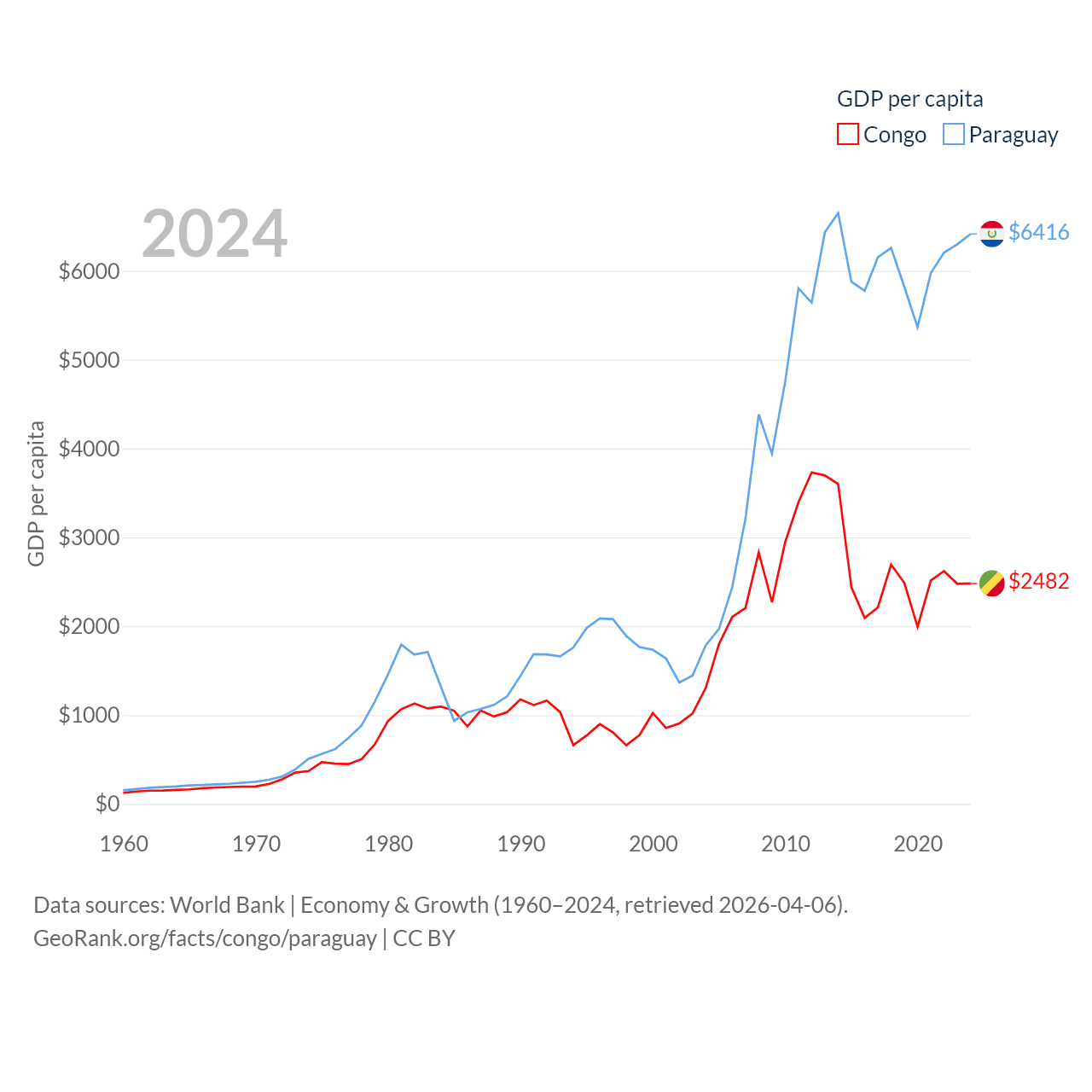 By GDP, The Congo ranks 141/197 ($15.7B) and Paraguay ranks 98/197 ($44.5B). By GDP per capita, The Congo ranks 149/197 ($2,482), while Paraguay ranks 109/197 ($6,416).