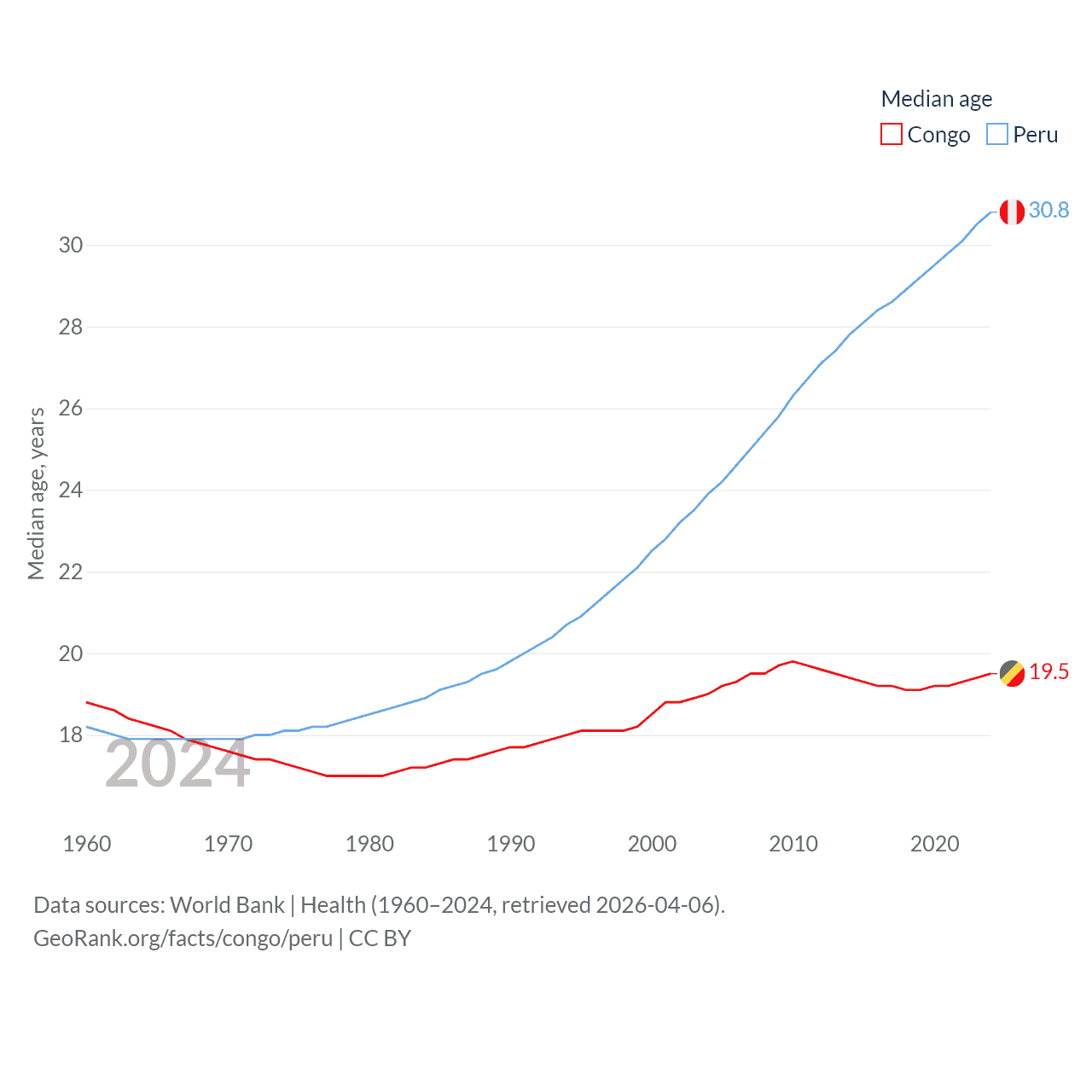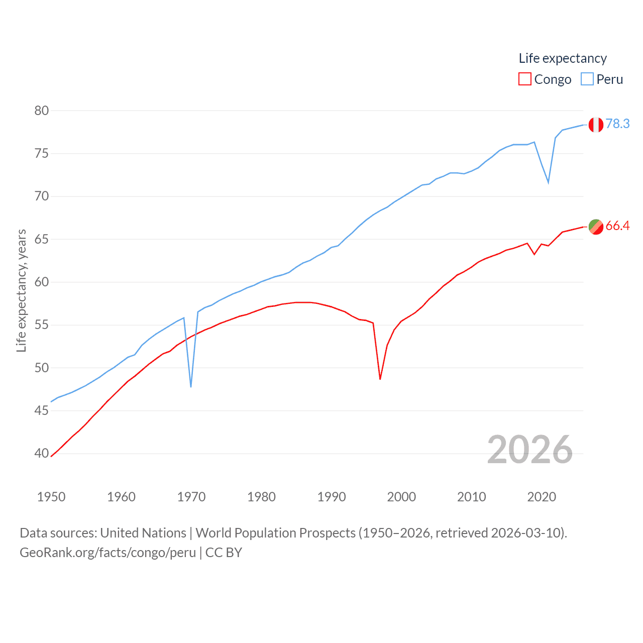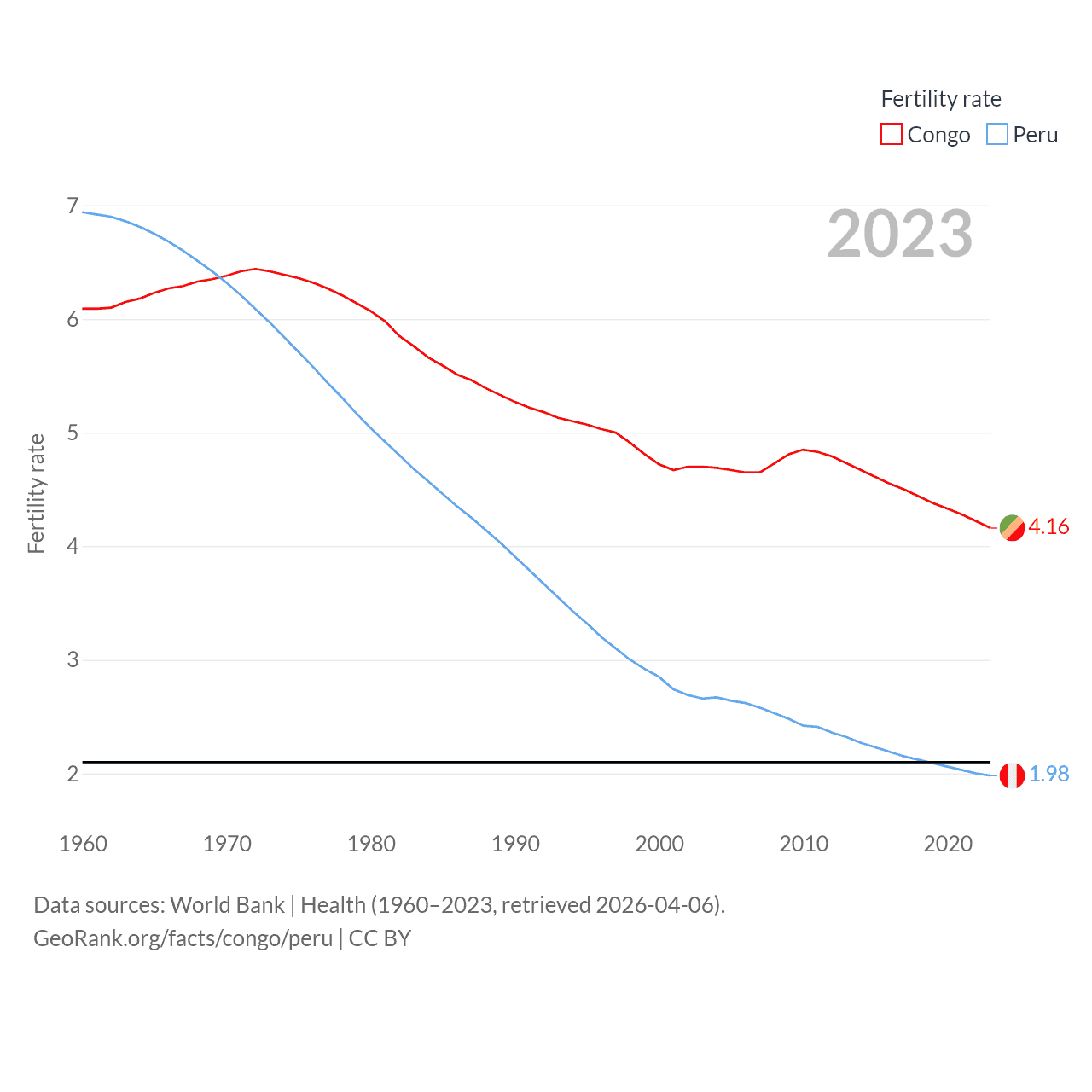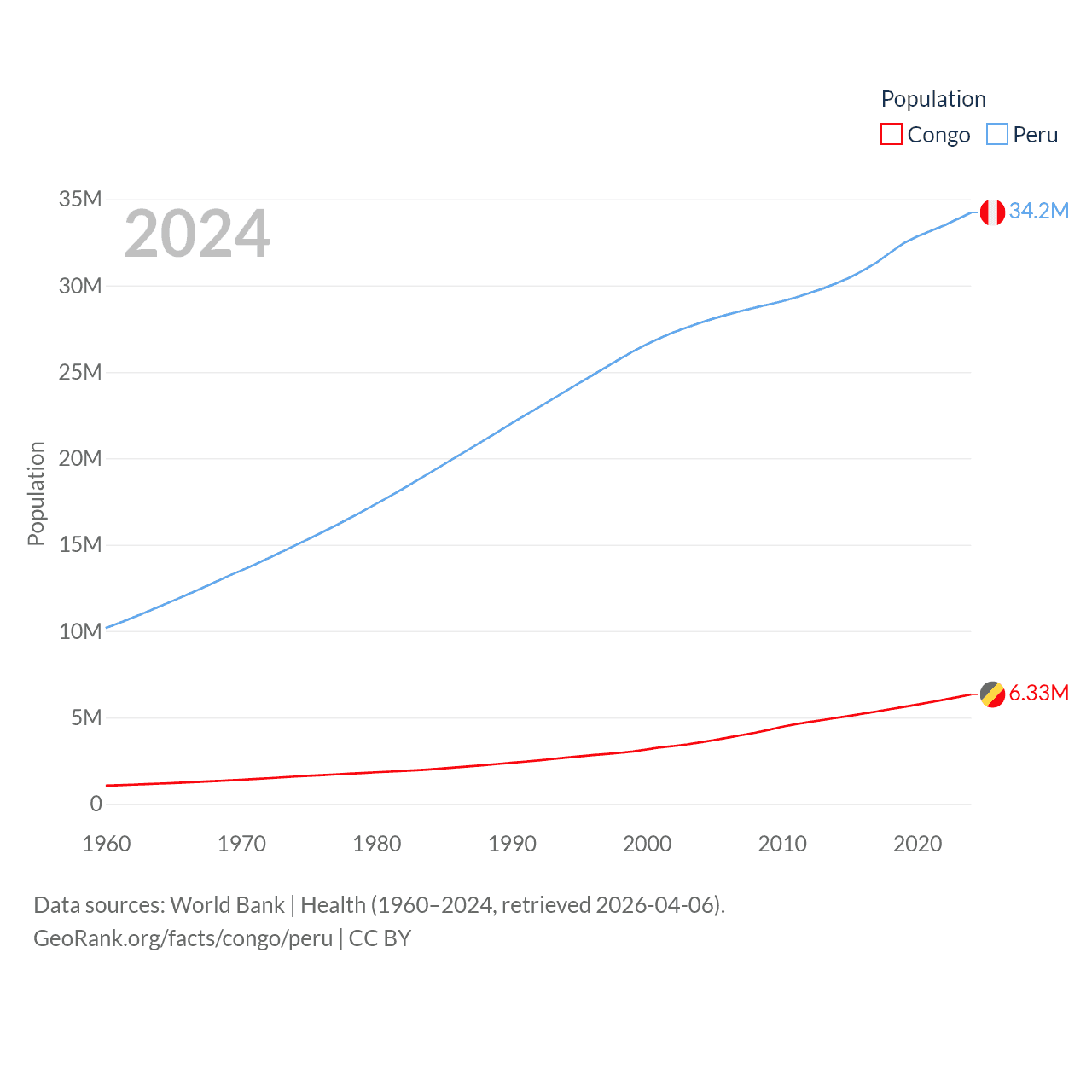 The Congo has a population of 6.33M (ranked 112/197), compared with 34.2M in Peru (ranked 48/197). The Congo's land area is 131,854 sq mi versus 494,211 sq mi for Peru (ranked 64th vs. 19th).