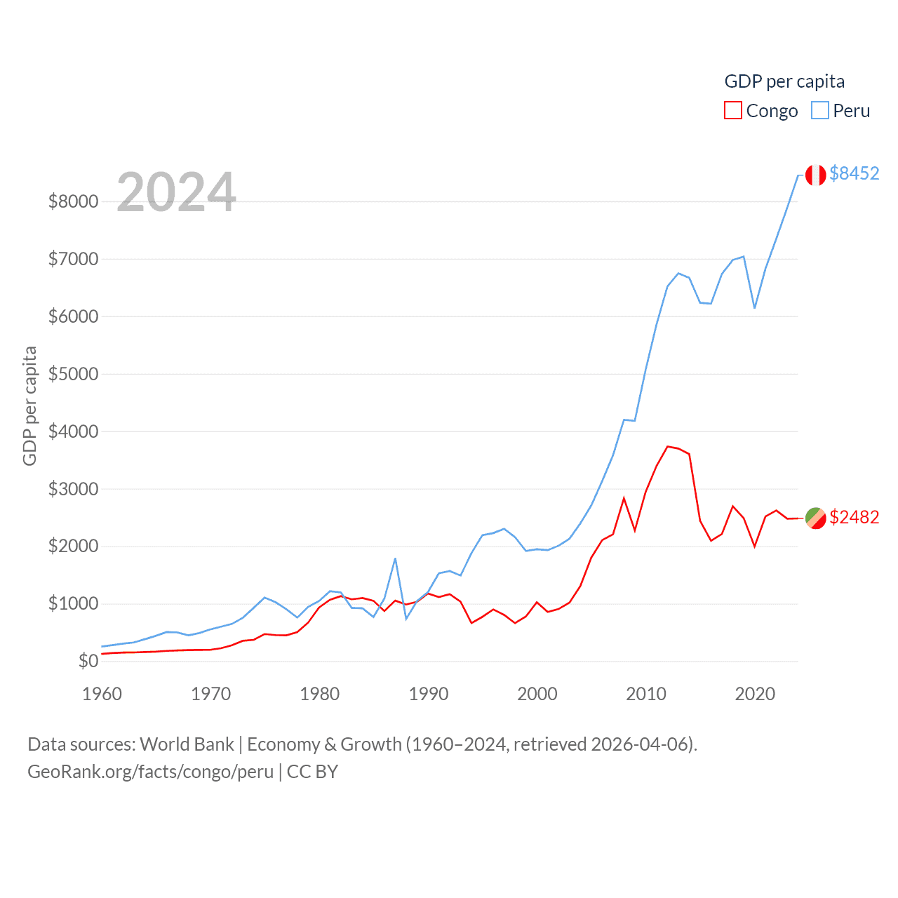 By GDP, The Congo ranks 141/197 ($15.7B) and Peru ranks 49/197 ($289B). By GDP per capita, The Congo ranks 149/197 ($2,482), while Peru ranks 91/197 ($8,452).