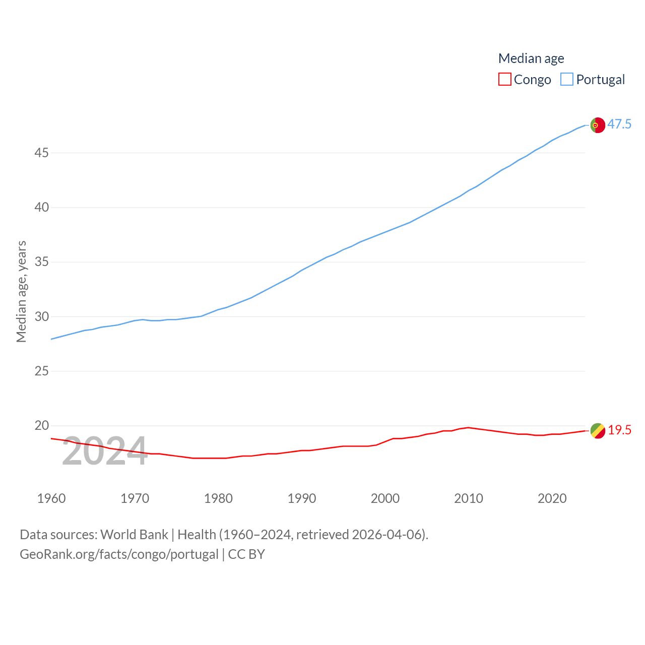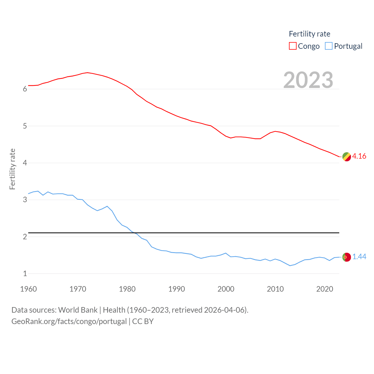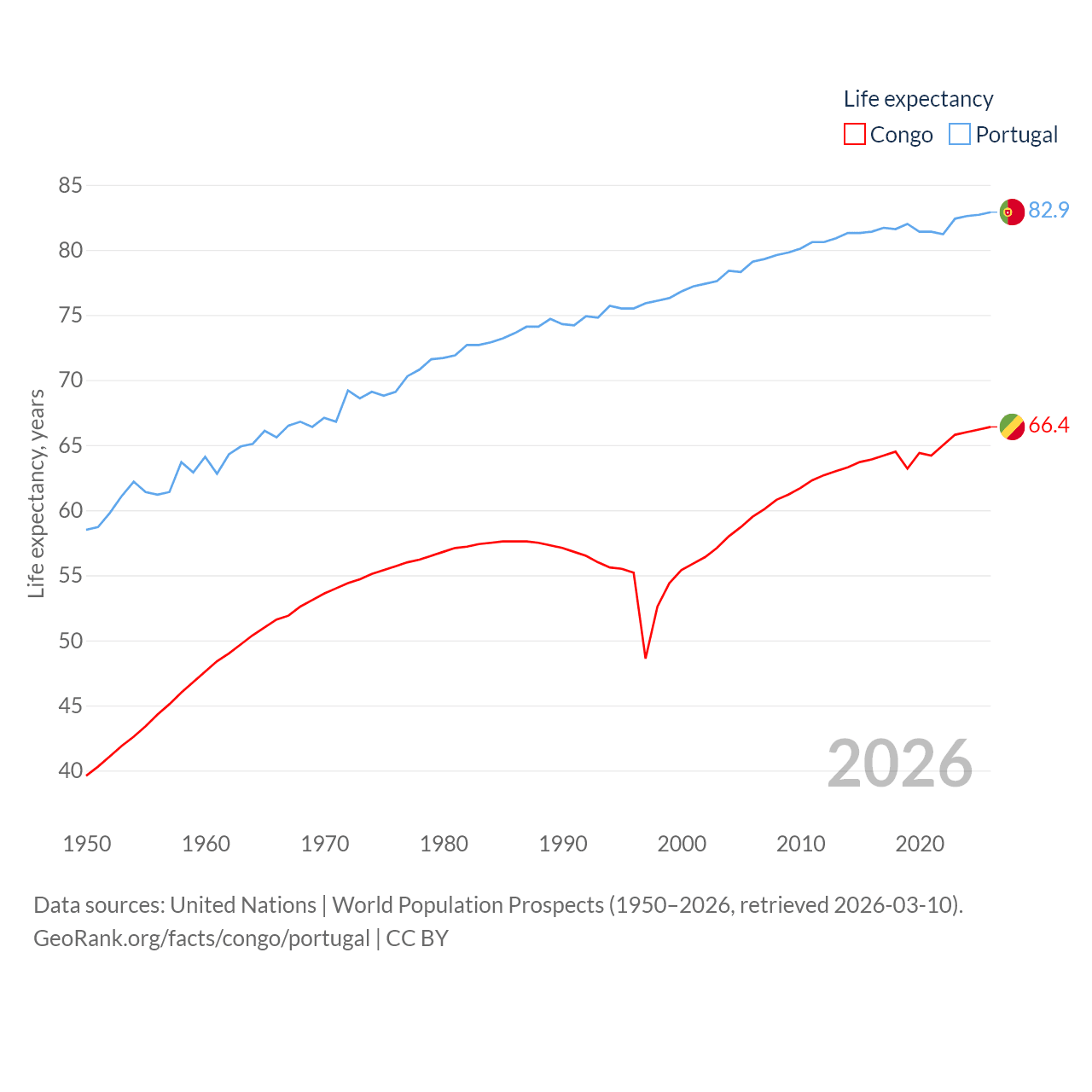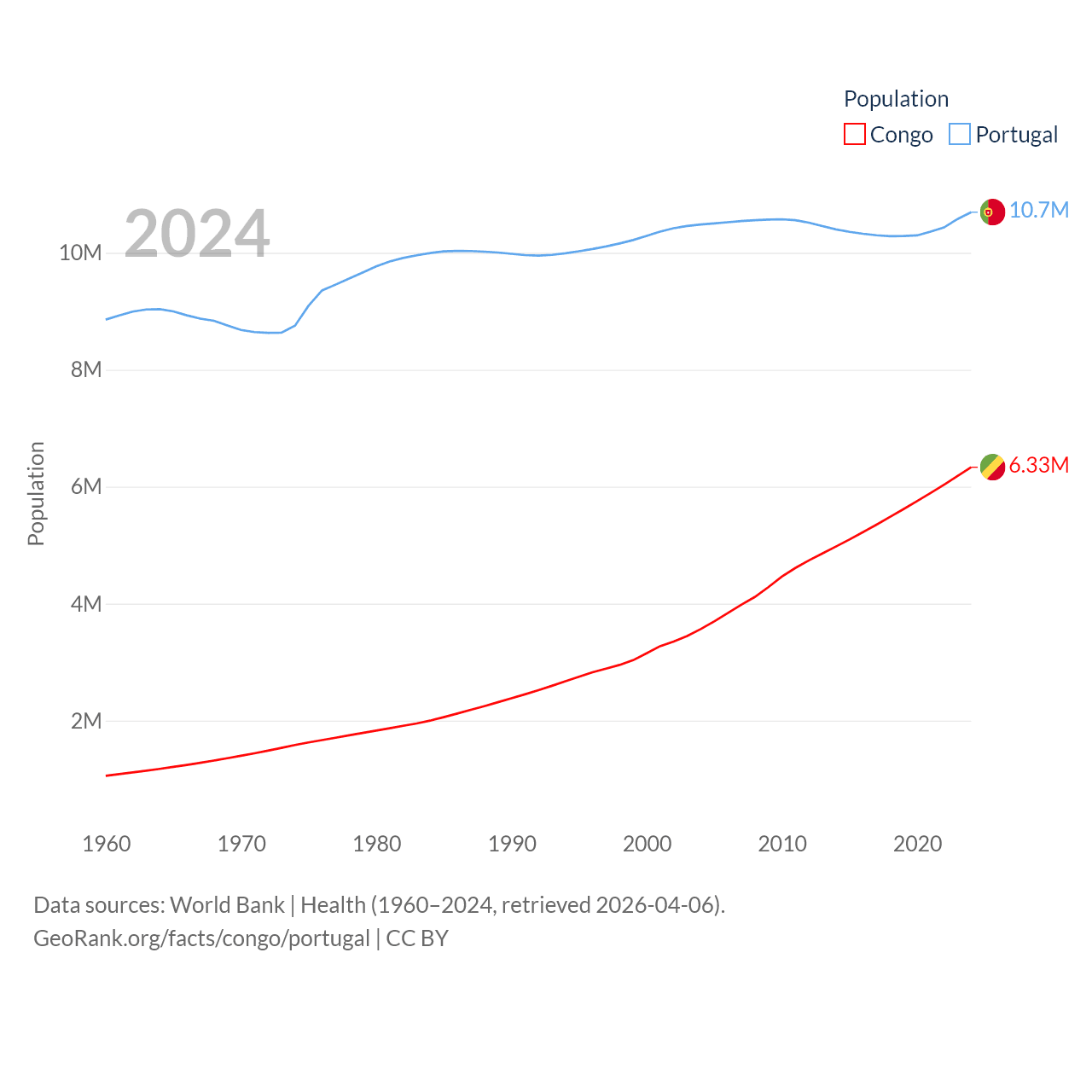 The Congo has a population of 6.33M (ranked 112/197), compared with 10.7M in Portugal (ranked 90/197). The Congo's land area is 131,854 sq mi versus 35,369 sq mi for Portugal (ranked 64th vs. 108th).