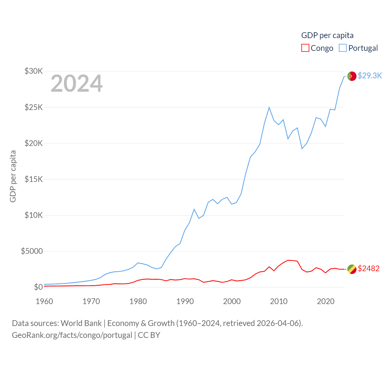 By GDP, The Congo ranks 141/197 ($15.7B) and Portugal ranks 46/197 ($313B). By GDP per capita, The Congo ranks 149/197 ($2,482), while Portugal ranks 44/197 ($29,292).