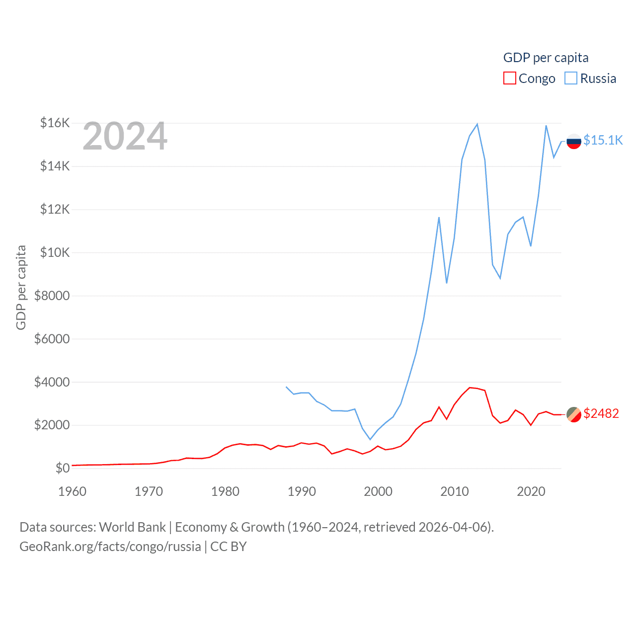 By GDP, The Congo ranks 141/197 ($15.7B) and Russia ranks 11/197 ($2.17T). By GDP per capita, The Congo ranks 149/197 ($2,482), while Russia ranks 68/197 ($15,145).