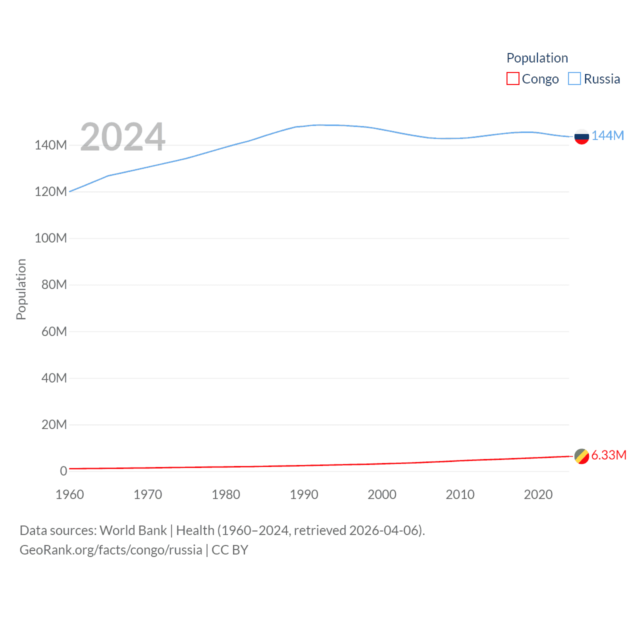 The Congo has a population of 6.33M (ranked 112/197), compared with 144M in Russia (ranked 9/197). The Congo's land area is 131,854 sq mi versus 6,323,145 sq mi for Russia (ranked 64th vs. 1st).