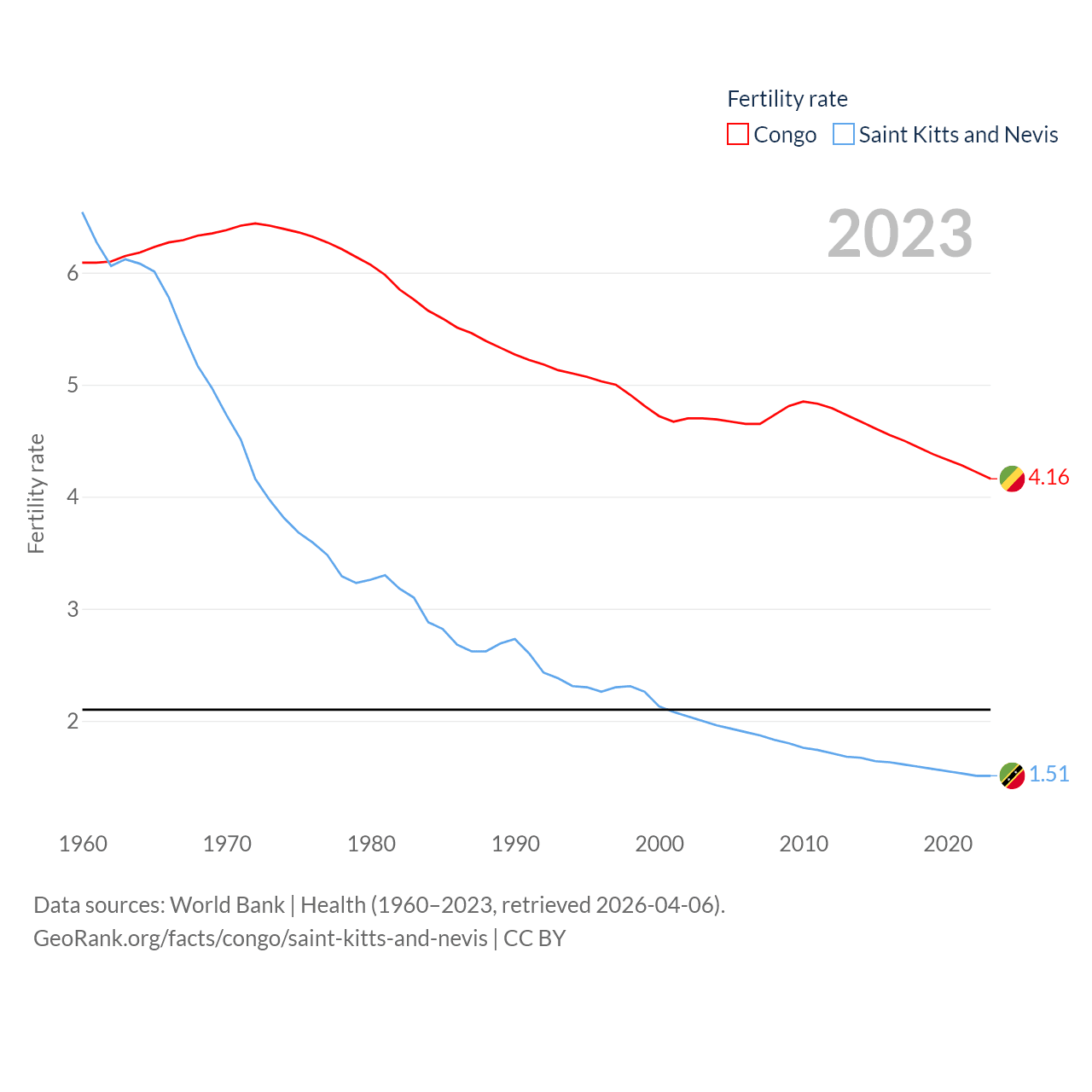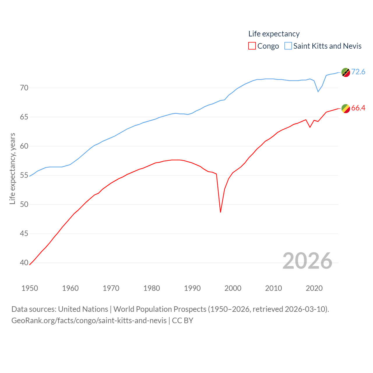 The Congo has a population of 6.33M (ranked 112/197), compared with 46.8K in Saint Kitts and Nevis (ranked 189/197). The Congo's land area is 131,854 sq mi versus 100.4 sq mi for Saint Kitts and Nevis (ranked 64th vs. 189th).