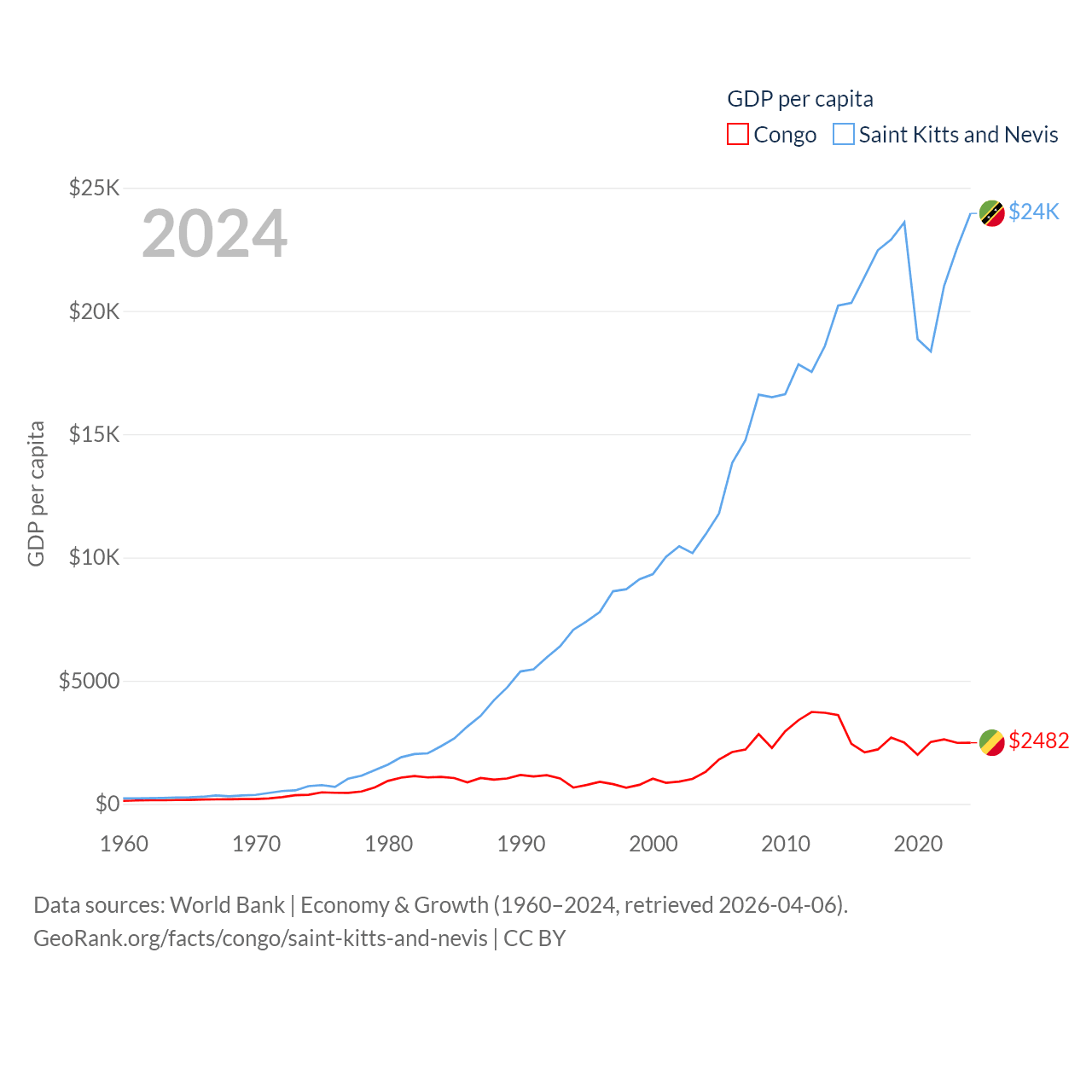 By GDP, The Congo ranks 141/197 ($15.7B) and Saint Kitts and Nevis ranks 187/197 ($1.12B). By GDP per capita, The Congo ranks 149/197 ($2,482), while Saint Kitts and Nevis ranks 51/197 ($23,961).