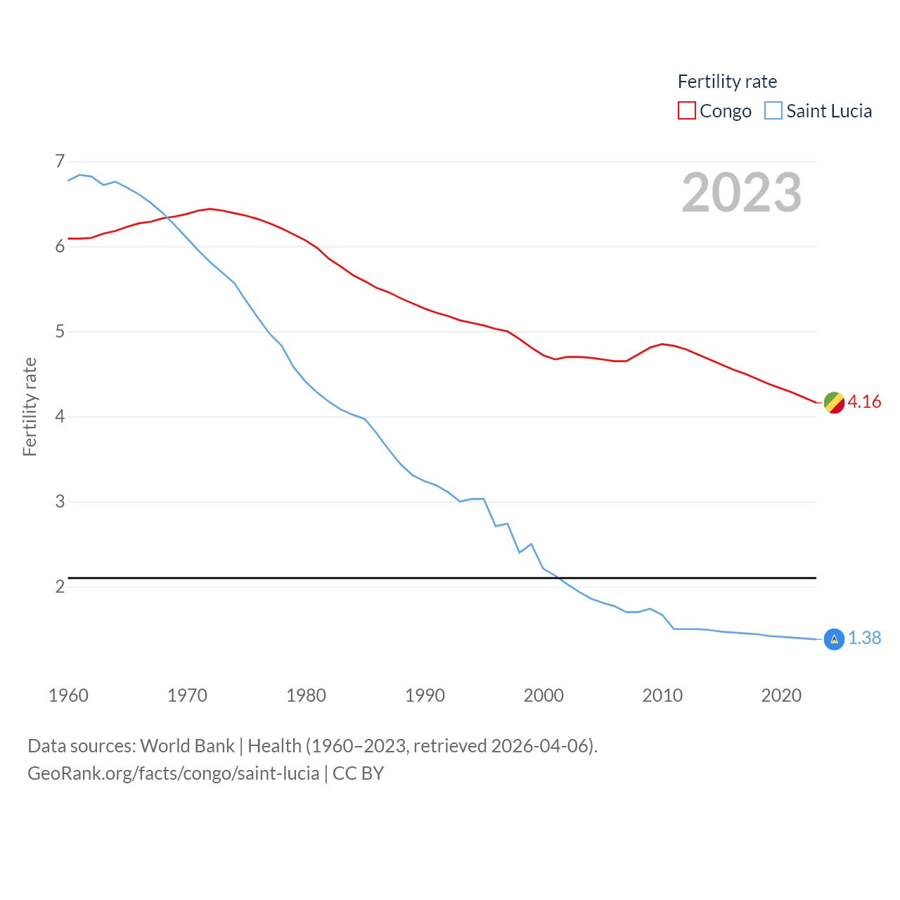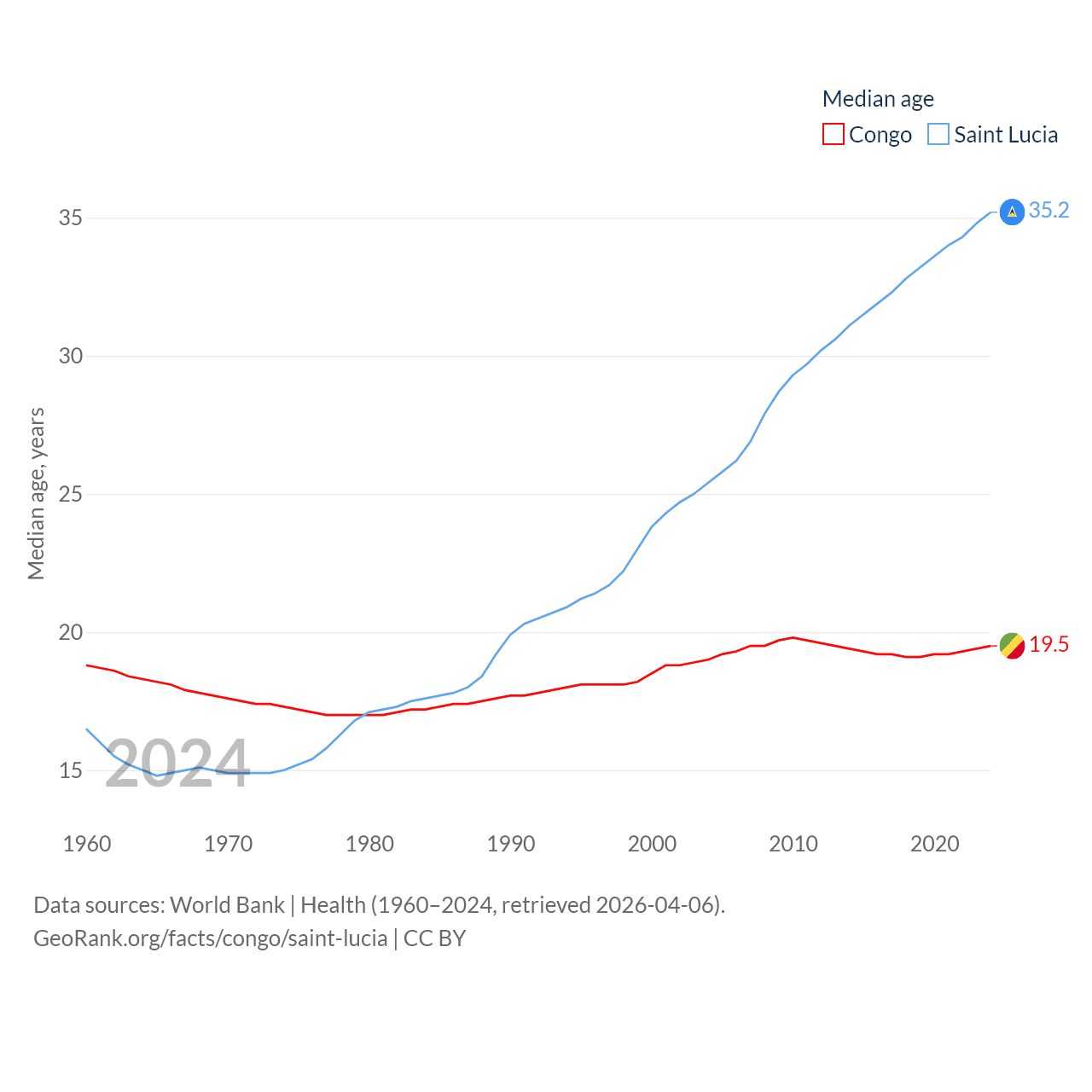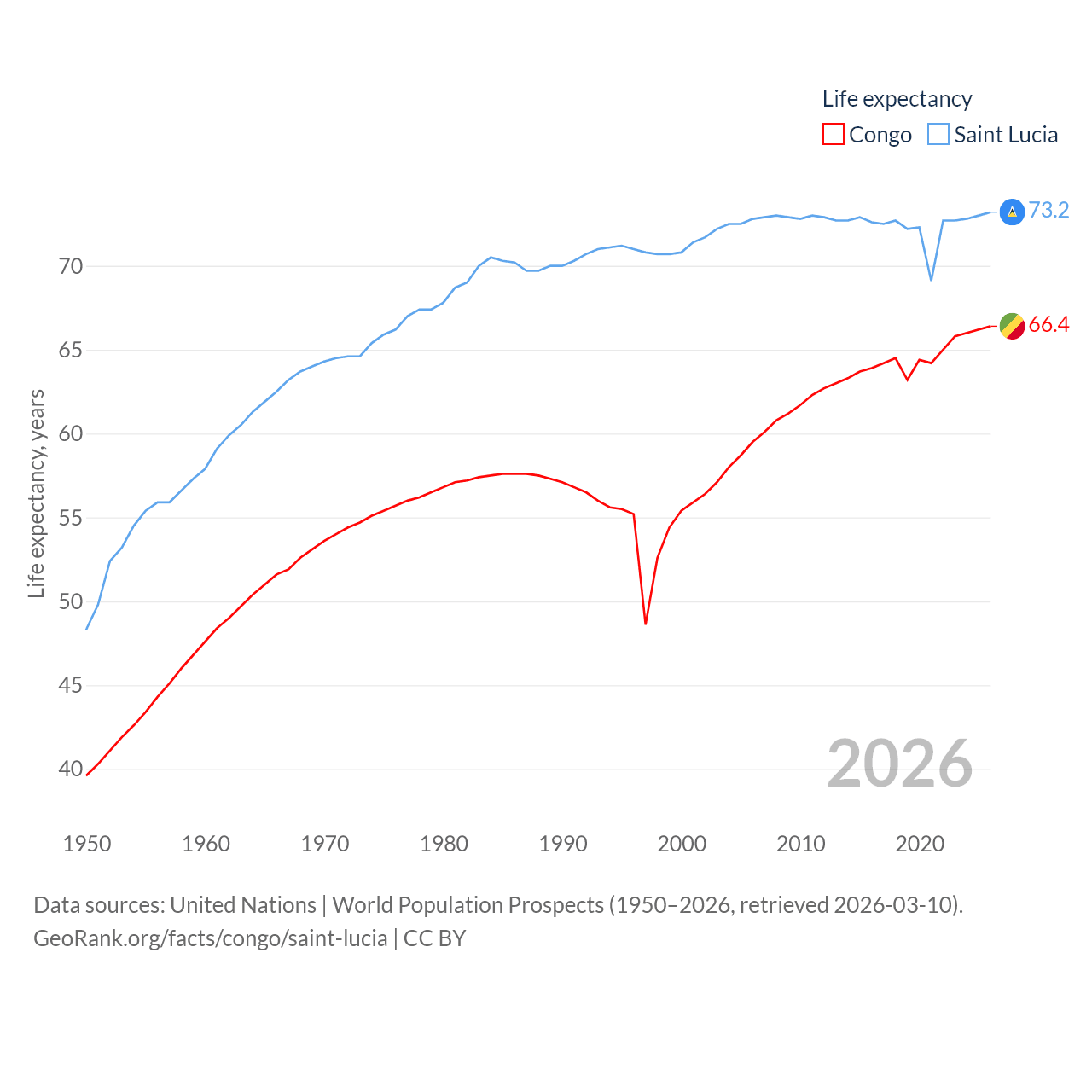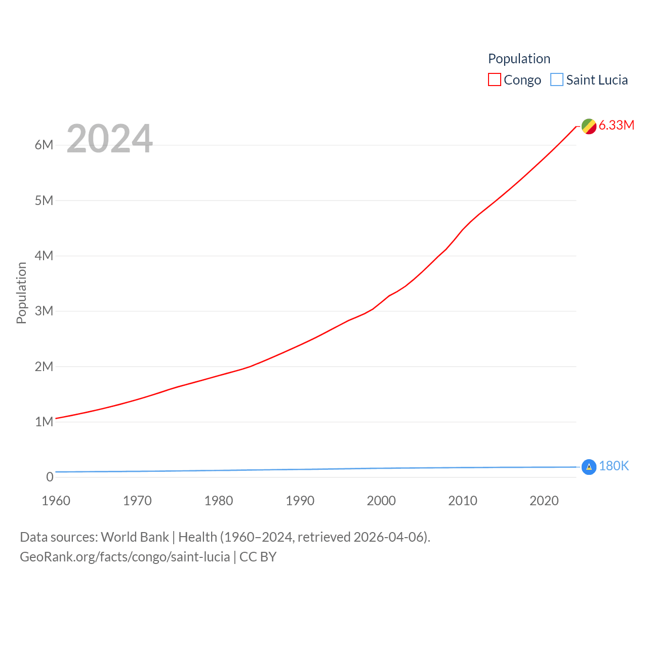 The Congo has a population of 6.33M (ranked 112/197), compared with 180K in Saint Lucia (ranked 178/197). The Congo's land area is 131,854 sq mi versus 235.5 sq mi for Saint Lucia (ranked 64th vs. 178th).