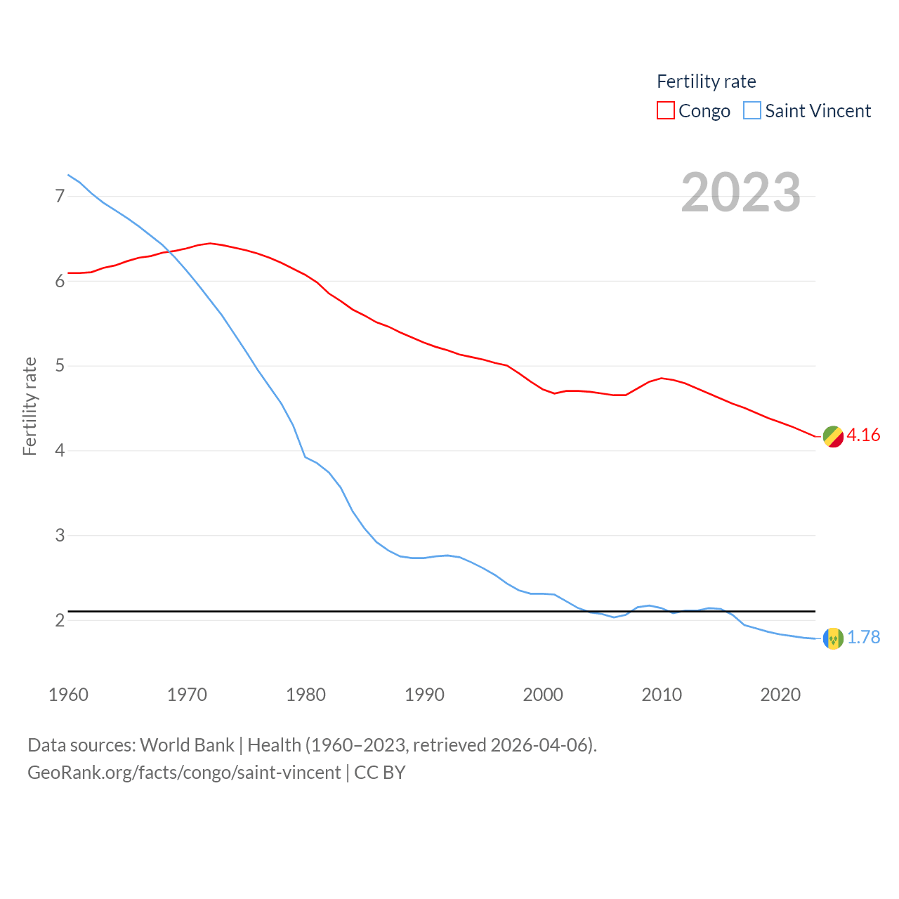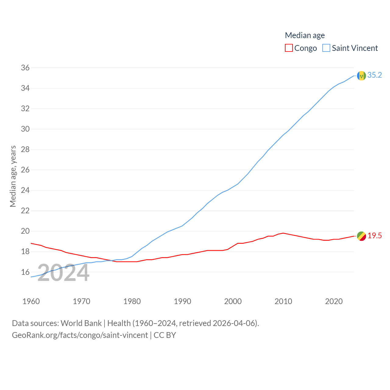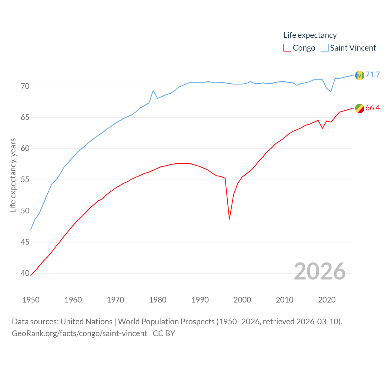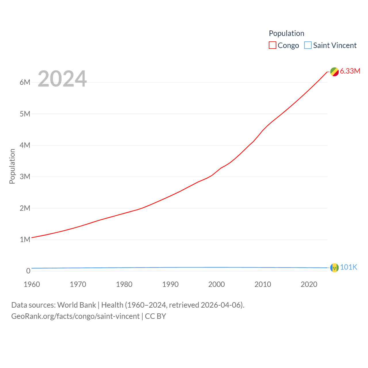 The Congo has a population of 6.33M (ranked 112/197), compared with 101K in Saint Vincent (ranked 184/197). The Congo's land area is 131,854 sq mi versus 150.6 sq mi for Saint Vincent (ranked 64th vs. 185th).