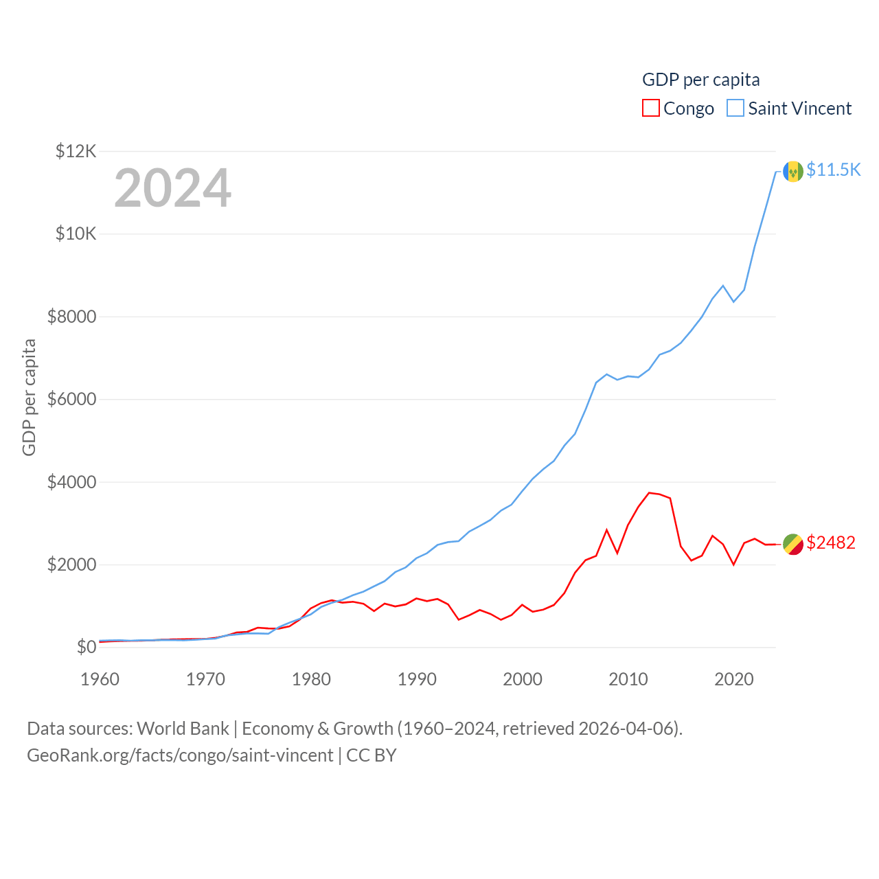 By GDP, The Congo ranks 141/197 ($15.7B) and Saint Vincent ranks 186/197 ($1.16B). By GDP per capita, The Congo ranks 149/197 ($2,482), while Saint Vincent ranks 81/197 ($11,501).
