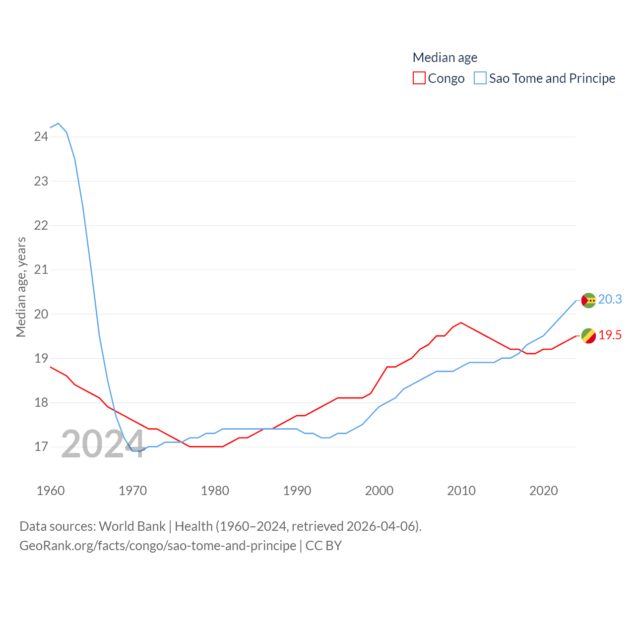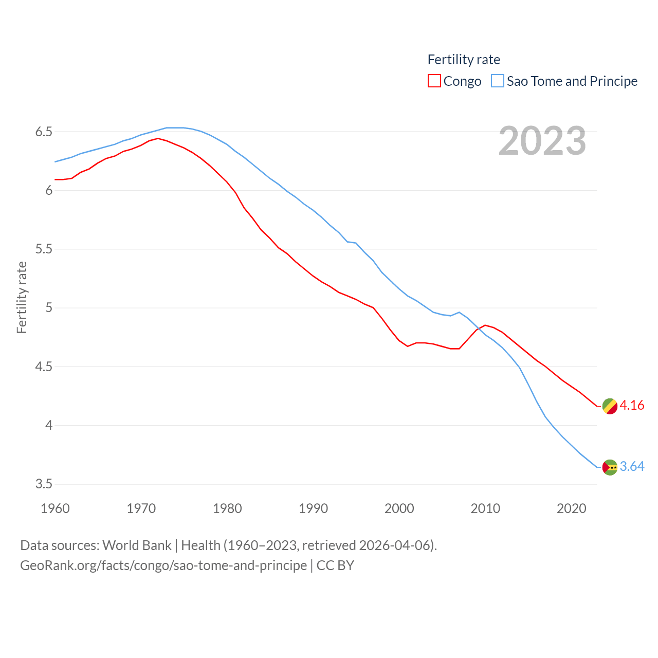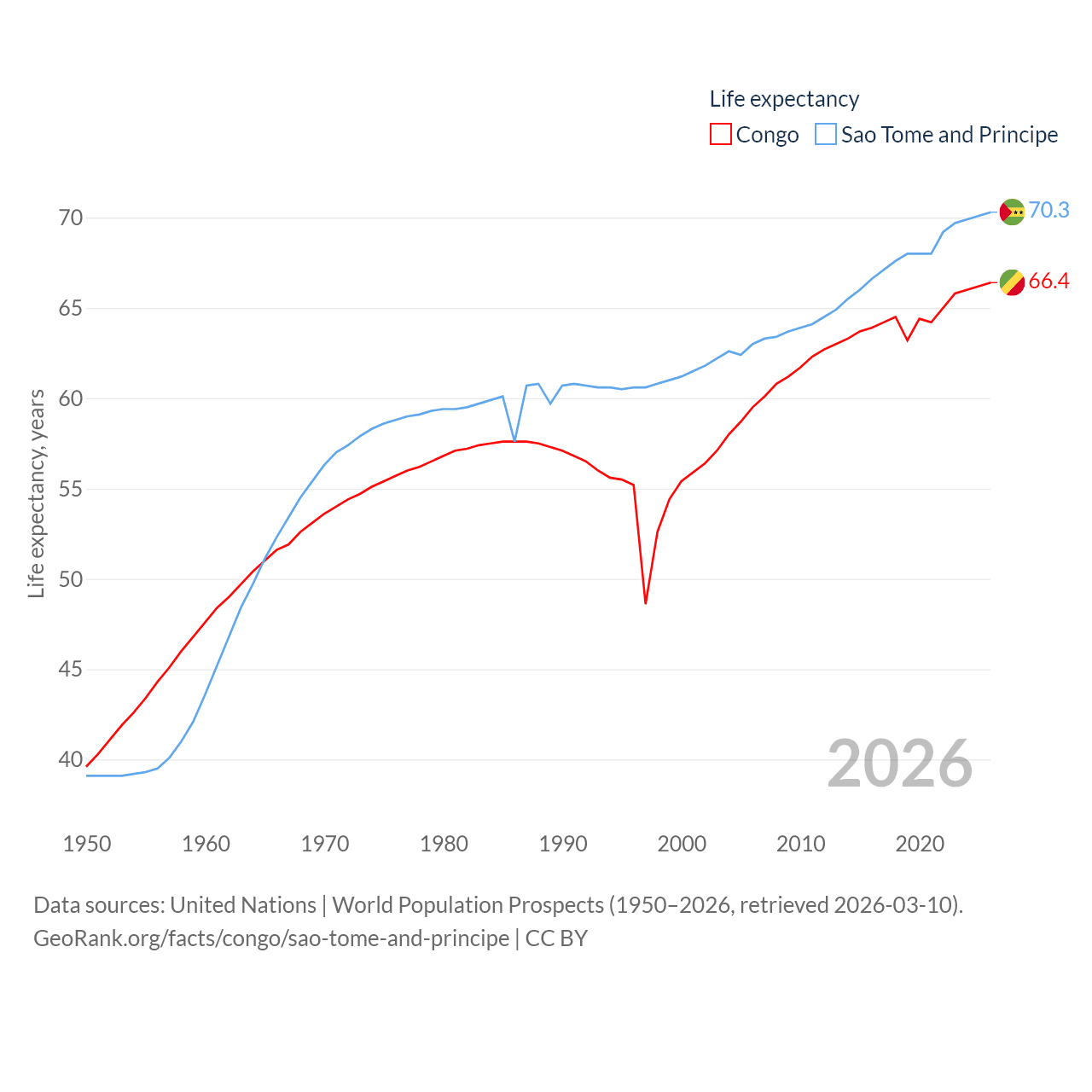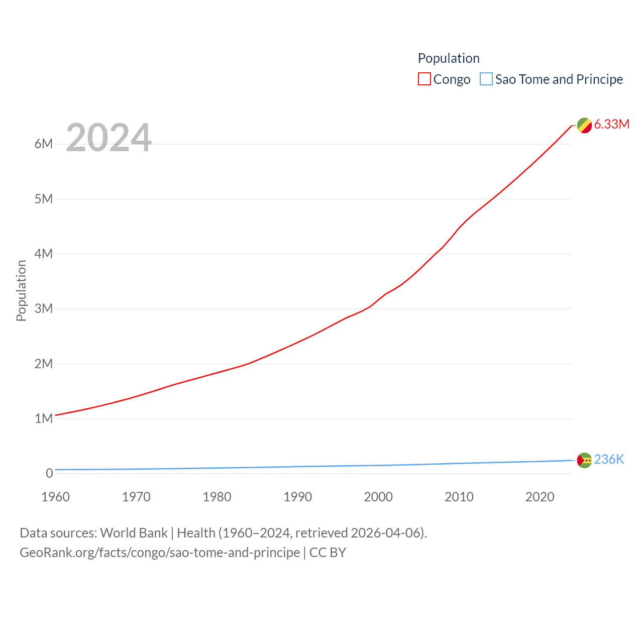 The Congo has a population of 6.33M (ranked 112/197), compared with 236K in Sao Tome and Principe (ranked 176/197). The Congo's land area is 131,854 sq mi versus 371 sq mi for Sao Tome and Principe (ranked 64th vs. 172nd).