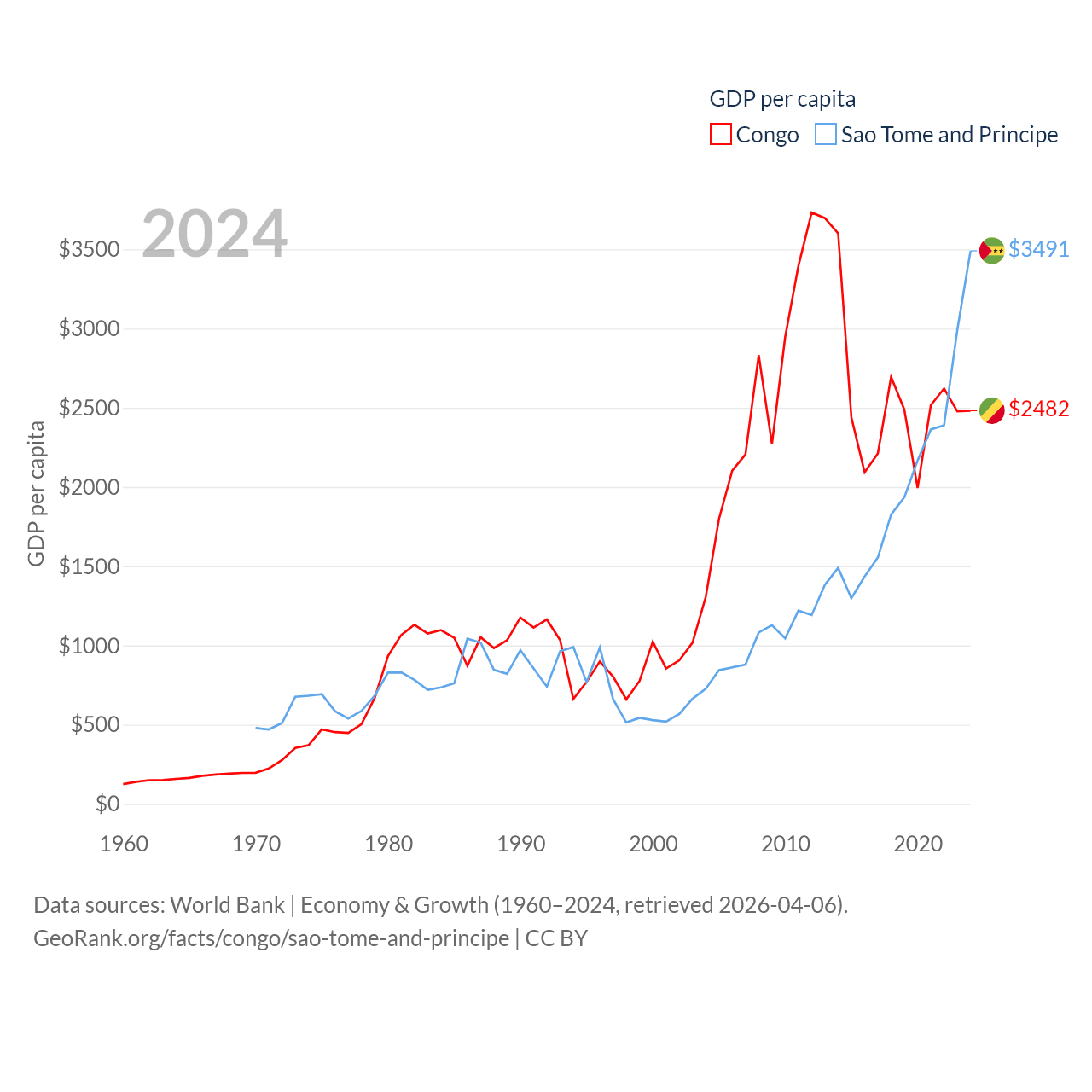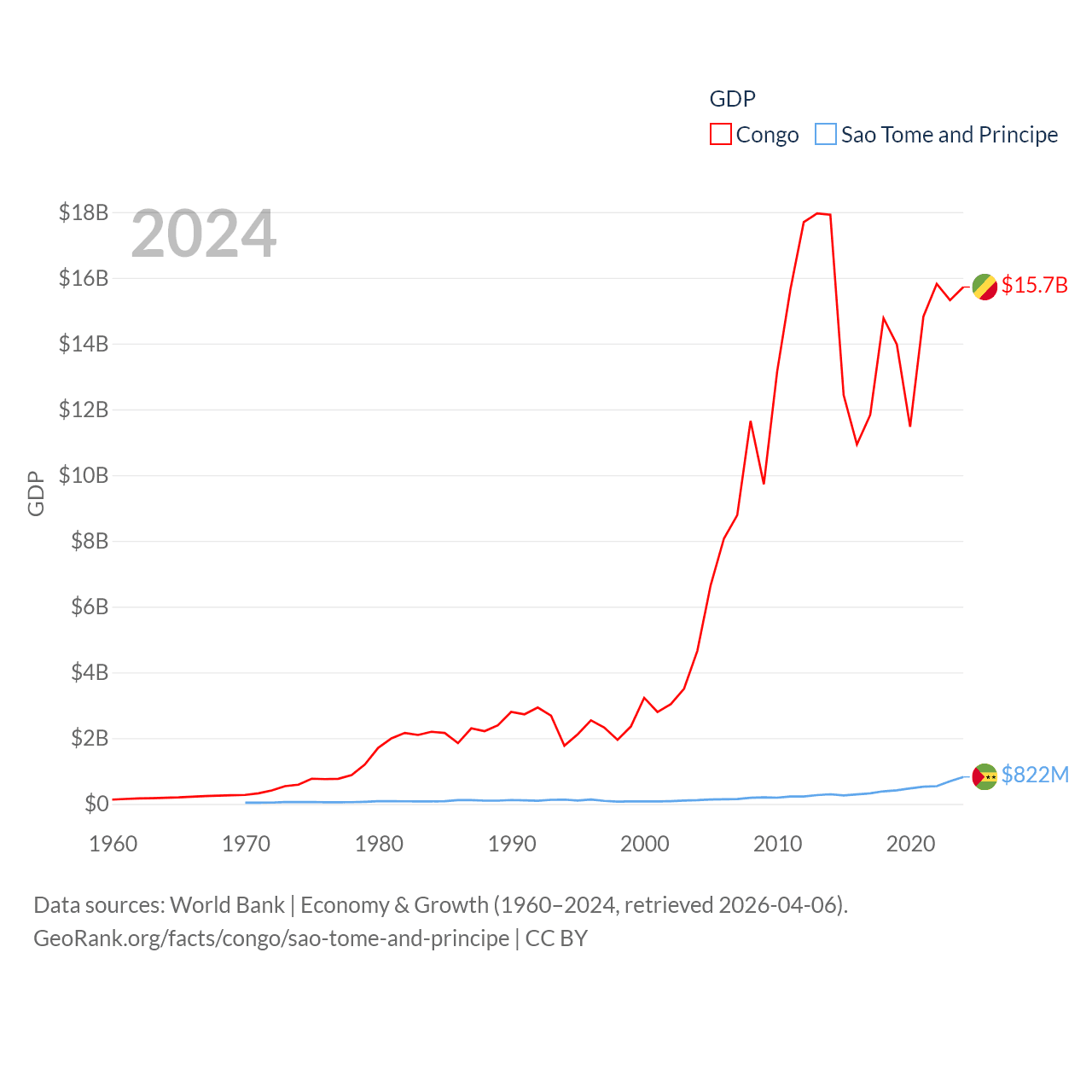 By GDP, The Congo ranks 141/197 ($15.7B) and Sao Tome and Principe ranks 189/197 ($822M). By GDP per capita, The Congo ranks 149/197 ($2,482), while Sao Tome and Principe ranks 134/197 ($3,491).