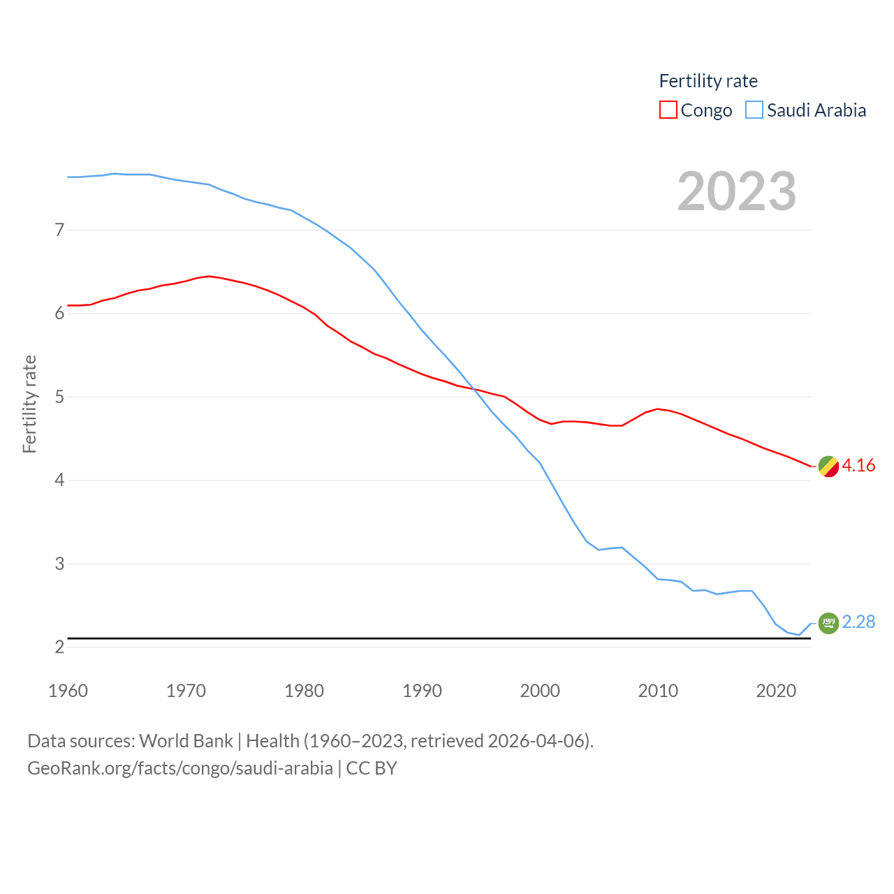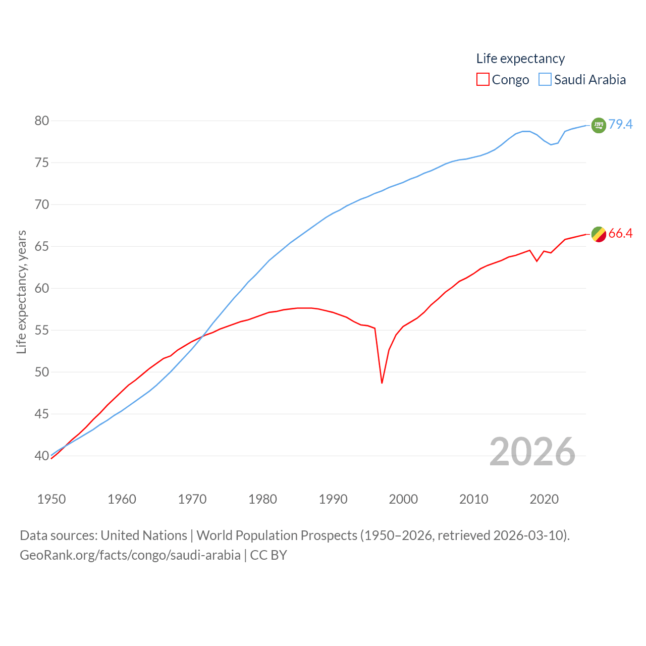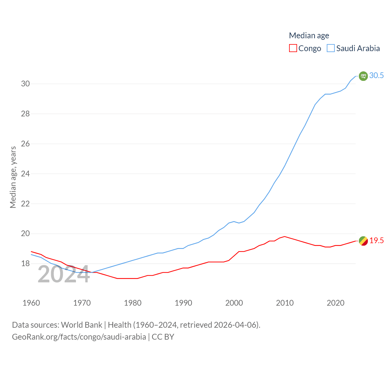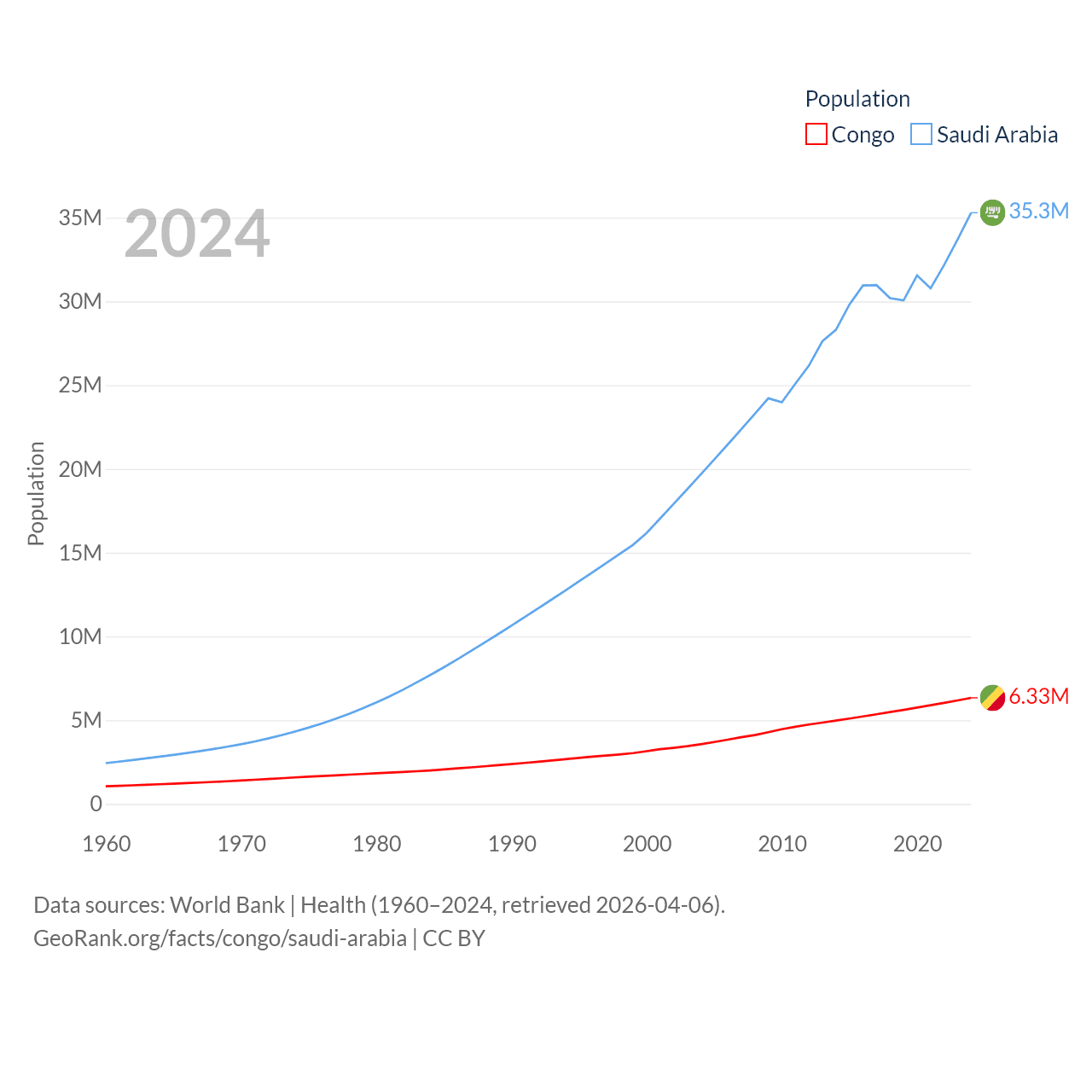 The Congo has a population of 6.33M (ranked 112/197), compared with 35.3M in Saudi Arabia (ranked 45/197). The Congo's land area is 131,854 sq mi versus 830,000 sq mi for Saudi Arabia (ranked 64th vs. 12th).