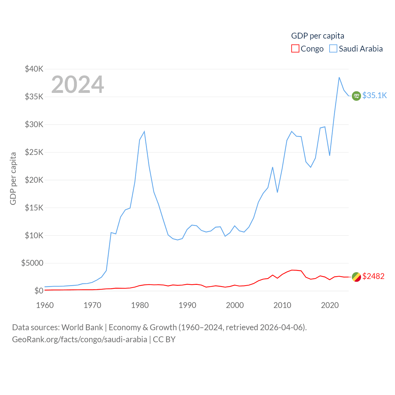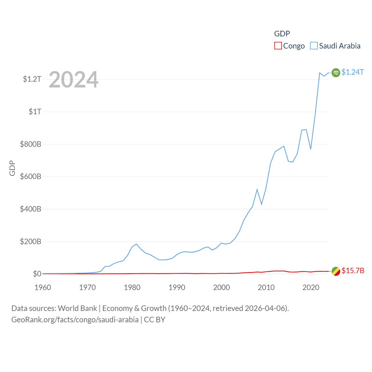 By GDP, The Congo ranks 141/197 ($15.7B) and Saudi Arabia ranks 18/197 ($1.24T). By GDP per capita, The Congo ranks 149/197 ($2,482), while Saudi Arabia ranks 33/197 ($35,122).