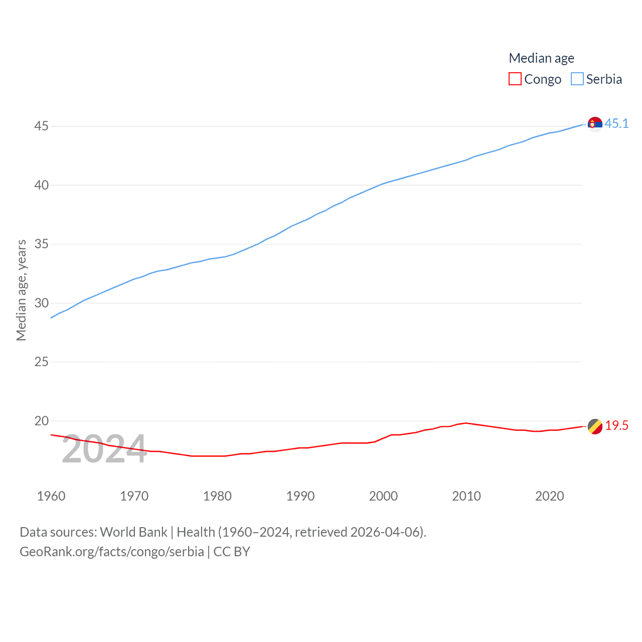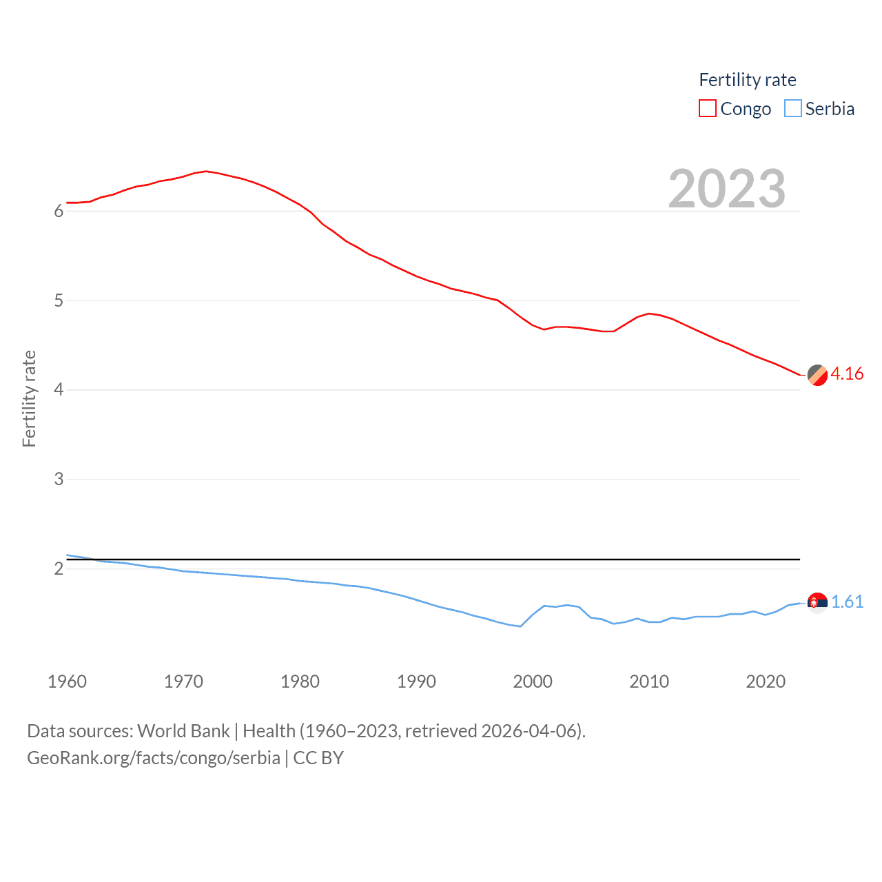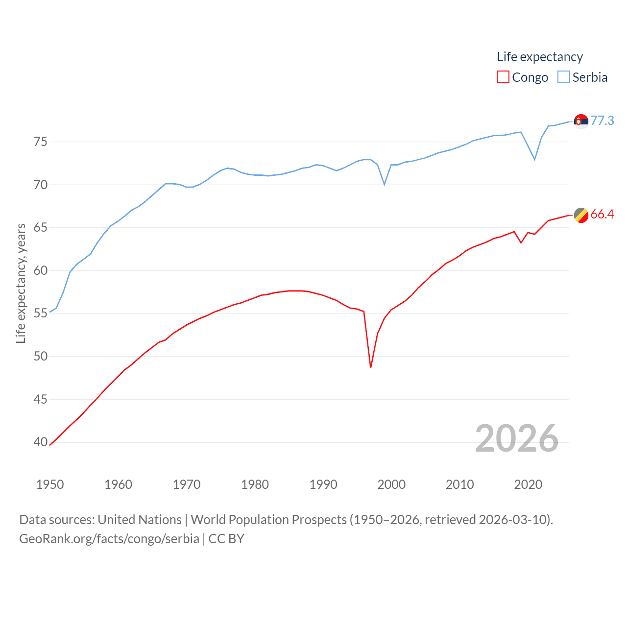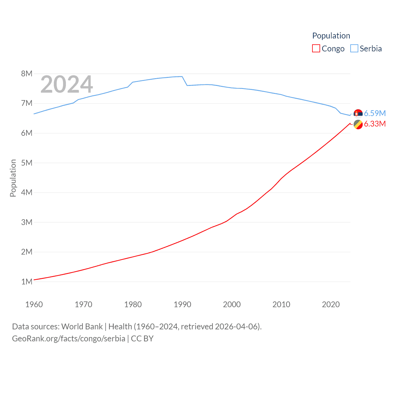 The Congo has a population of 6.33M (ranked 112/197), compared with 6.59M in Serbia (ranked 109/197). The Congo's land area is 131,854 sq mi versus 32,467 sq mi for Serbia (ranked 64th vs. 111th).