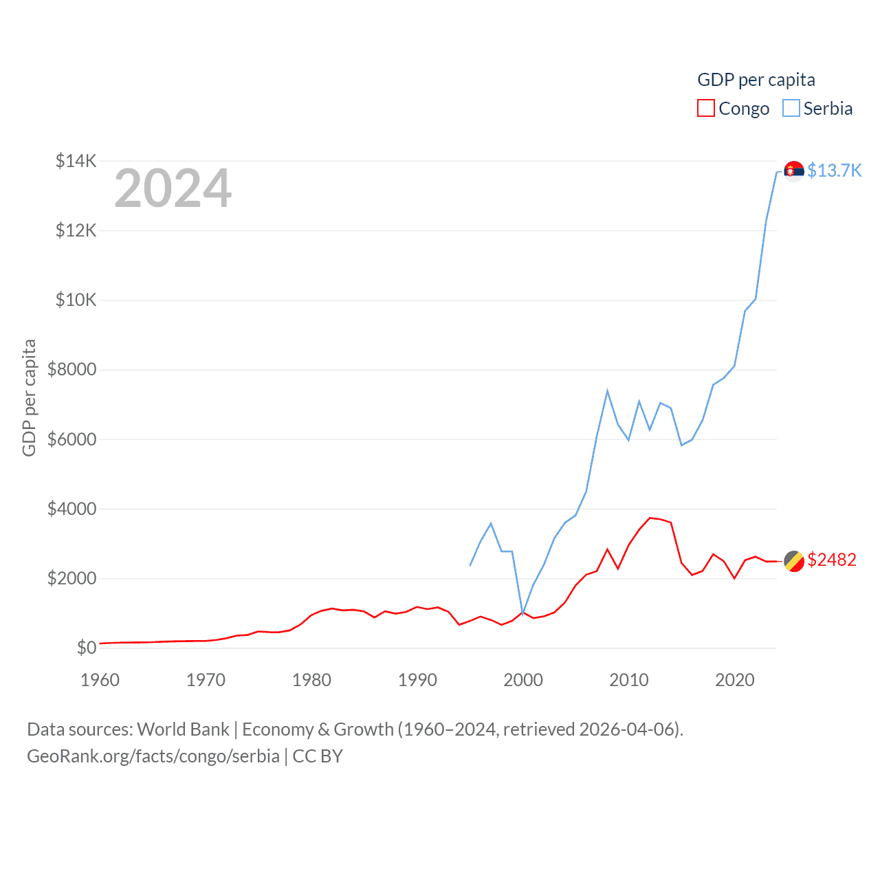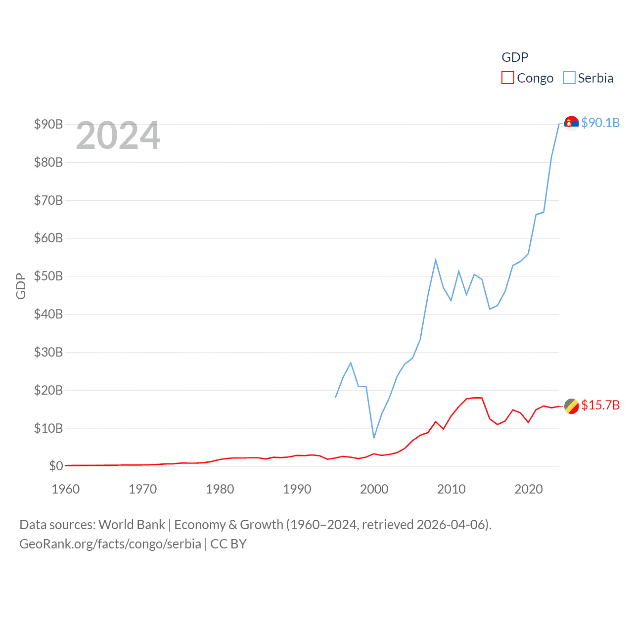 By GDP, The Congo ranks 141/197 ($15.7B) and Serbia ranks 76/197 ($90.1B). By GDP per capita, The Congo ranks 149/197 ($2,482), while Serbia ranks 73/197 ($13,679).
