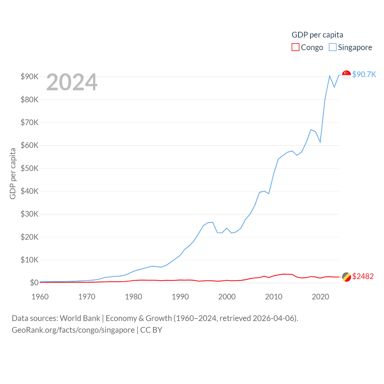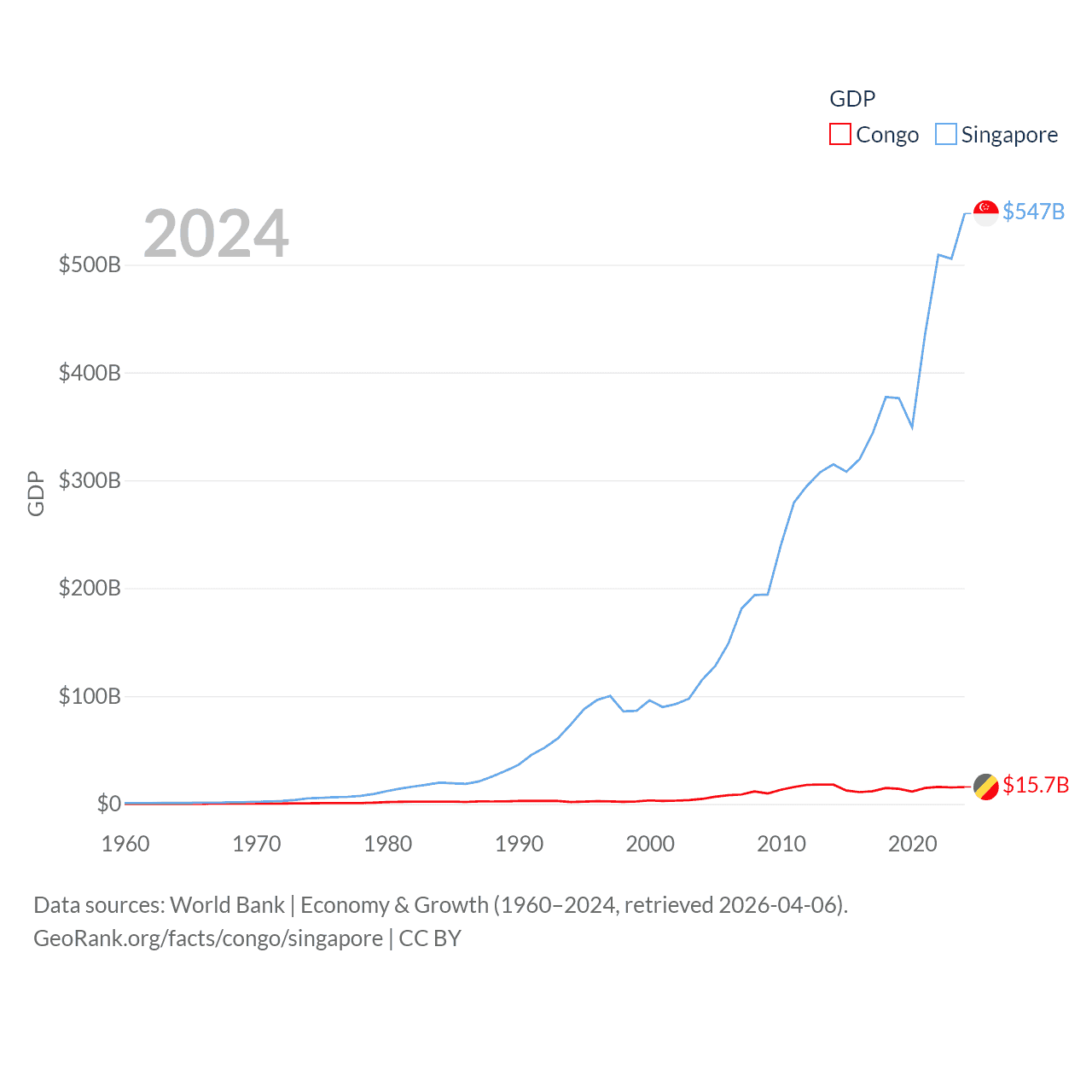 By GDP, The Congo ranks 141/197 ($15.7B) and Singapore ranks 28/197 ($547B). By GDP per capita, The Congo ranks 149/197 ($2,482), while Singapore ranks 7/197 ($90,674).