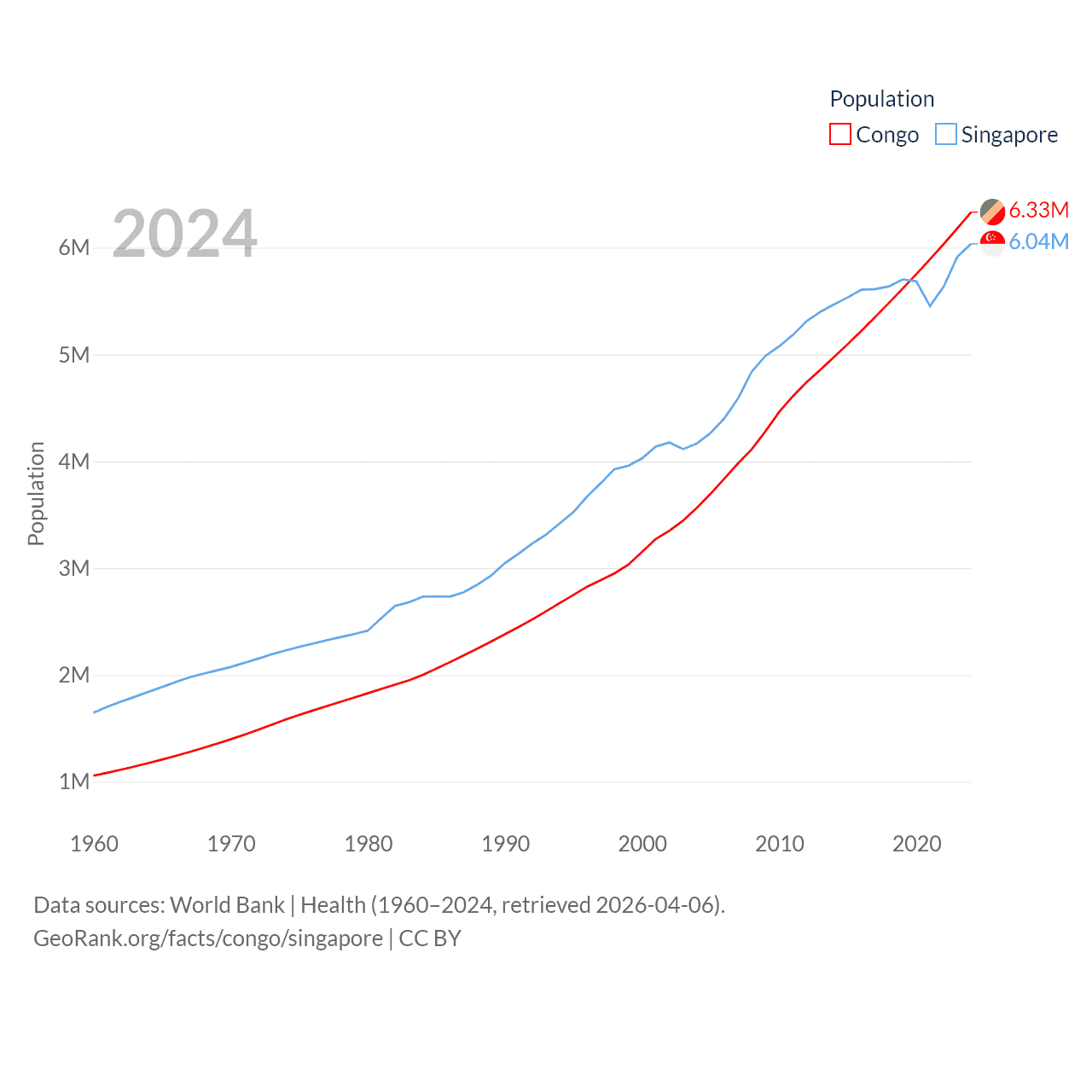 The Congo has a population of 6.33M (ranked 112/197), compared with 6.04M in Singapore (ranked 113/197). The Congo's land area is 131,854 sq mi versus 277.2 sq mi for Singapore (ranked 64th vs. 177th).