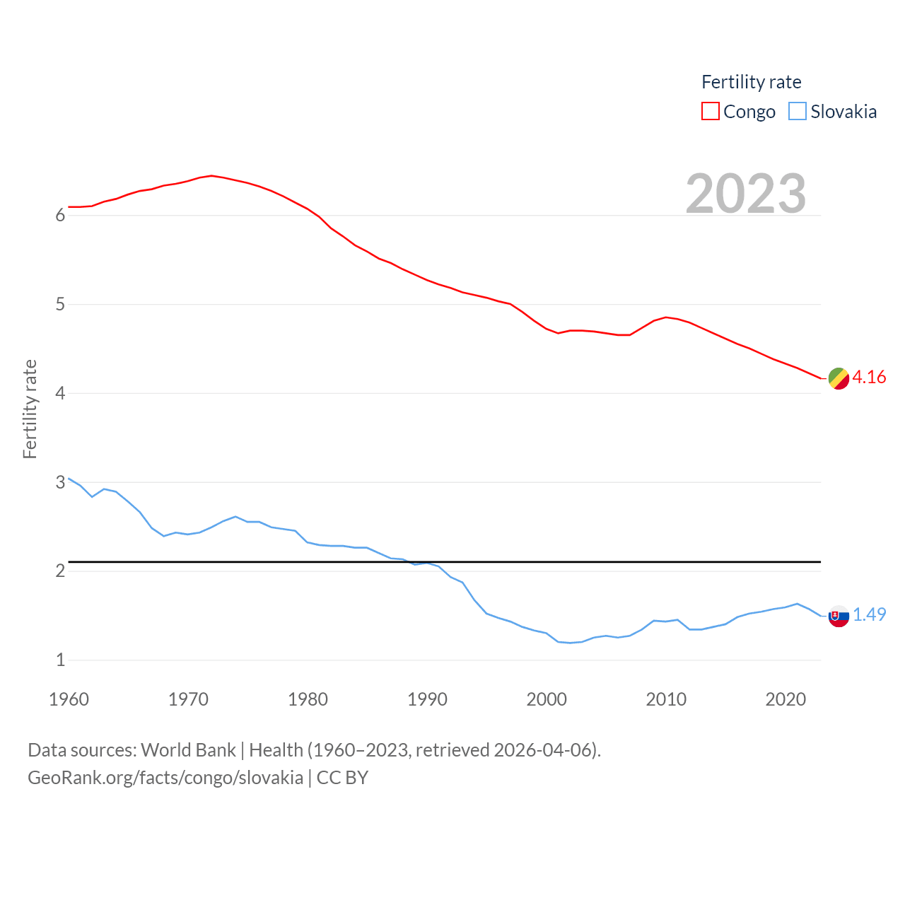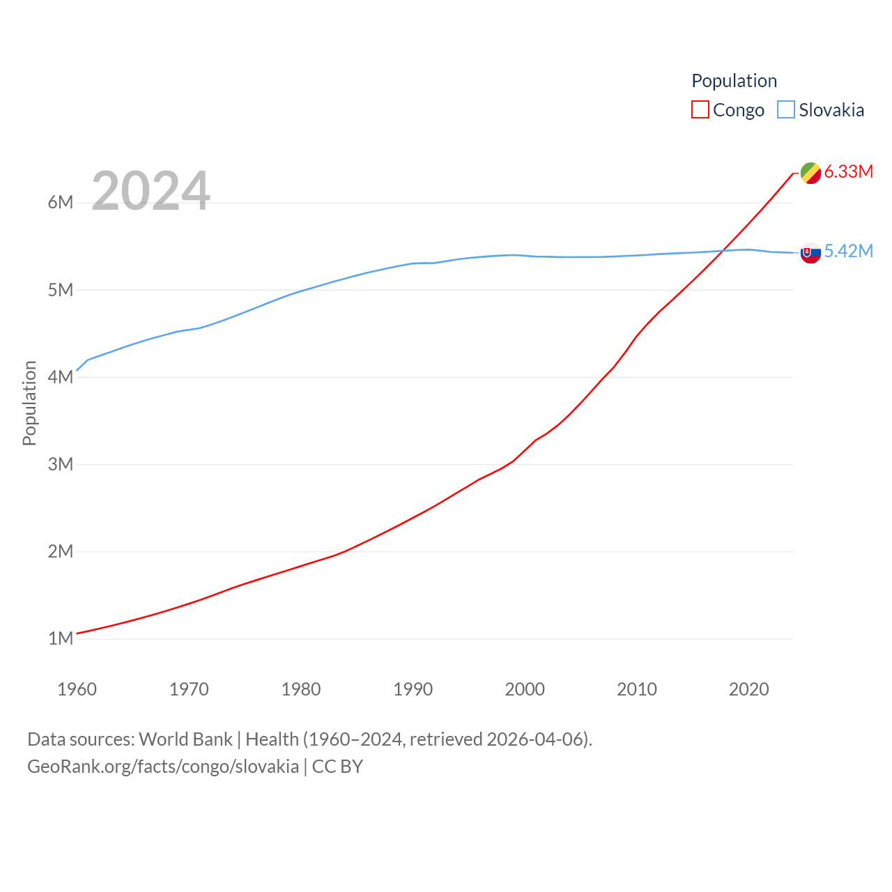 The Congo has a population of 6.33M (ranked 112/197), compared with 5.42M in Slovakia (ranked 119/197). The Congo's land area is 131,854 sq mi versus 18,564 sq mi for Slovakia (ranked 64th vs. 128th).